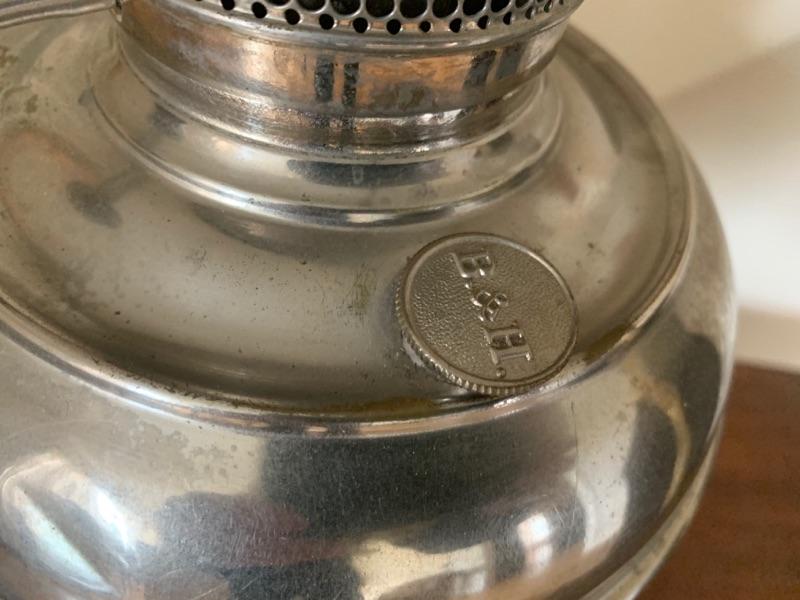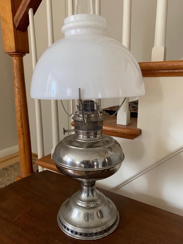 Antique Bradley & Hubbard silver-plated kerosene lantern, original burner with chimney and milk glass shade. good condition, small dent in sid , see photos (Table is sold separate)