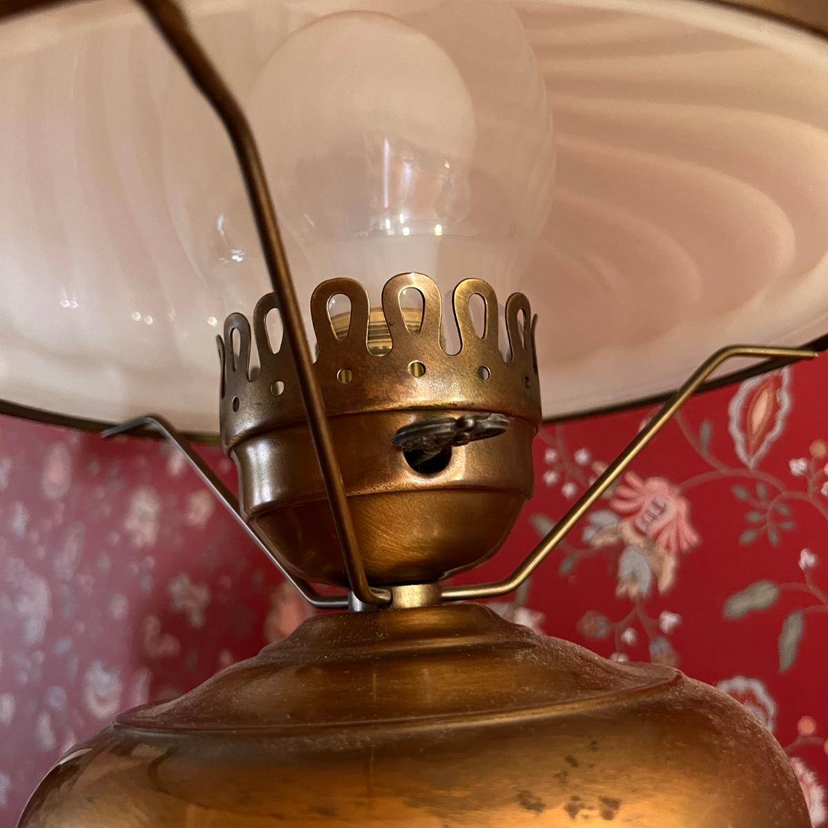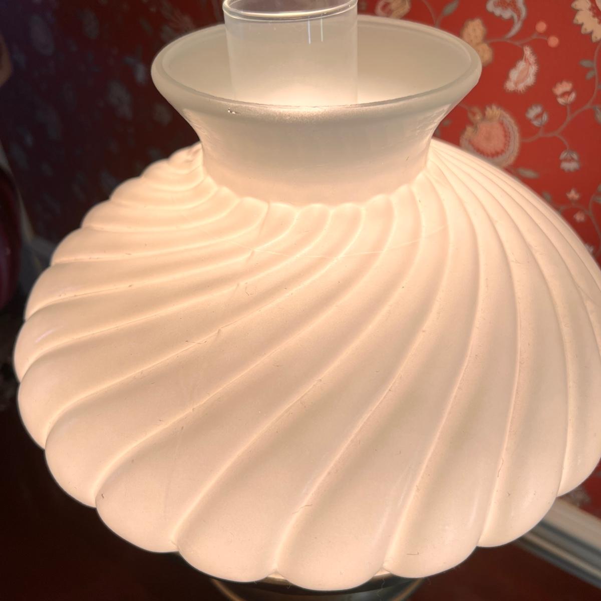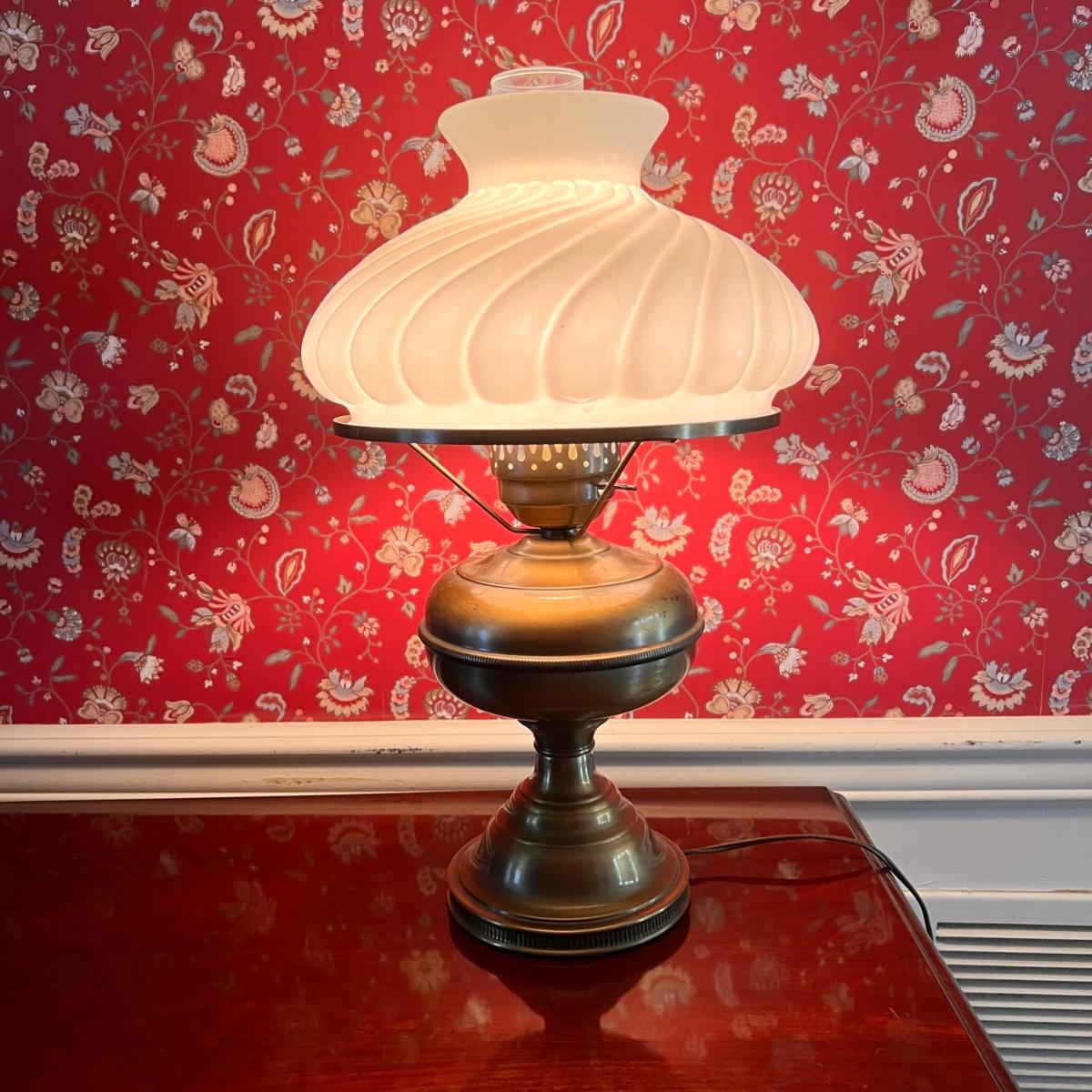 Brass electrified hurricane lamp with white swirled milk glass shade in great condition.