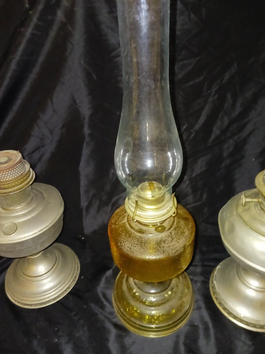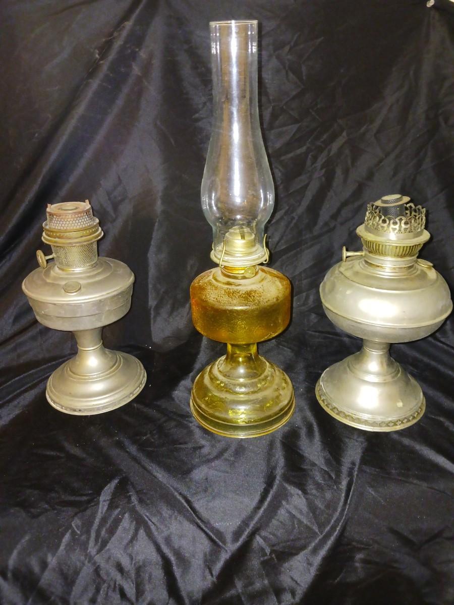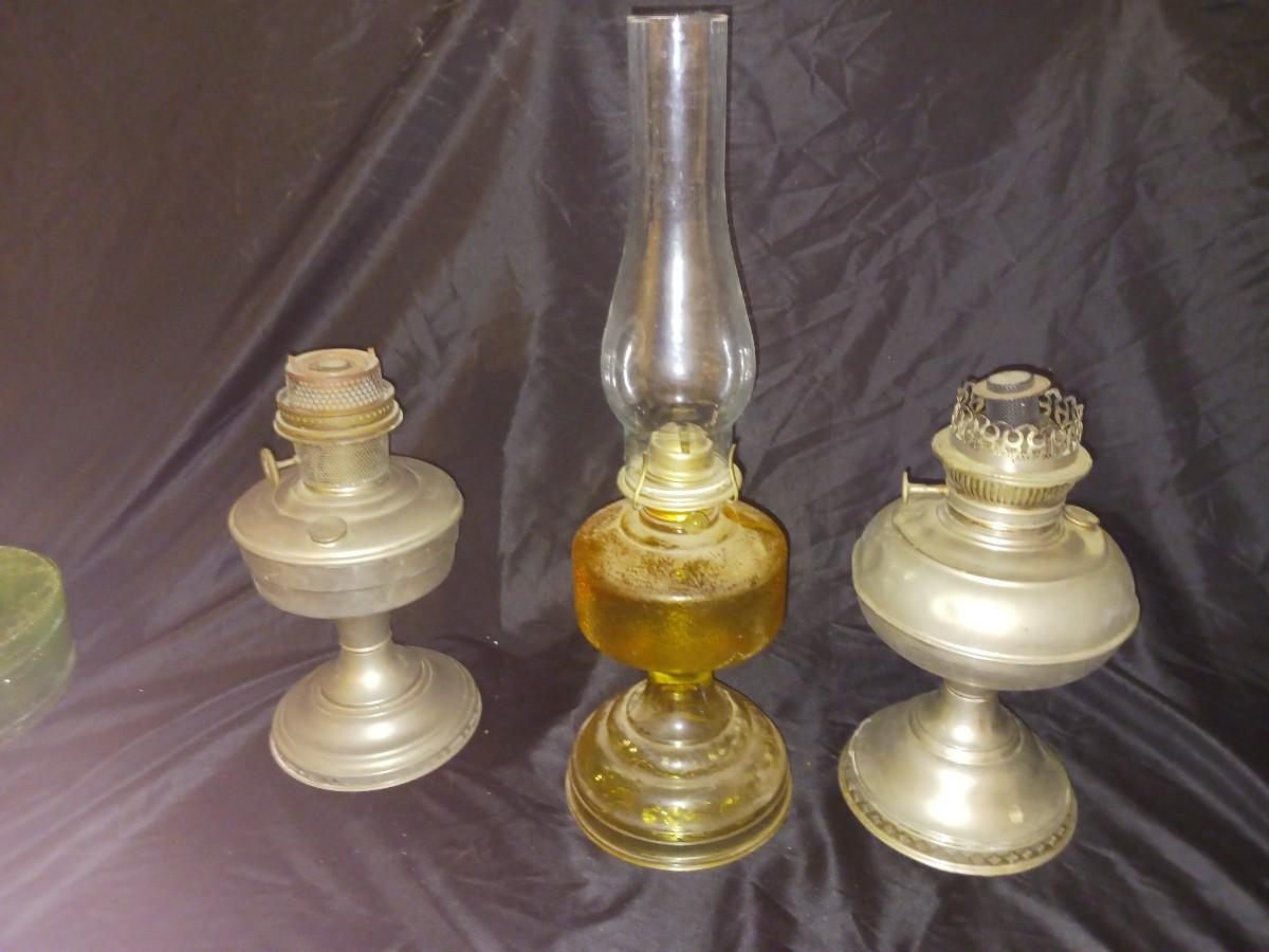 ONE GLASS OIL LAMP, TWO METAL OIL LAMPS
