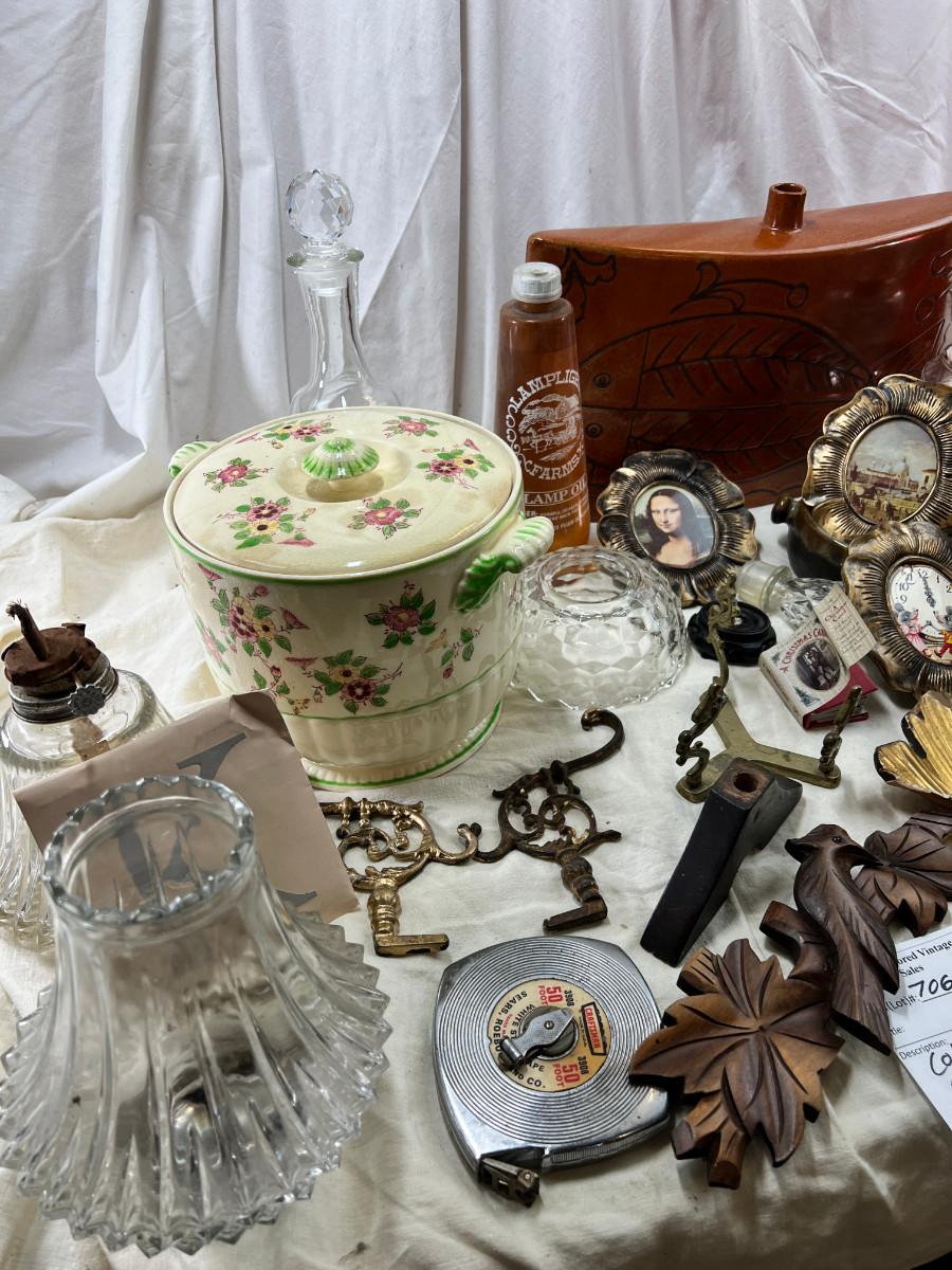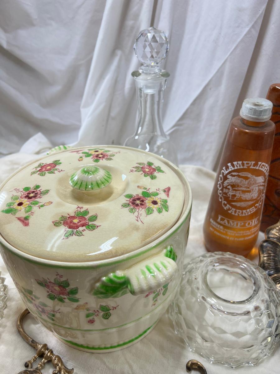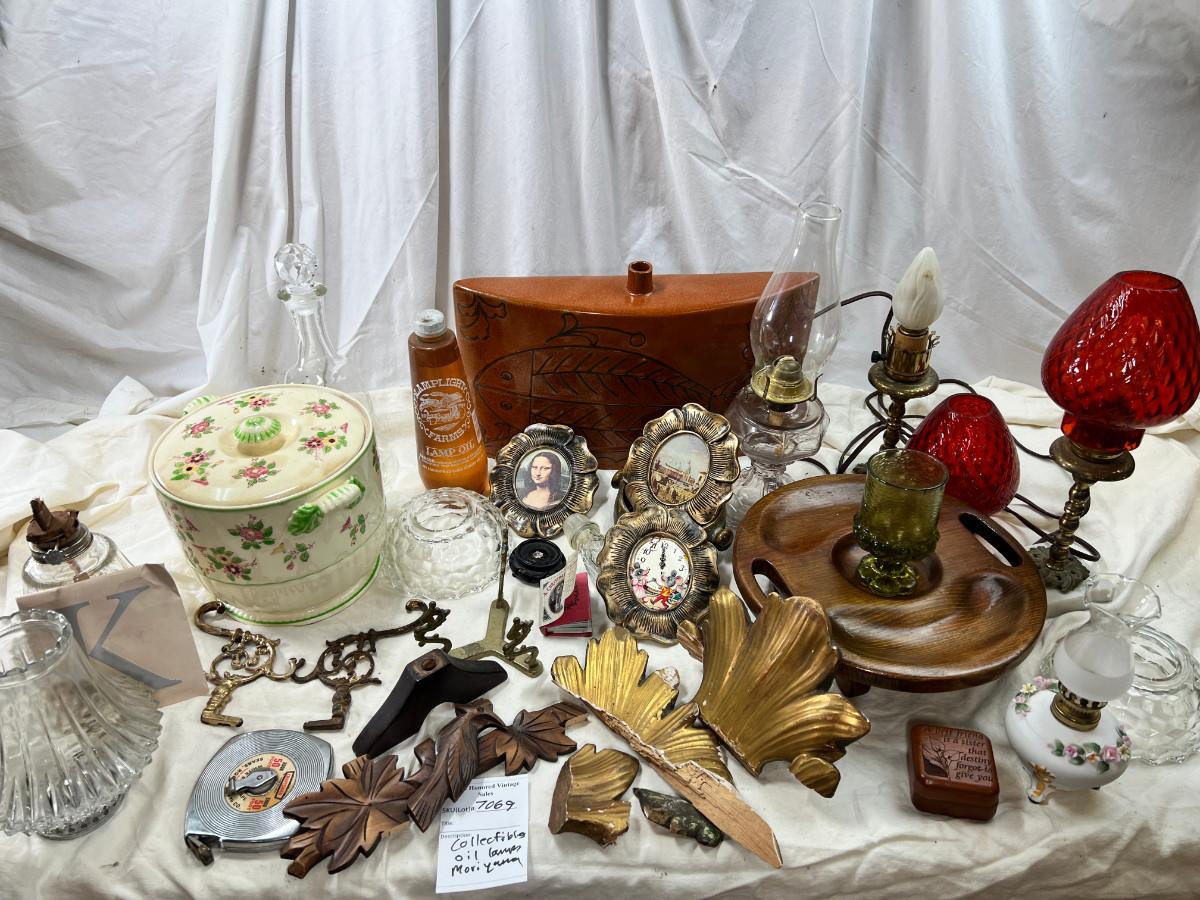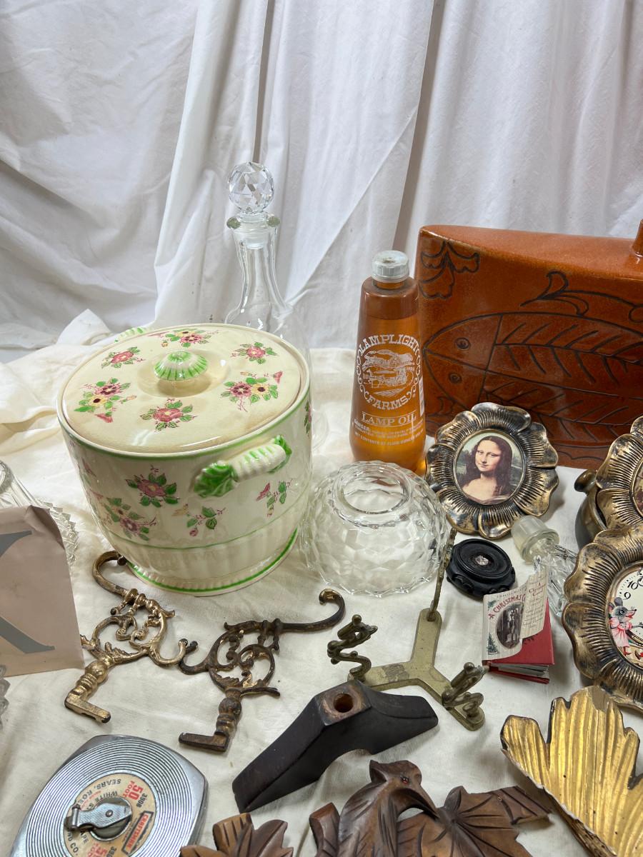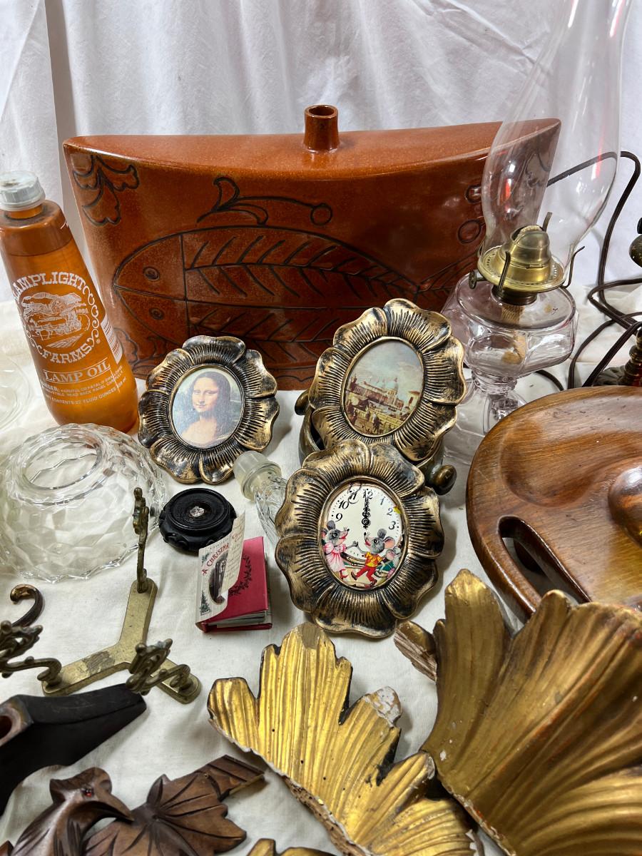large ceramic brown fish flower vase. Moriyama Japan cookie ceramic jar with lid ( some stain and slight crack) 2 electric lights, untested. A variety of old light globes and oil lamp parts. Wooden pieces, tape measure