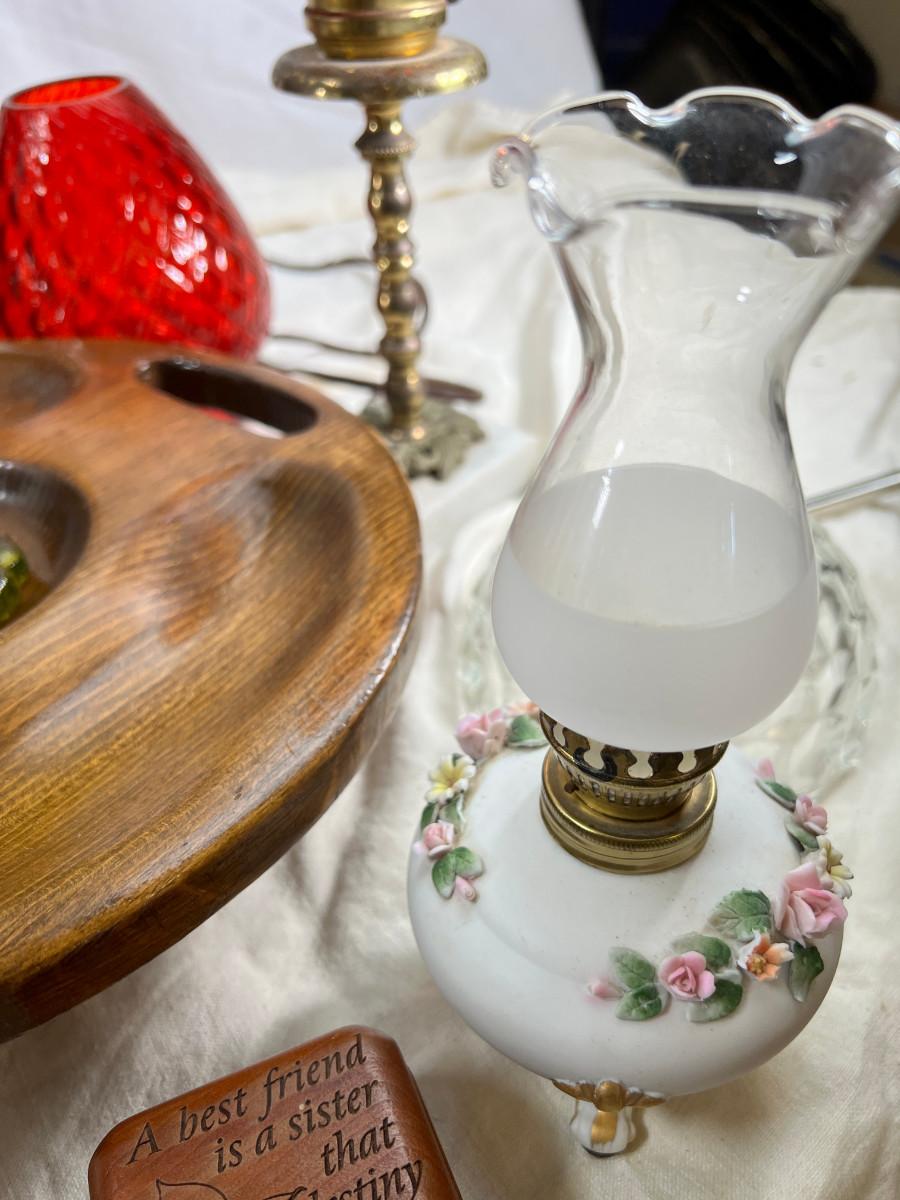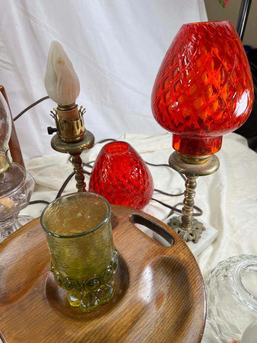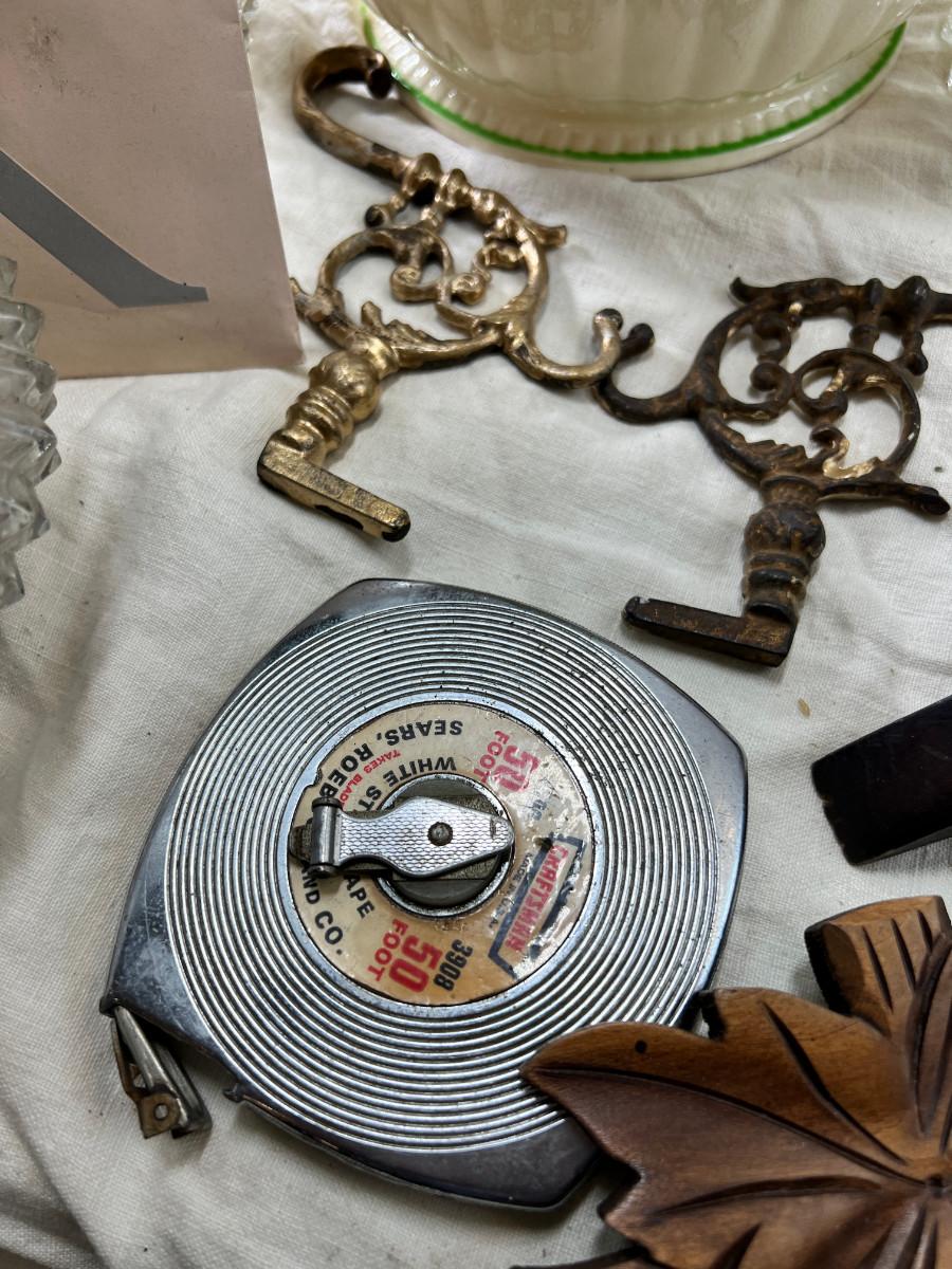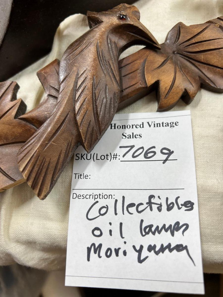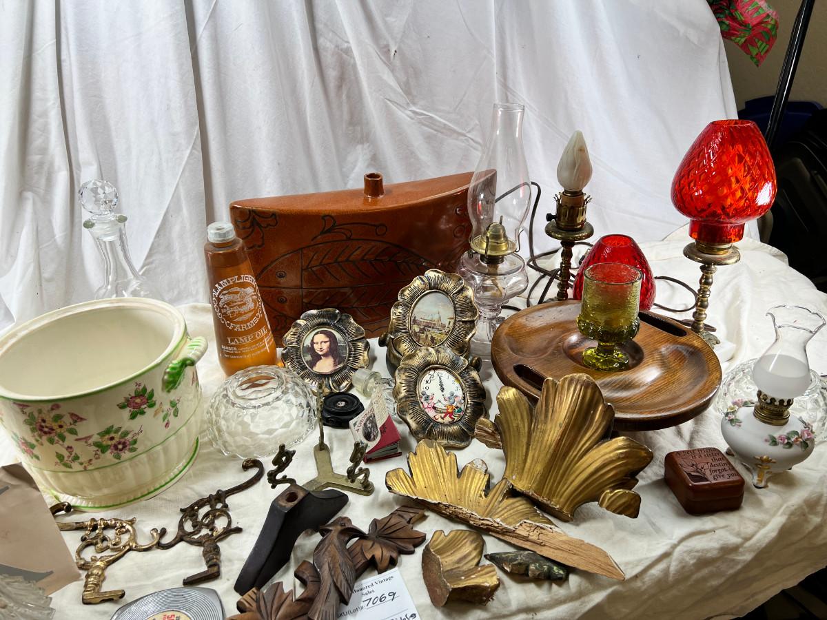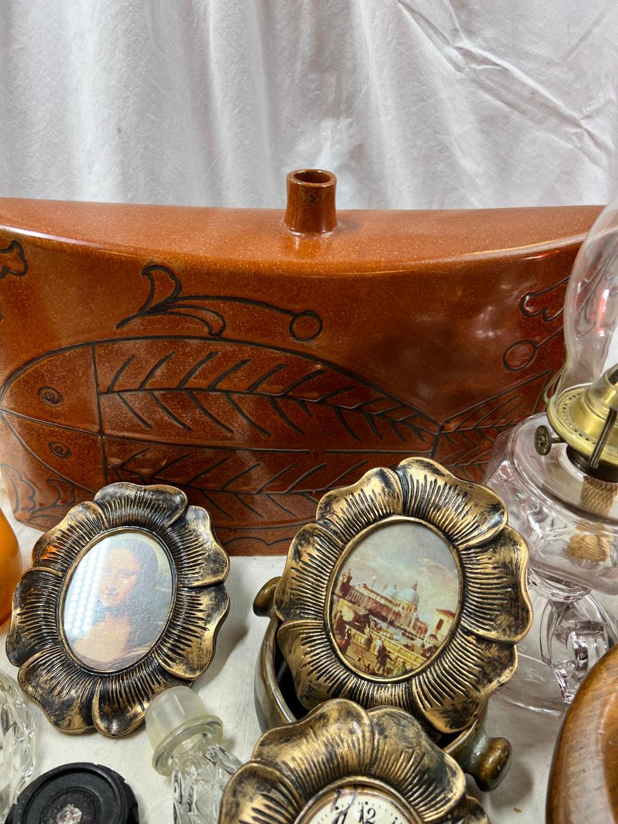 large ceramic brown fish flower vase. Moriyama Japan cookie ceramic jar with lid ( some stain and slight crack) 2 electric lights, untested. A variety of old light globes and oil lamp parts. Wooden pieces, tape measure