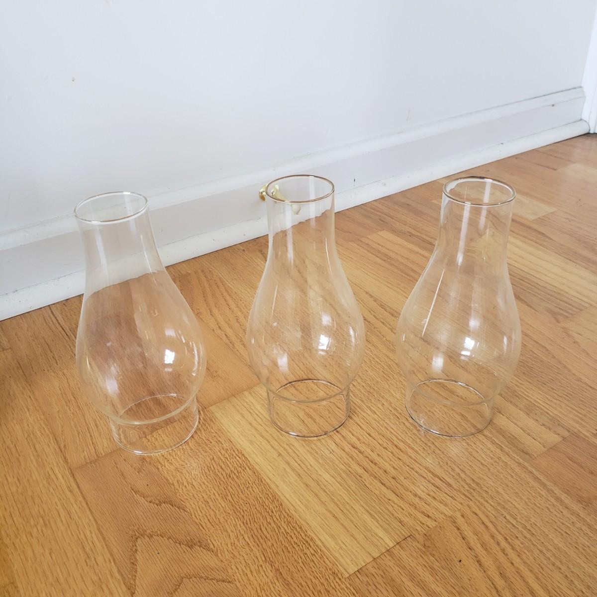 This lot has three oil lamps and three hurricane glasses (3" x 9"H) the oil lamp with a round glass measures 4" x 9"H. The clear glass lamp fits a hurricane glass on the top. The brass lamp from Alladin has some wear on the sides, see picture . There also is a nib bag of wicks.