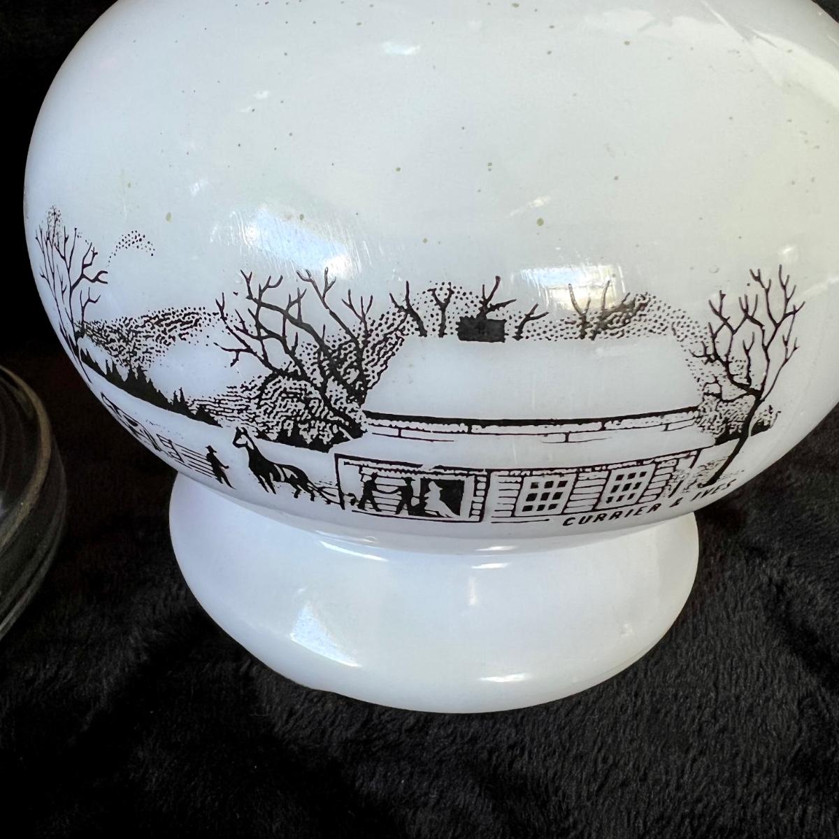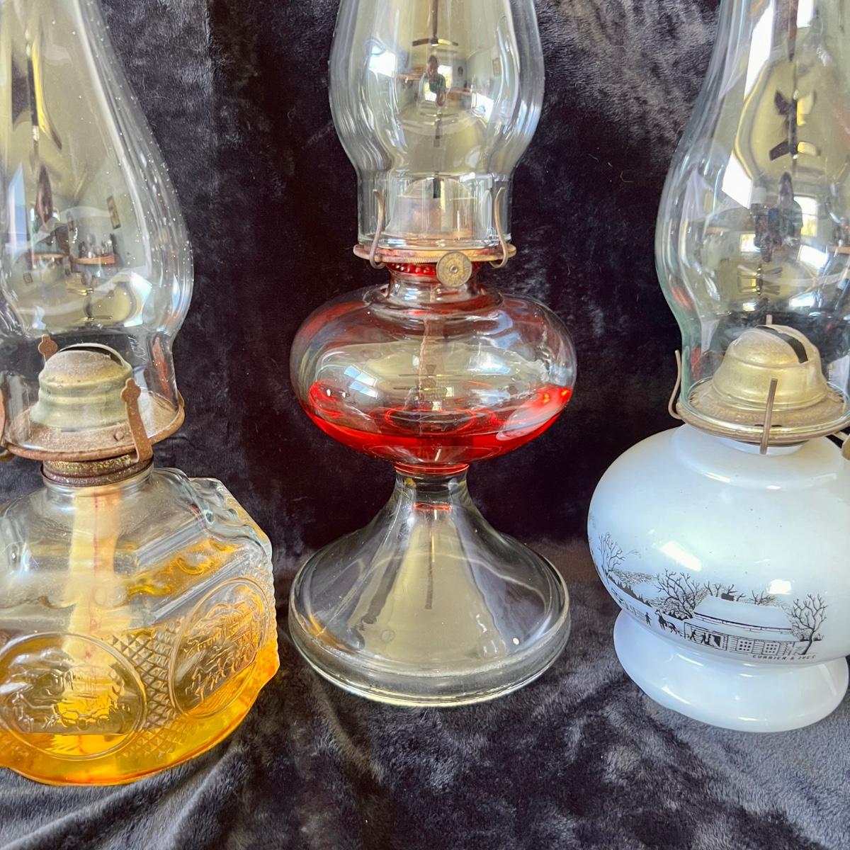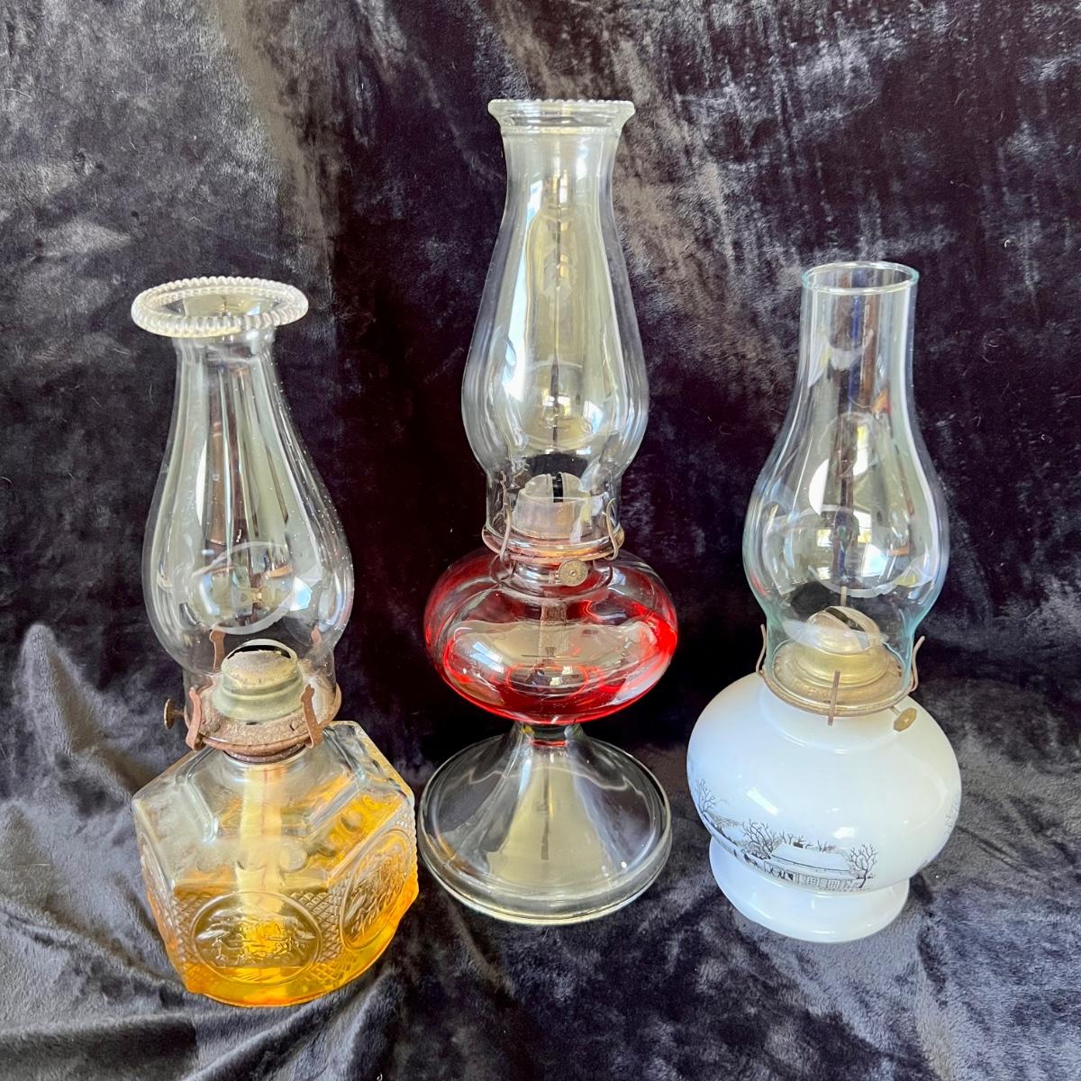 Collection of three oil lamps. Tallest meas. 17.5”h. Two shorter lamps have farm motif on bases.