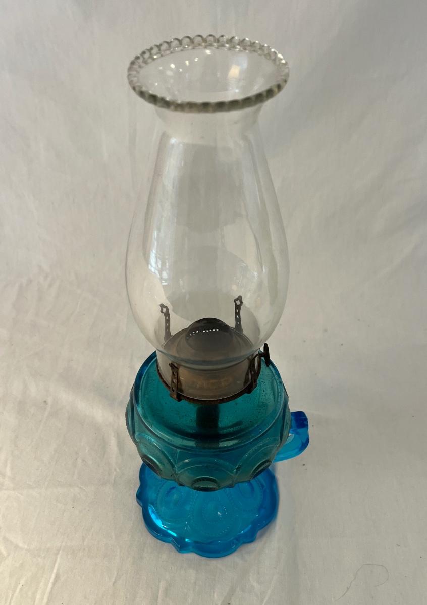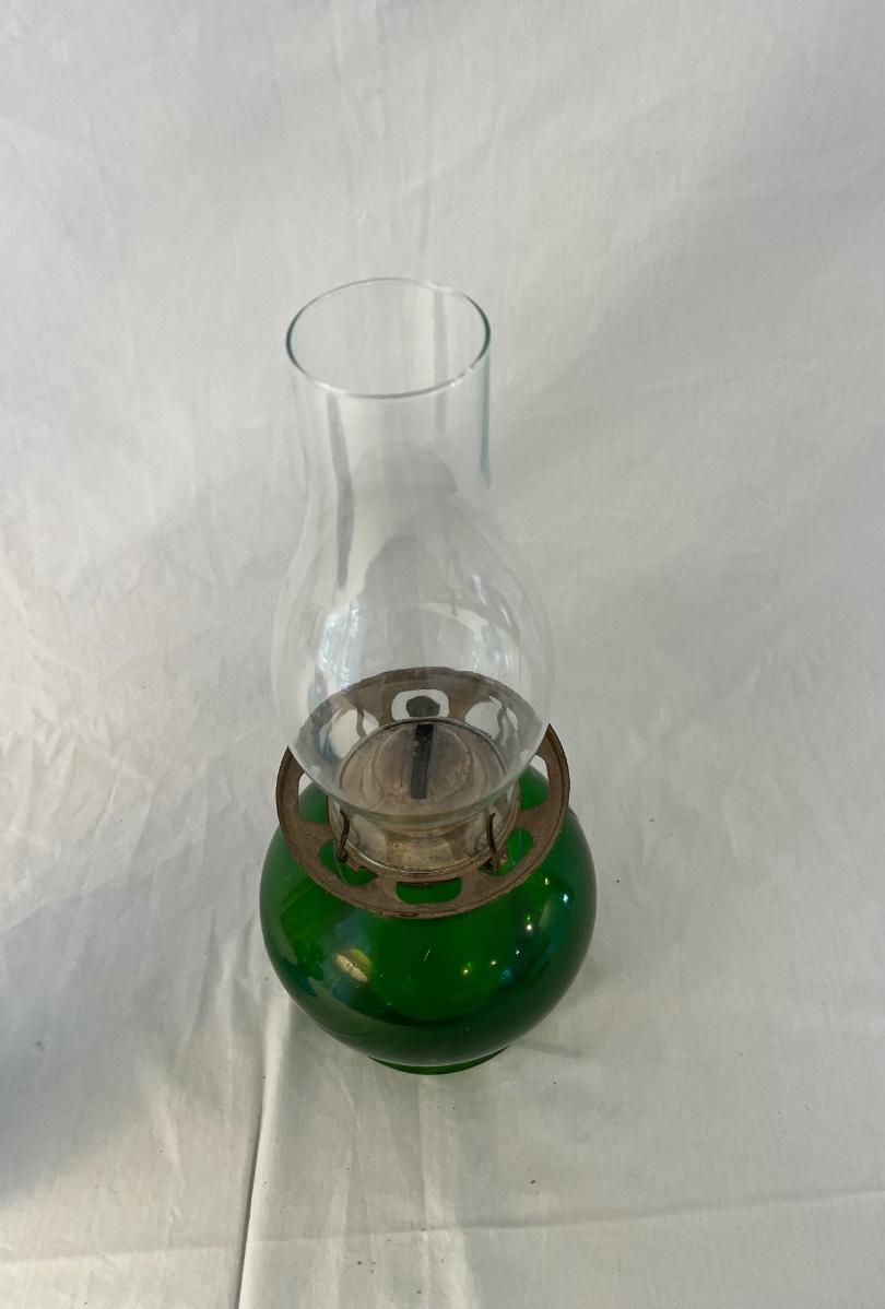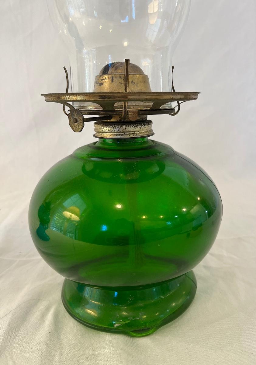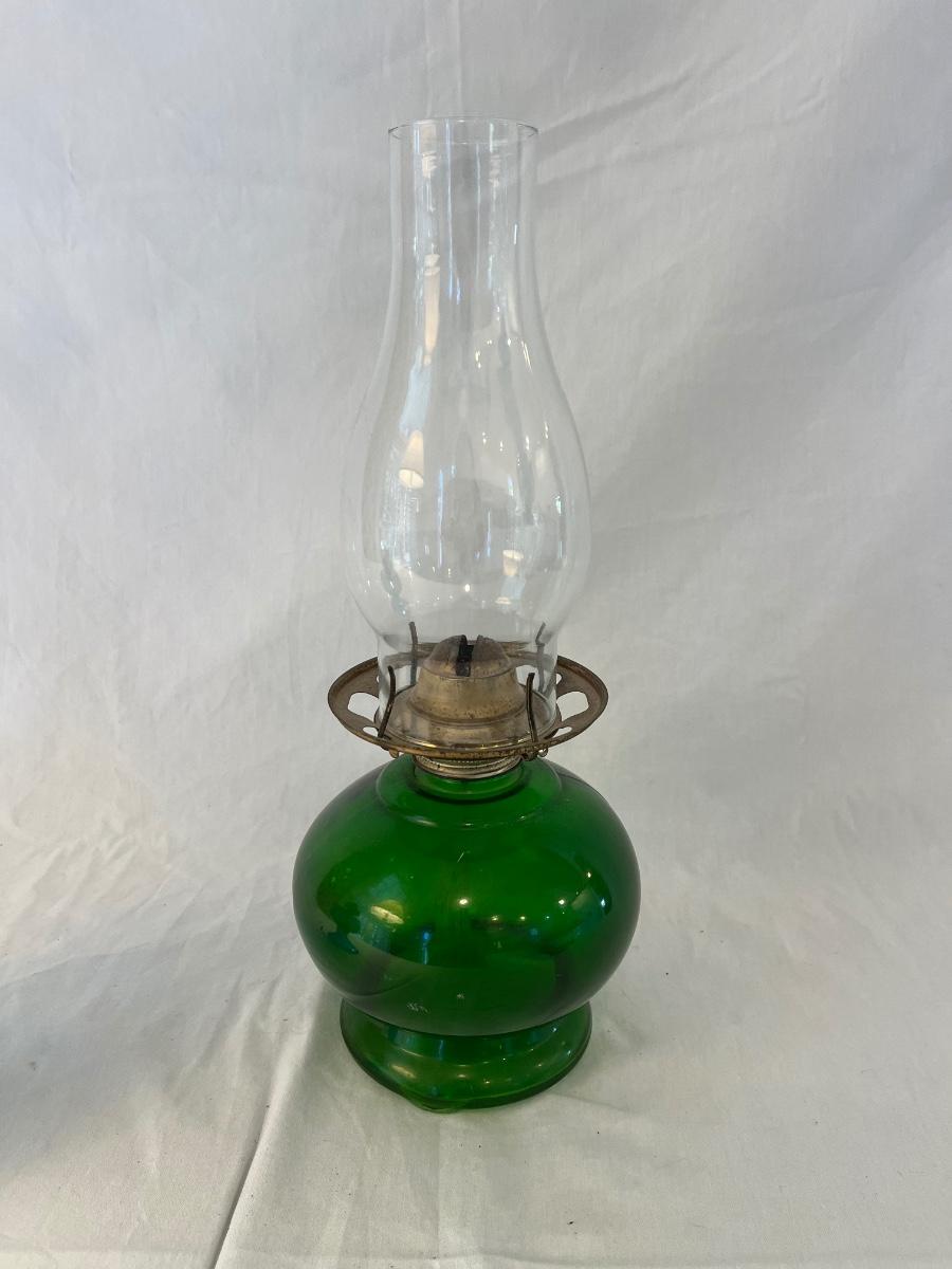 Two oil lamps with colored bases and removable clear glass lamp chimneys. The green based lamp is 6”D x 15”H and shows minor wear.