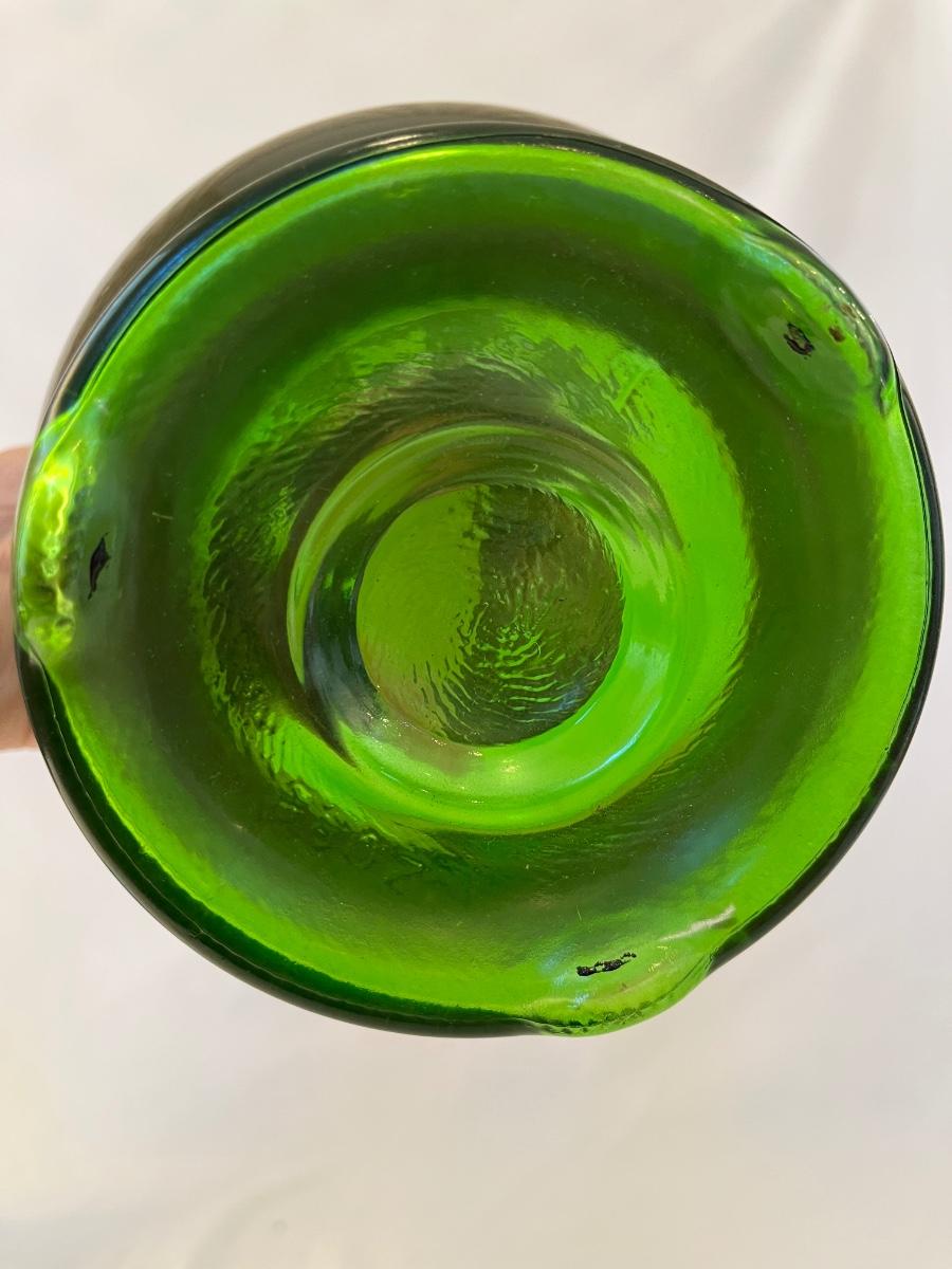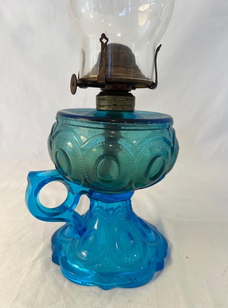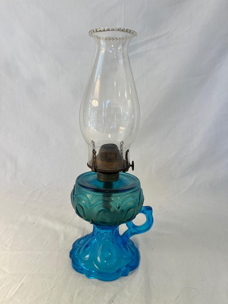 Two oil lamps with colored bases and removable clear glass lamp chimneys. The green based lamp is 6”D x 15”H and shows minor wear.