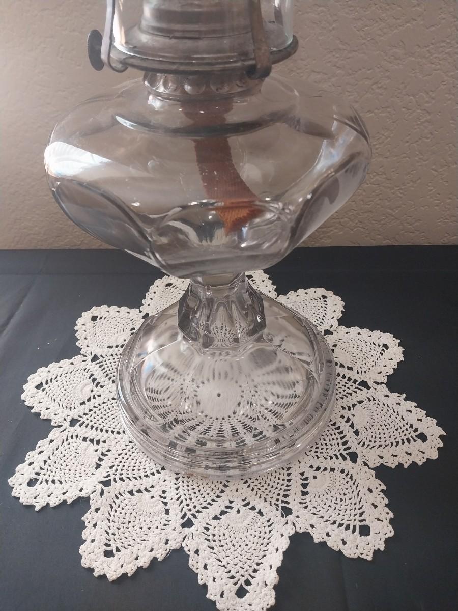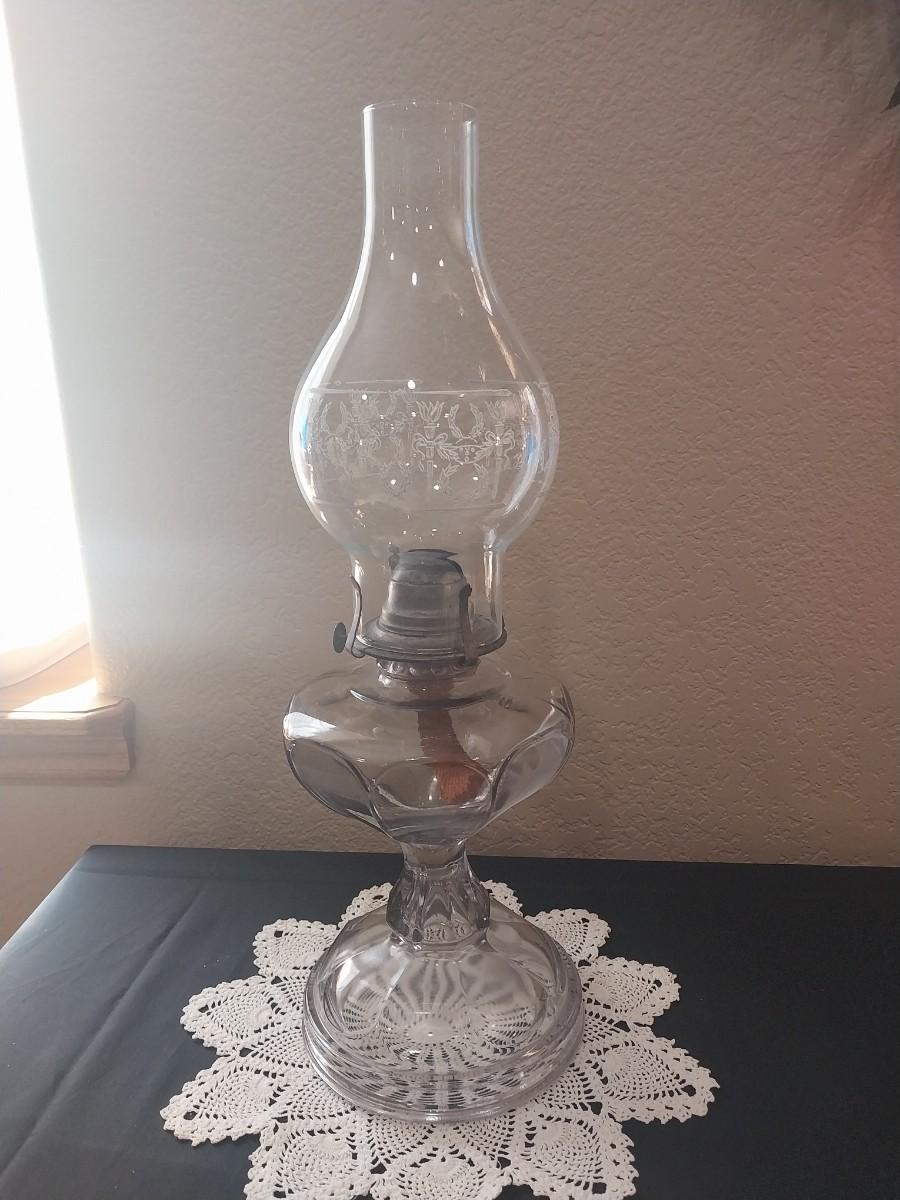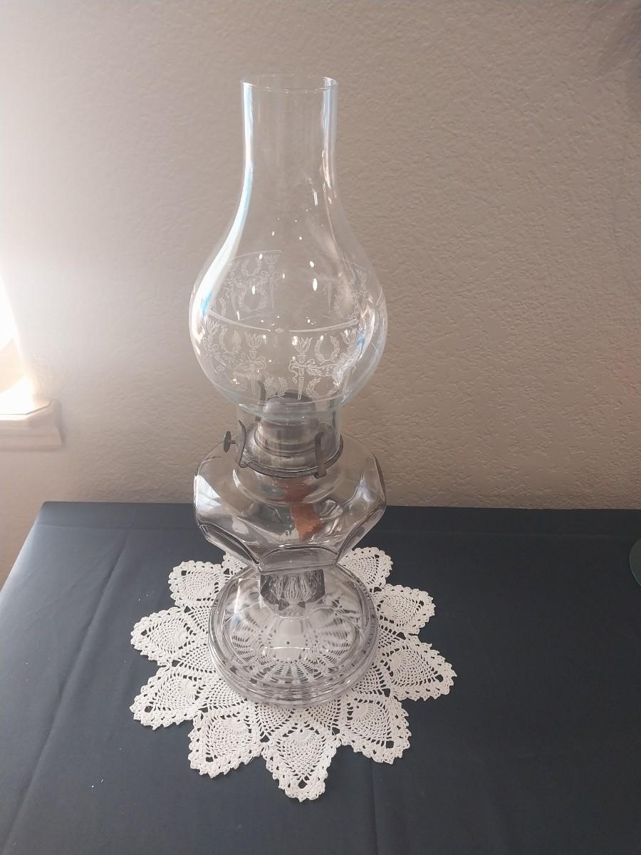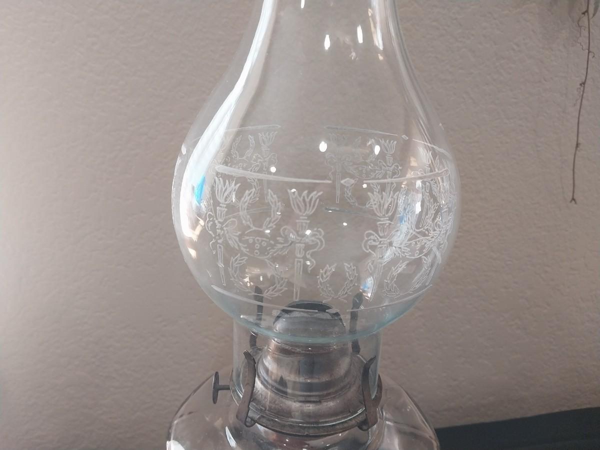 THE TOP PART OF LAMP HAS ETCHING IN GLASS