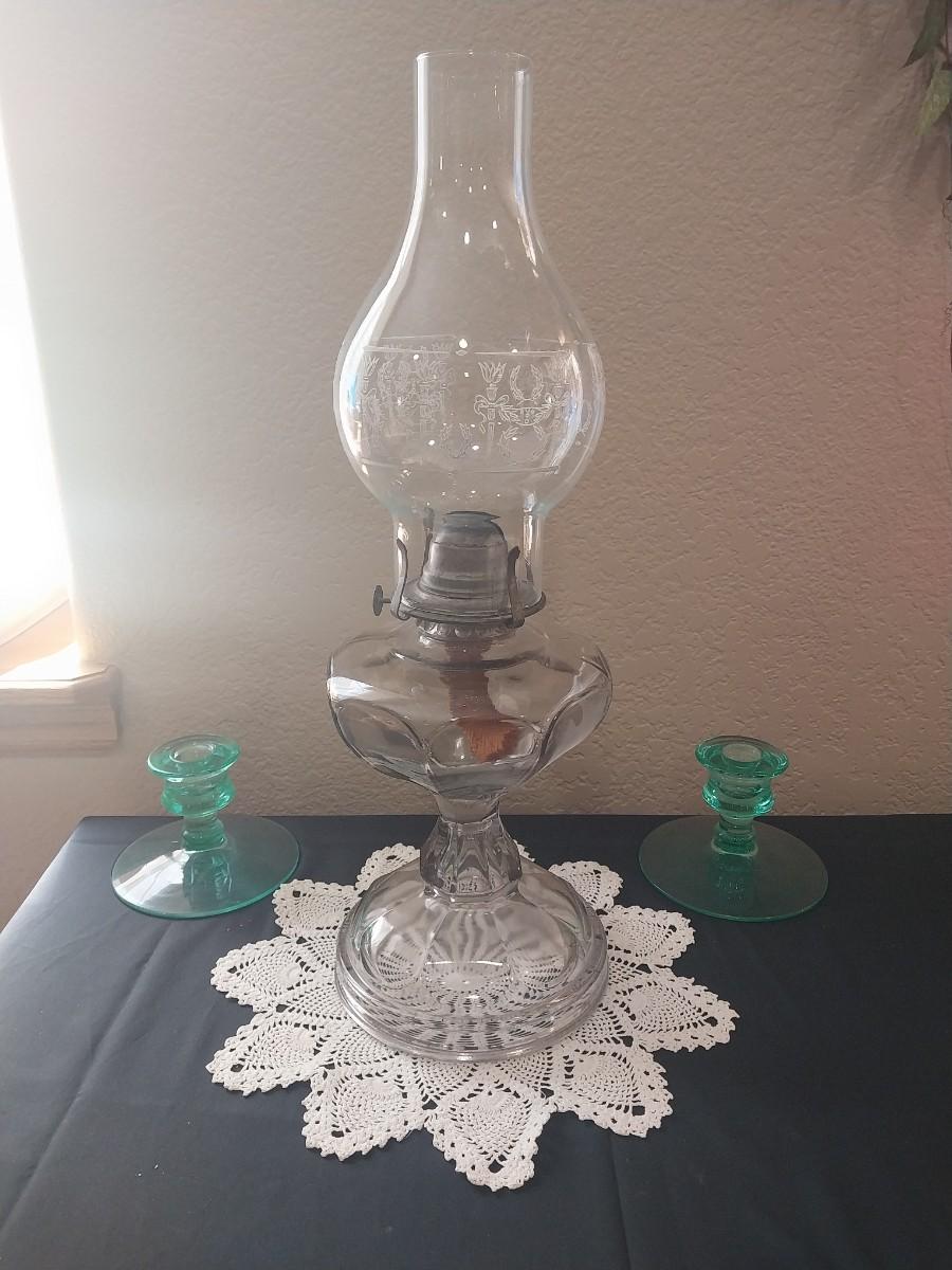 OIL LAMR AND GLASS CANDLESTICK HOLDERS