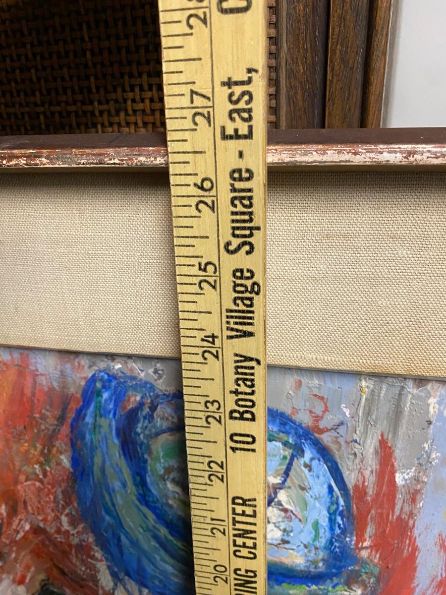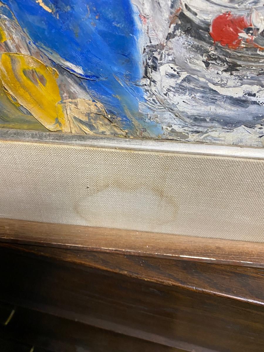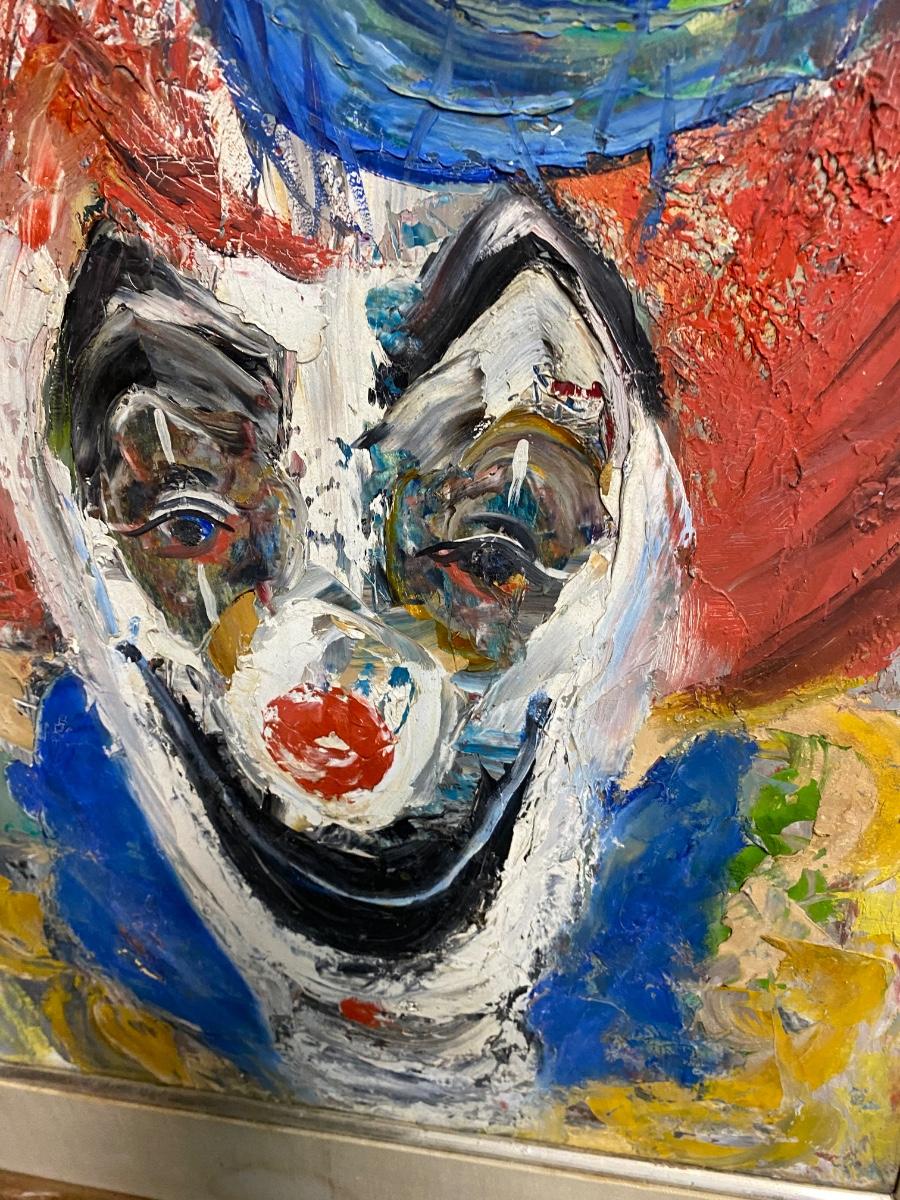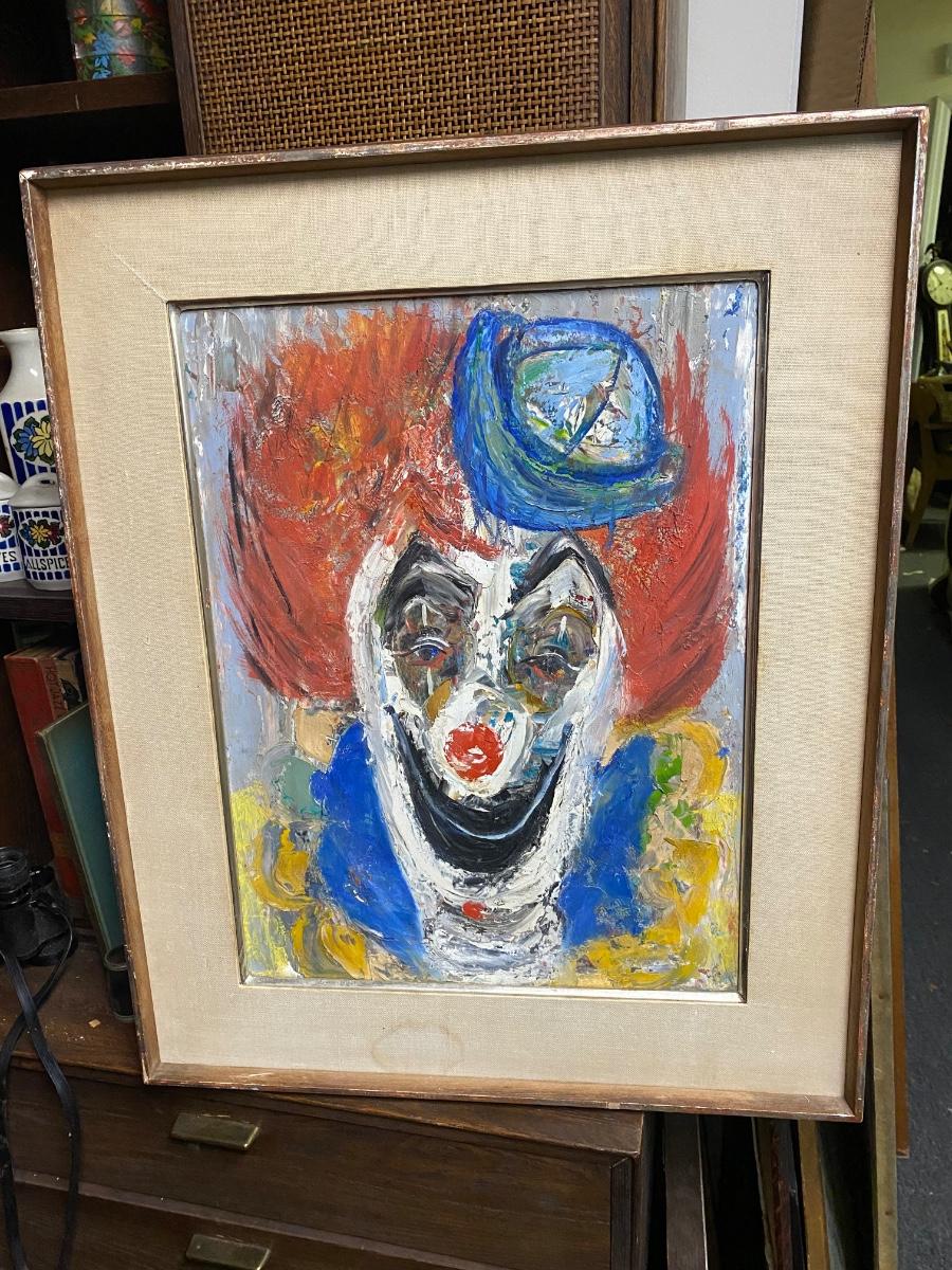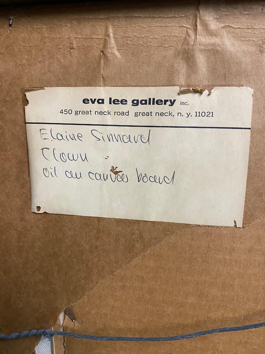 Framed and matted oil on board scary (is there any other kind?) clown. Not signed but has sticker 'Elaine Sinnard 'on back. Approx 22x26
