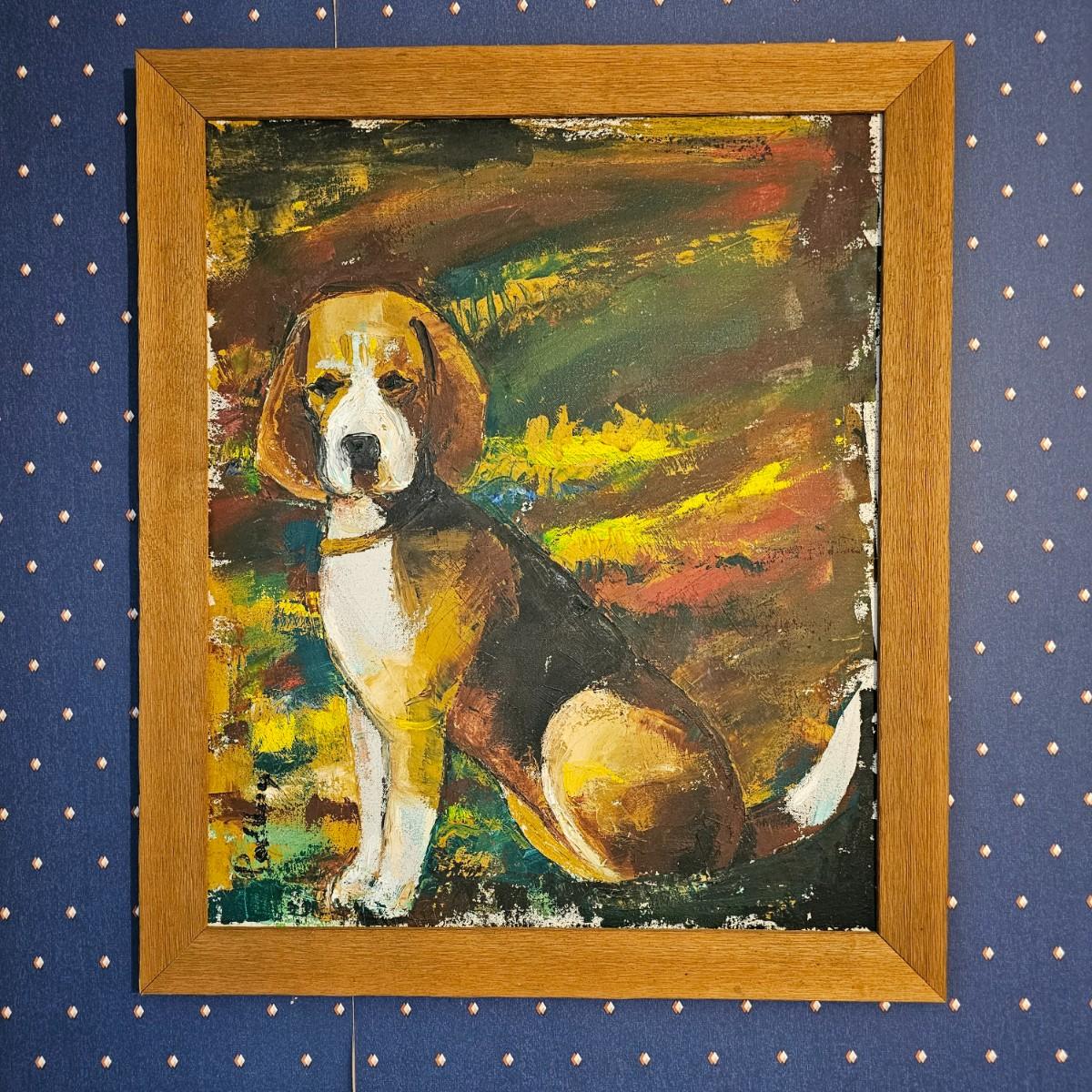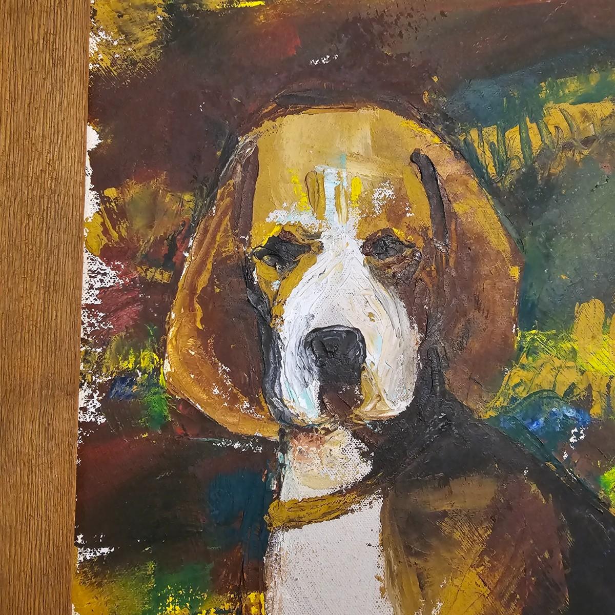 A portrait of a beagle against a fall color background. Oil painting in canvas, wood frame. Signature appears to be 'Puldey' or something similiar. Item measures 23.5" x 27.5"H. See photos for details. Shipping available. Shipping can be costly. We suggest contacting our preferred local shipping provider, Postage Express, with dimensions and getting an estimate before bidding: (828)-670-5501 or shipping@postageexpressnc.com.