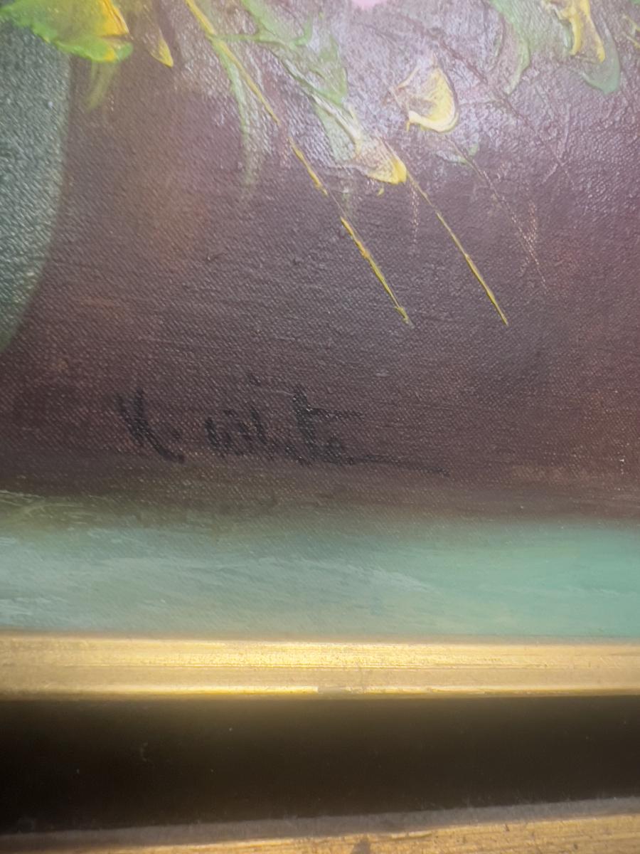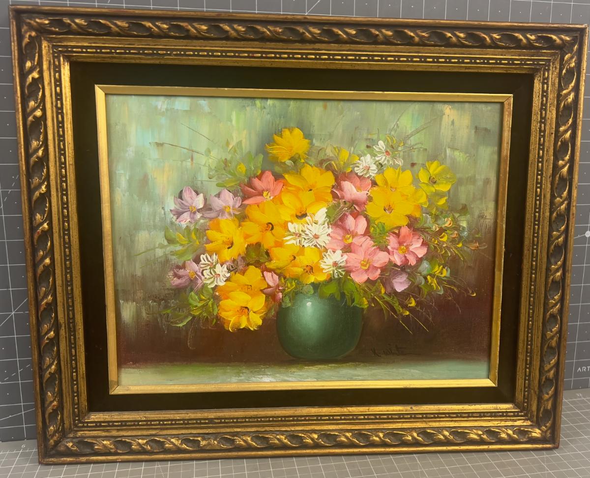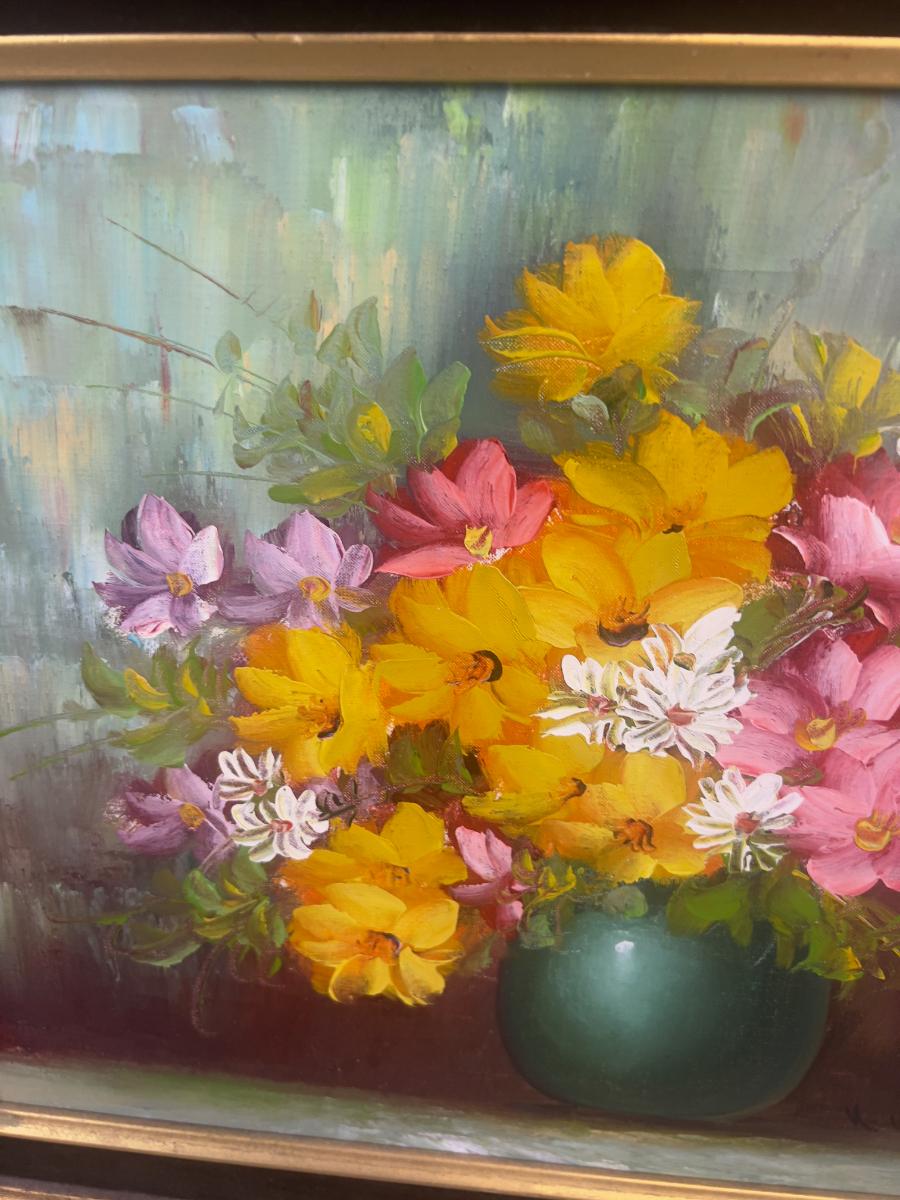 Oil on Canvas Flowers in a Vase by K. White; Colors- Yellow, Pink and Turquoise