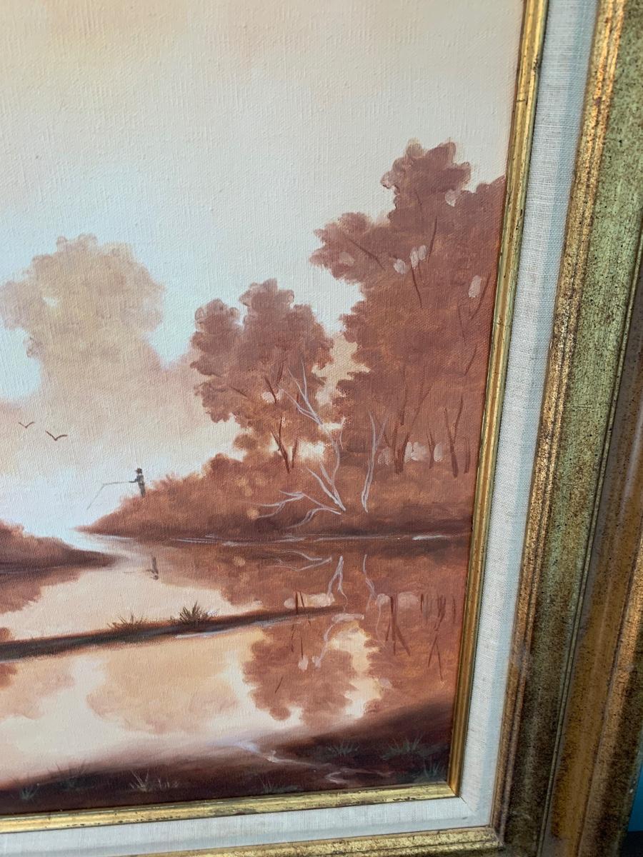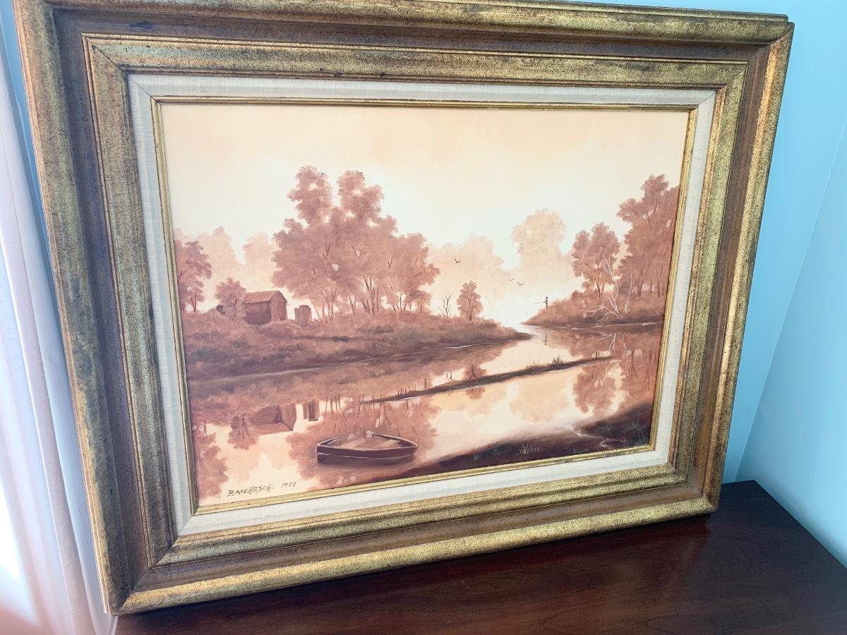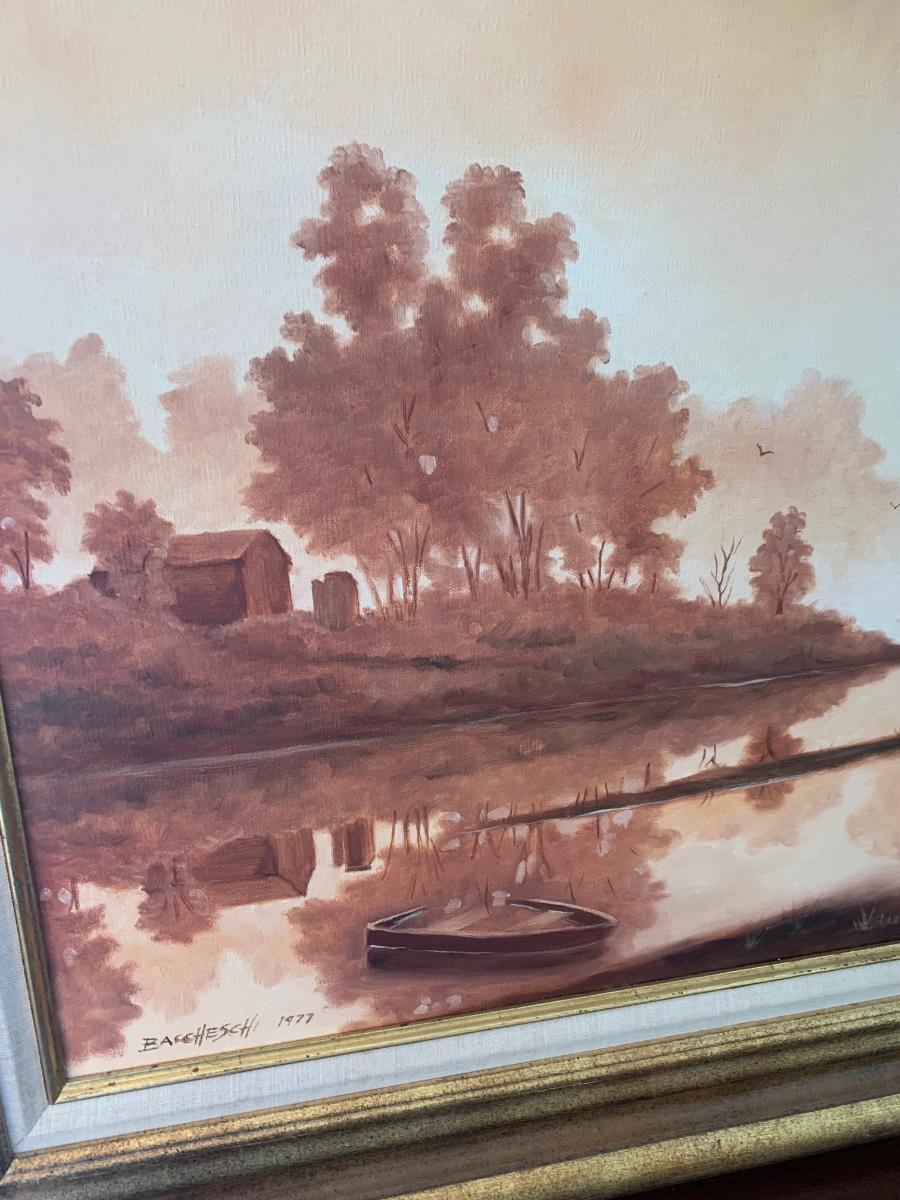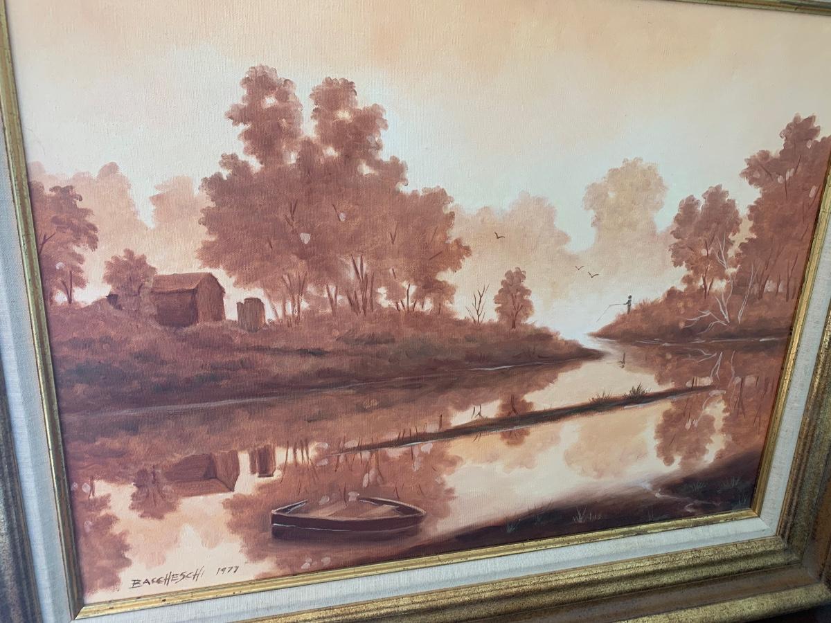 Signed Oil On Canvas Lake Scene Fishing Dennis Baccheschi 1977 Framed