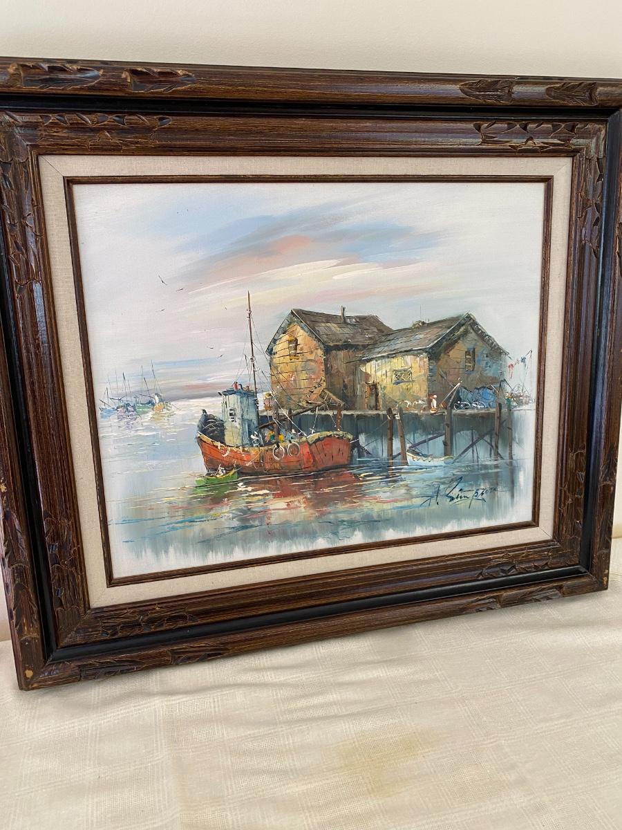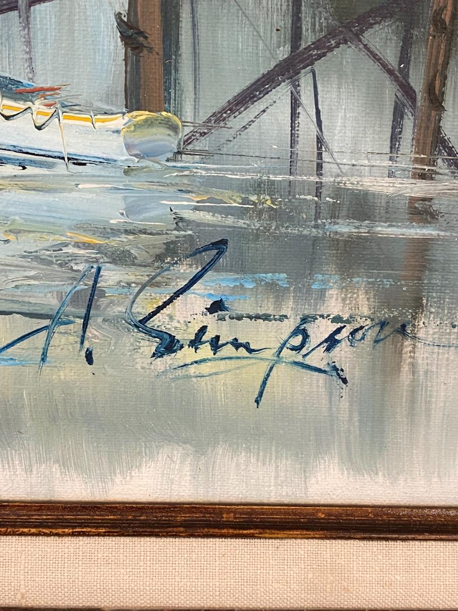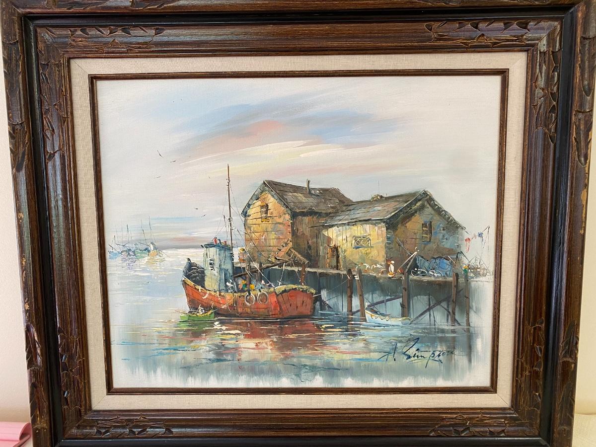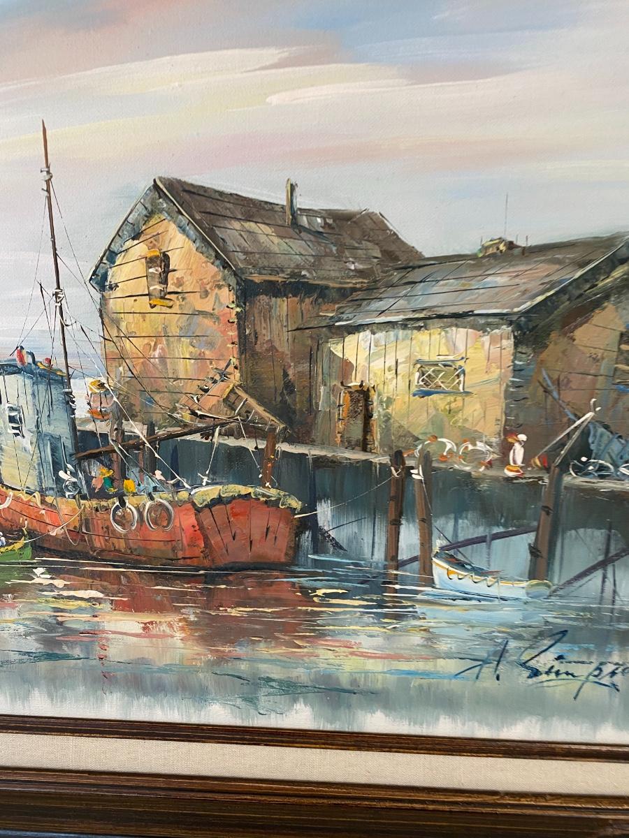 A mid century modern painting of a boat yard scene. The artist is likely to be Alan J Simpson. Measures 24 x 28” framed and 13 x 16” site. If shipped, then this item will be packed and shipped by UPS at the cost to the buyer.