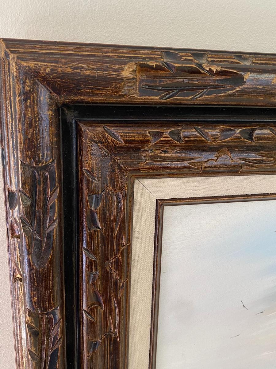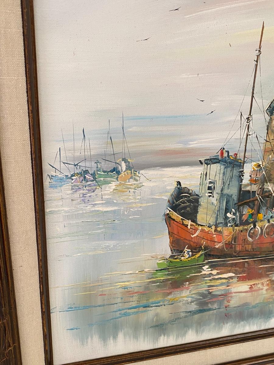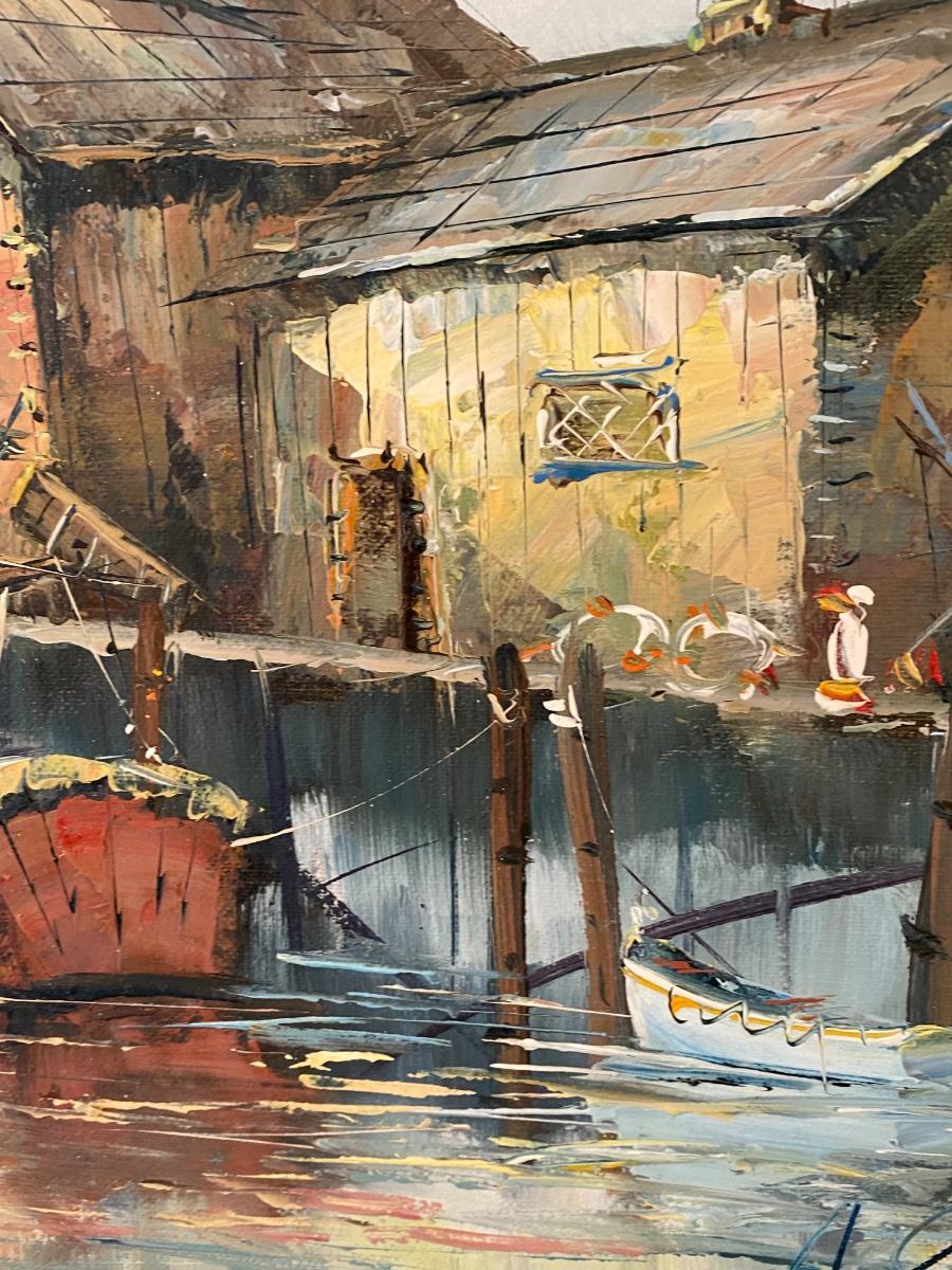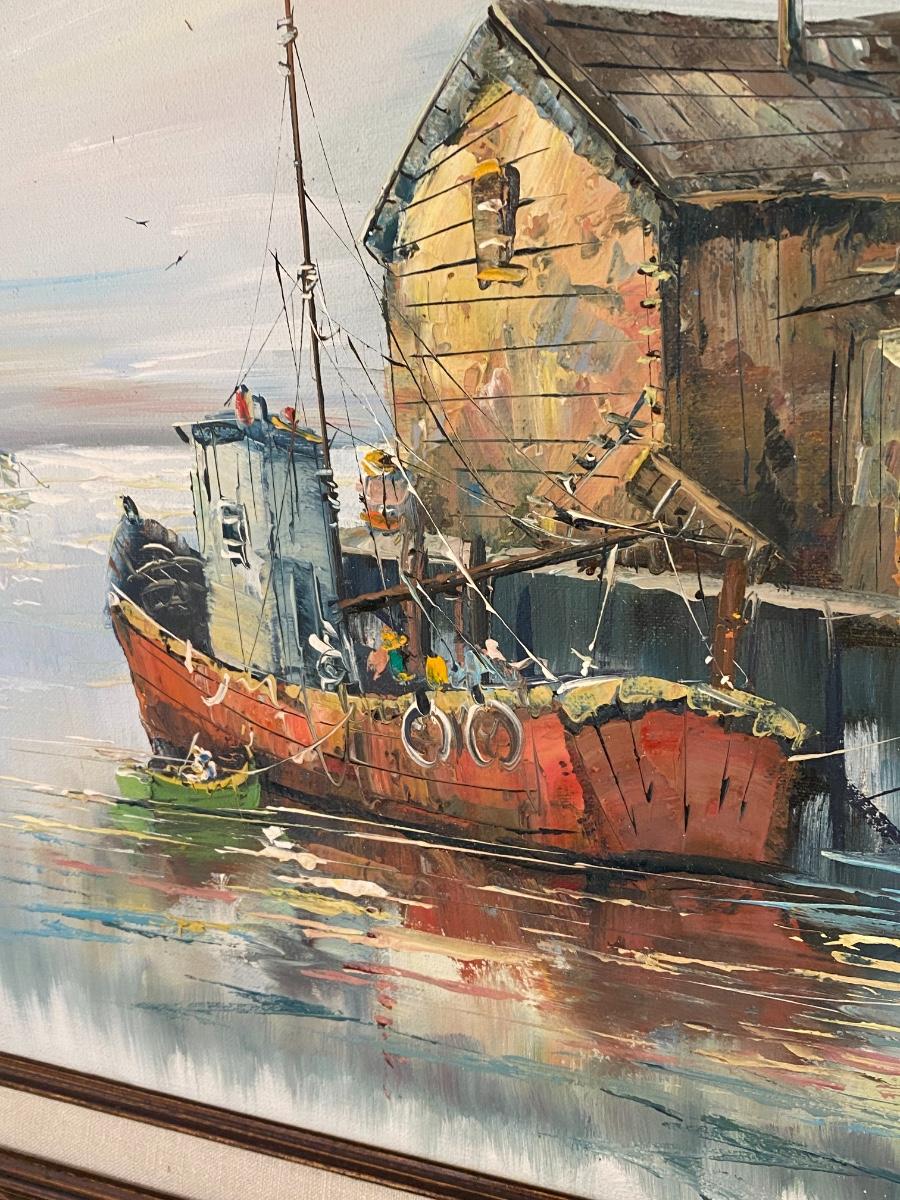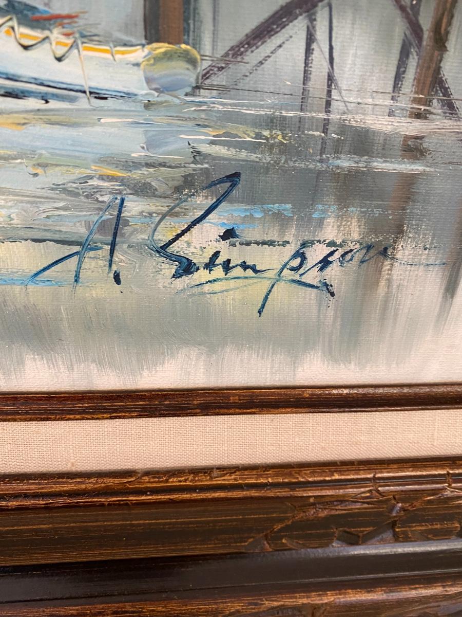 A mid century modern painting of a boat yard scene. The artist is likely to be Alan J Simpson. Measures 24 x 28” framed and 13 x 16” site. If shipped, then this item will be packed and shipped by UPS at the cost to the buyer.