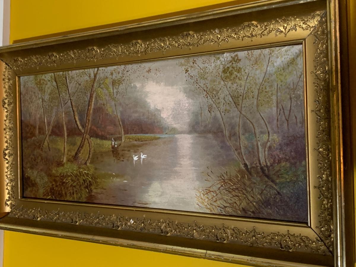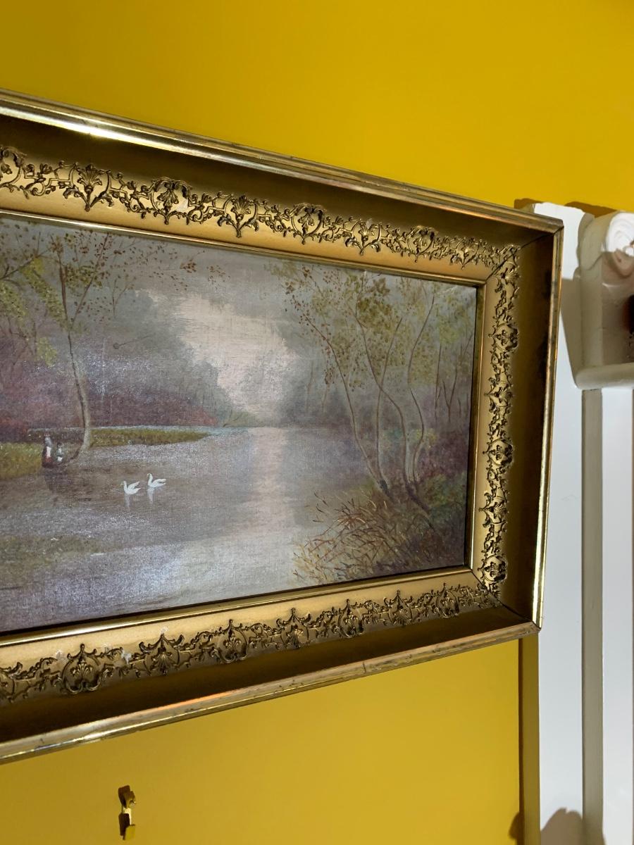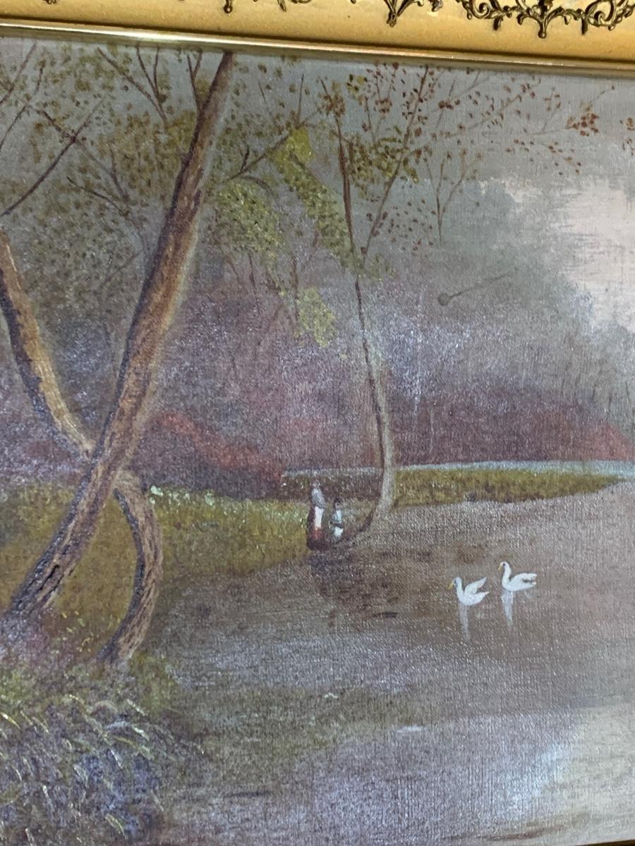 Oil On Canvas Swans On Lake Gold Gilt Frame Landscape