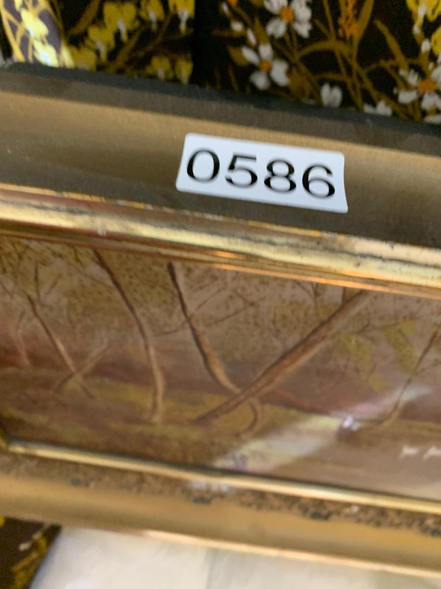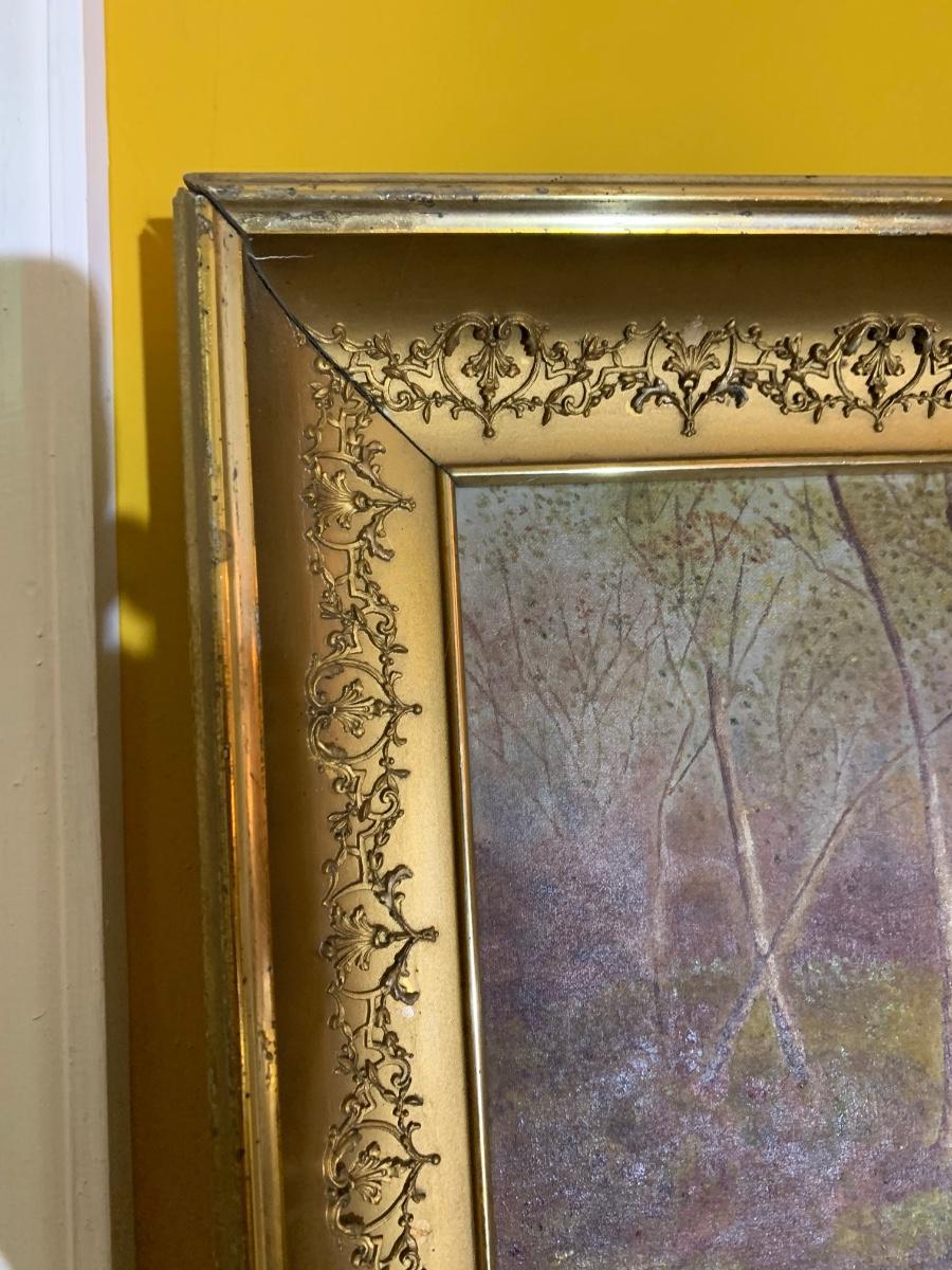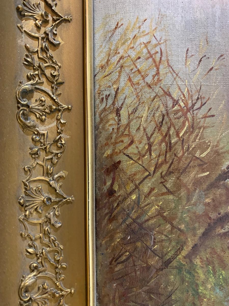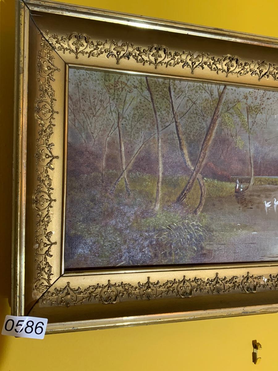 Oil On Canvas Swans On Lake Gold Gilt Frame Landscape
