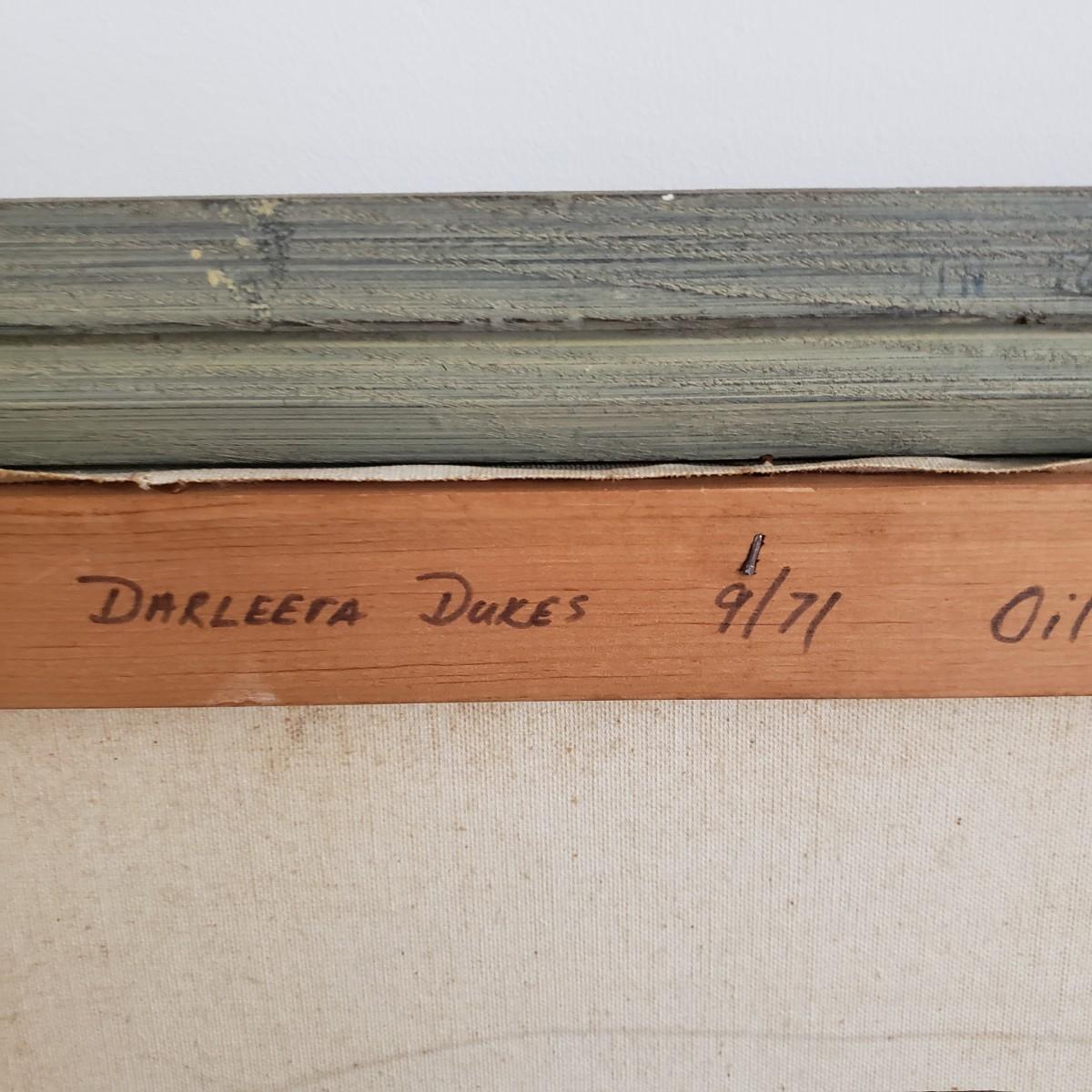This oil painting of a wooded pond scene with a dock is by Darlene Dukes. The wooden frame, without glass, measures 22" x 28". The sticker on the back says it was "painted by a friend in Saluda, NC.