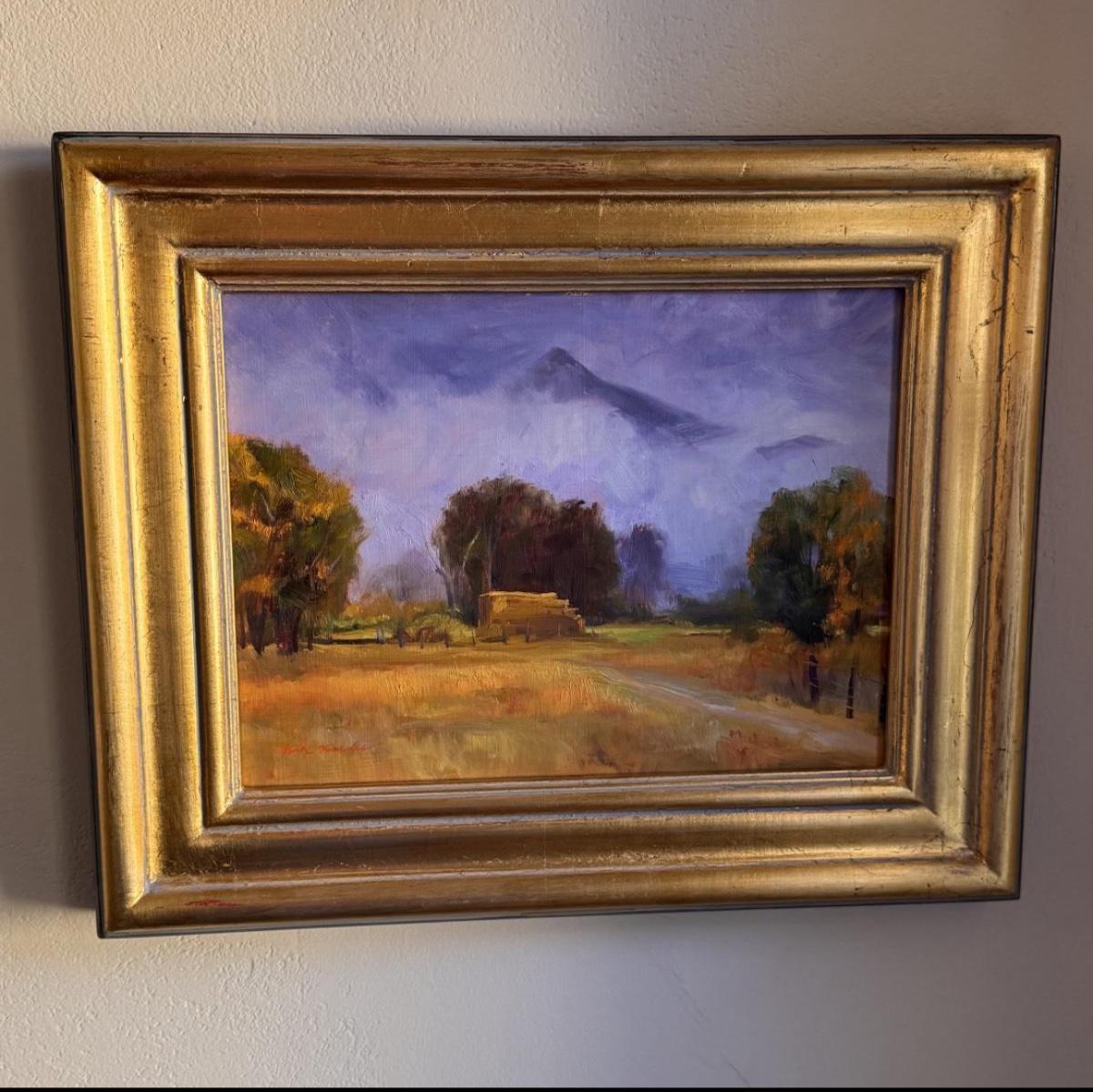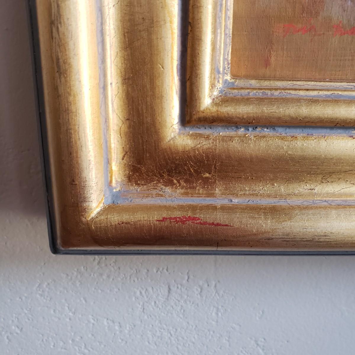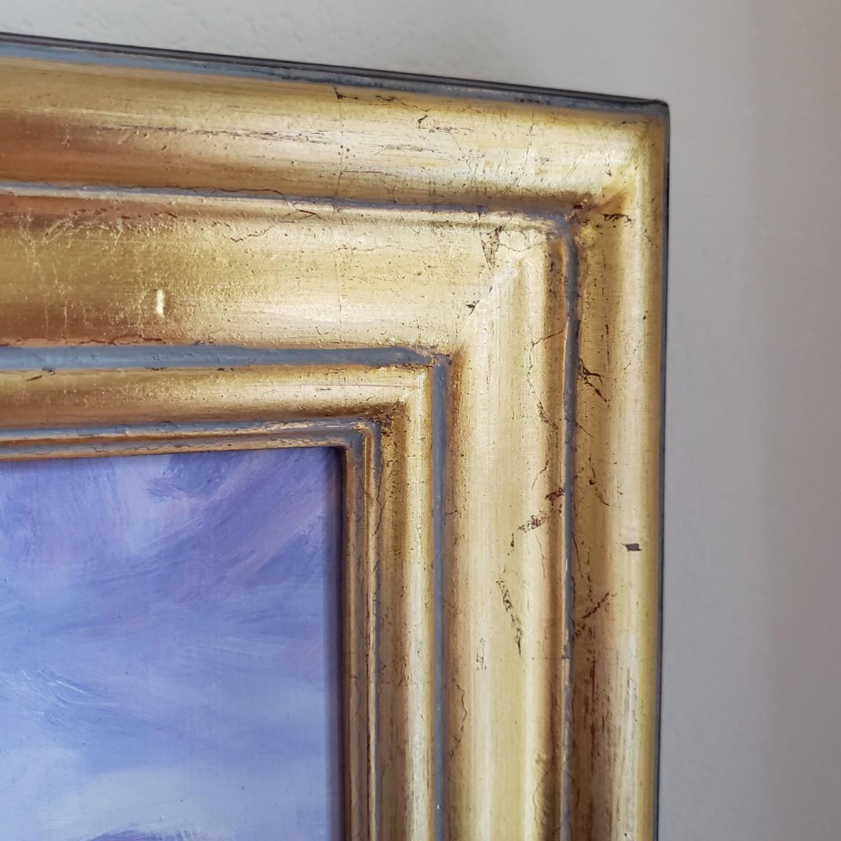 This soft oil painting features earth toned golds with blue and purple mountains and clouds. This appears to have an original signature by artist Dix Baines. The wooden frame, without glass, has gold with grey and red highlights, see pictures. The frame measures 16" x 13".
