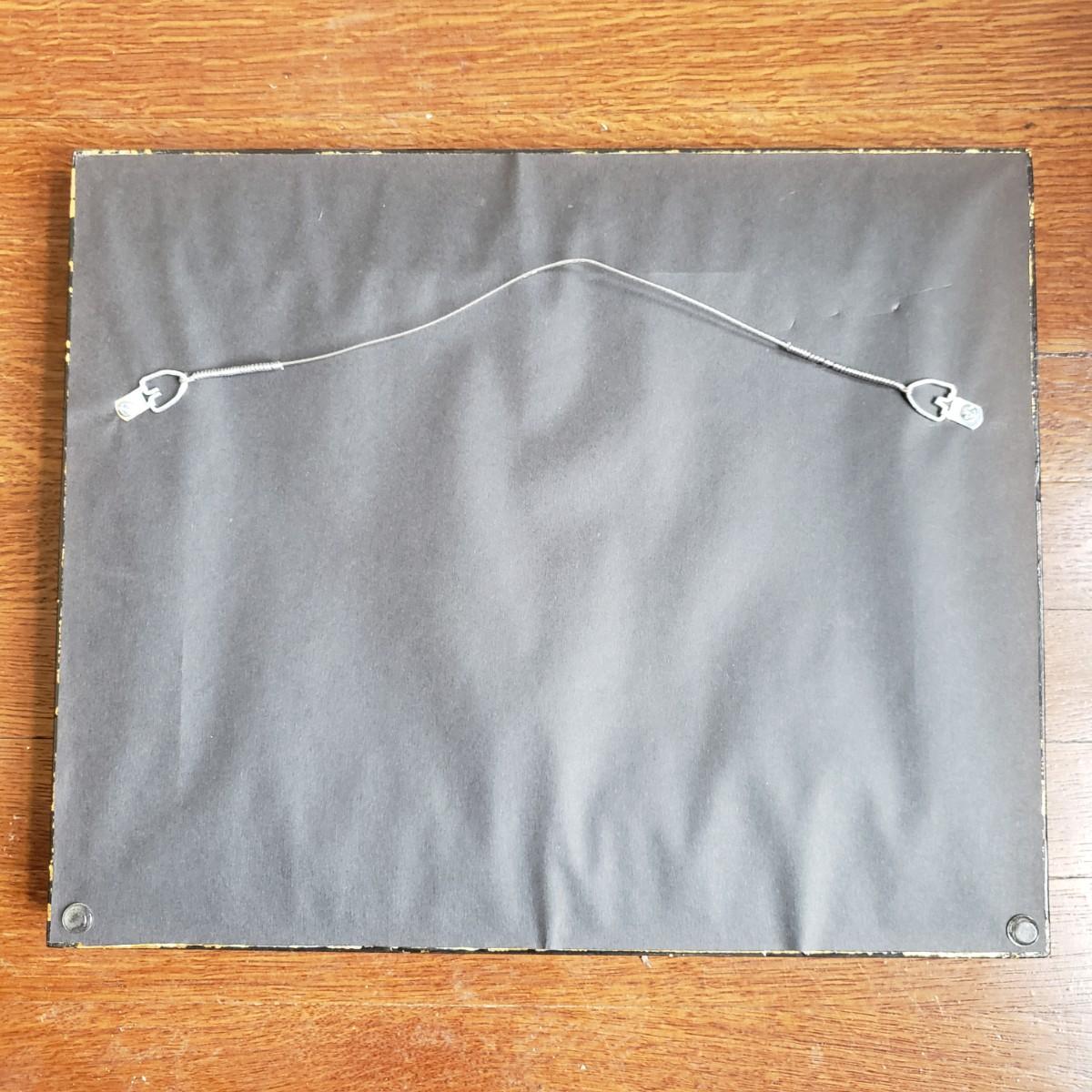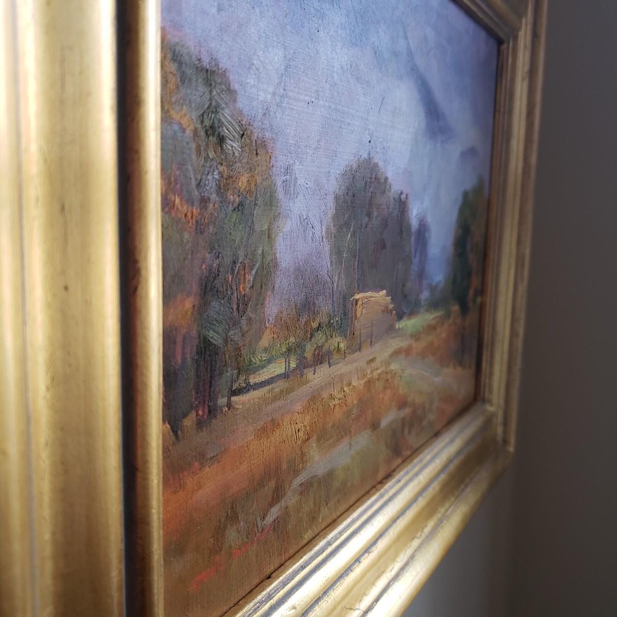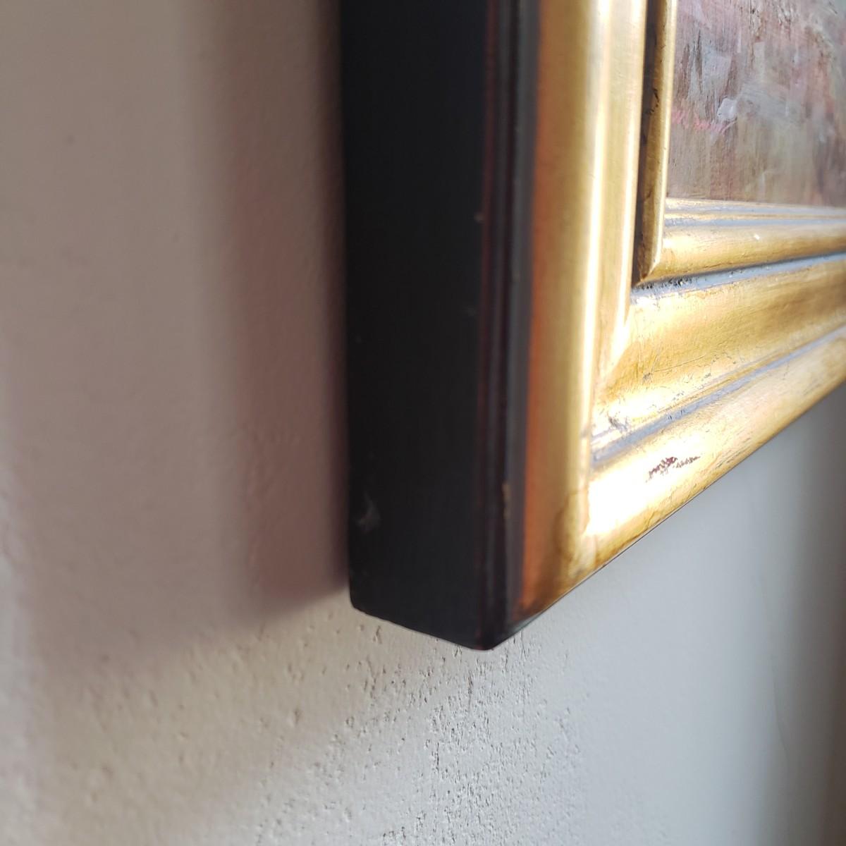 This soft oil painting features earth toned golds with blue and purple mountains and clouds. This appears to have an original signature by artist Dix Baines. The wooden frame, without glass, has gold with grey and red highlights, see pictures. The frame measures 16" x 13".