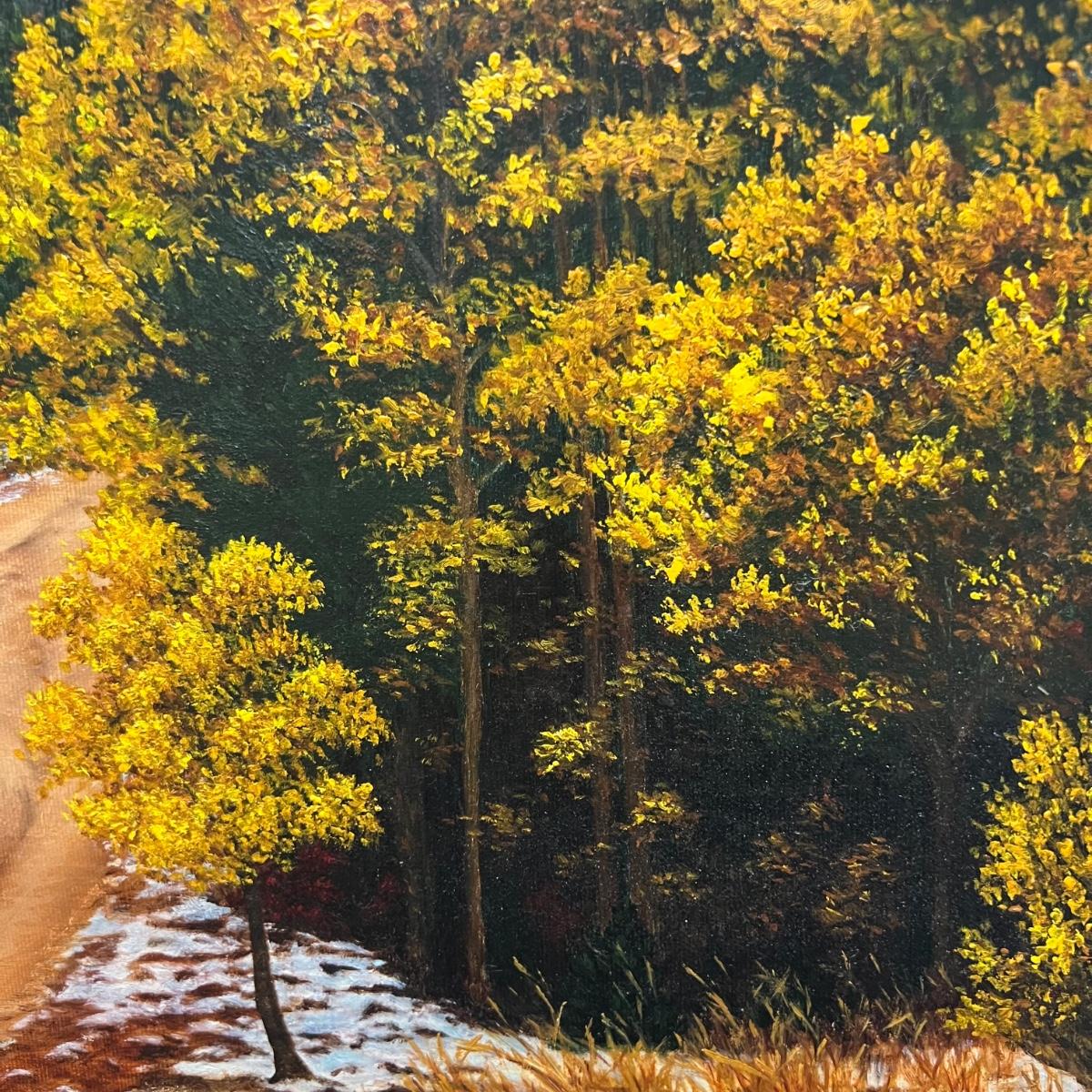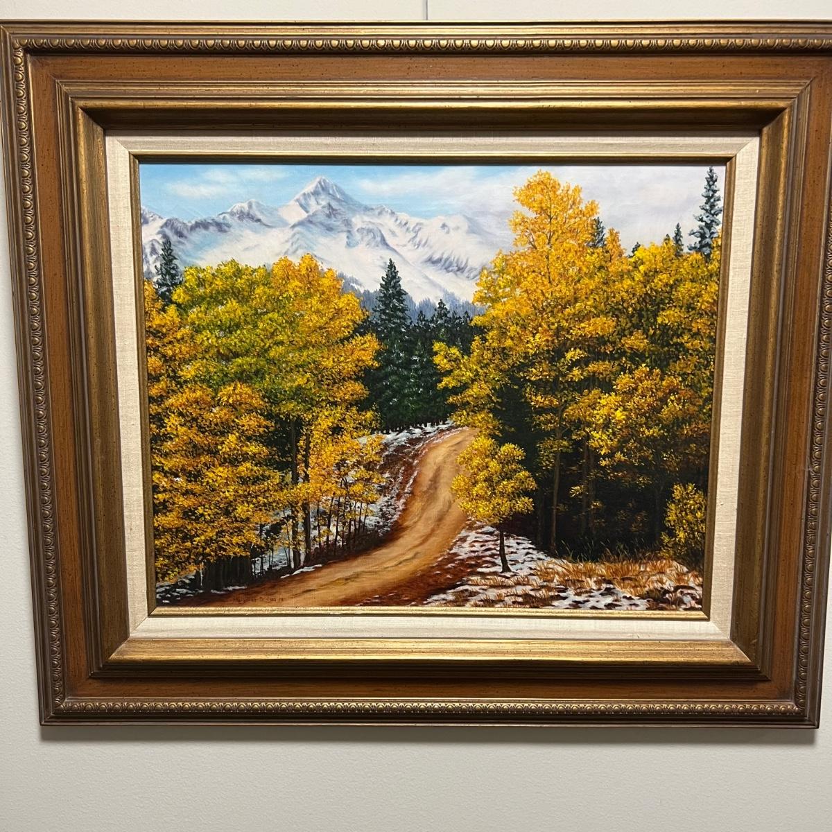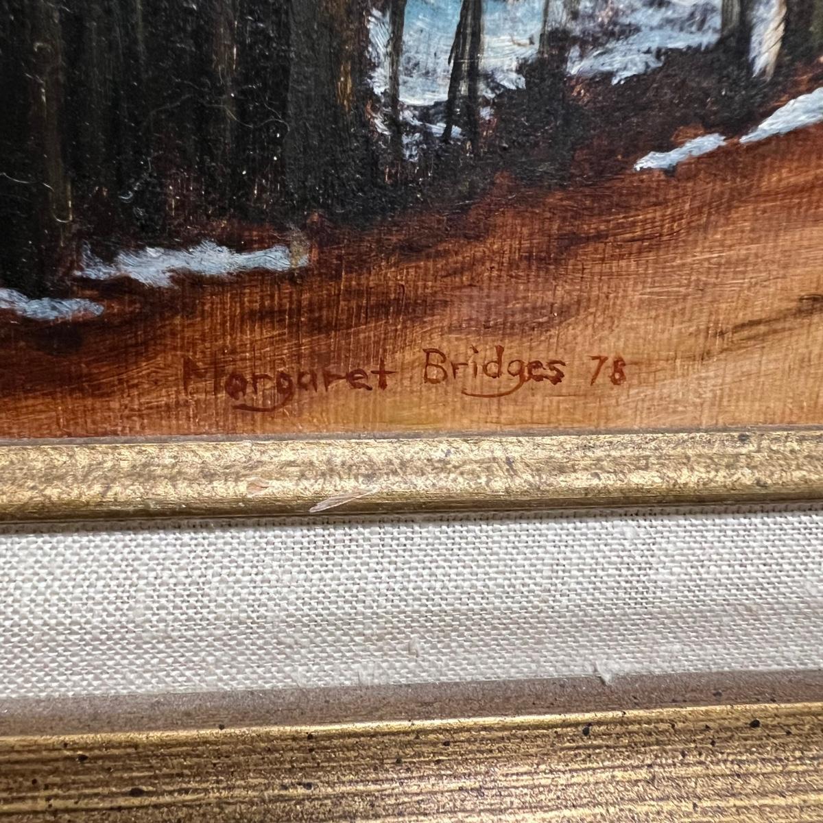 The lovely fall/winter scene depicts a winding road during the end of fall beginning of winter. It is signed "Margaret Bridges 78". The colors are vibrant gold and crisp evergreen. The wood framed piece measures 28.25” x 1.25” x 24.25”H. This art appears to be an original painting.