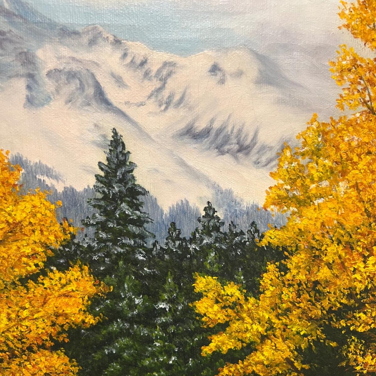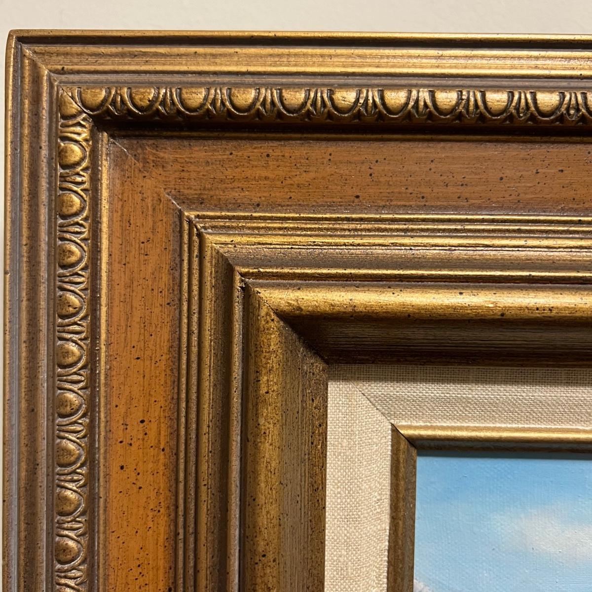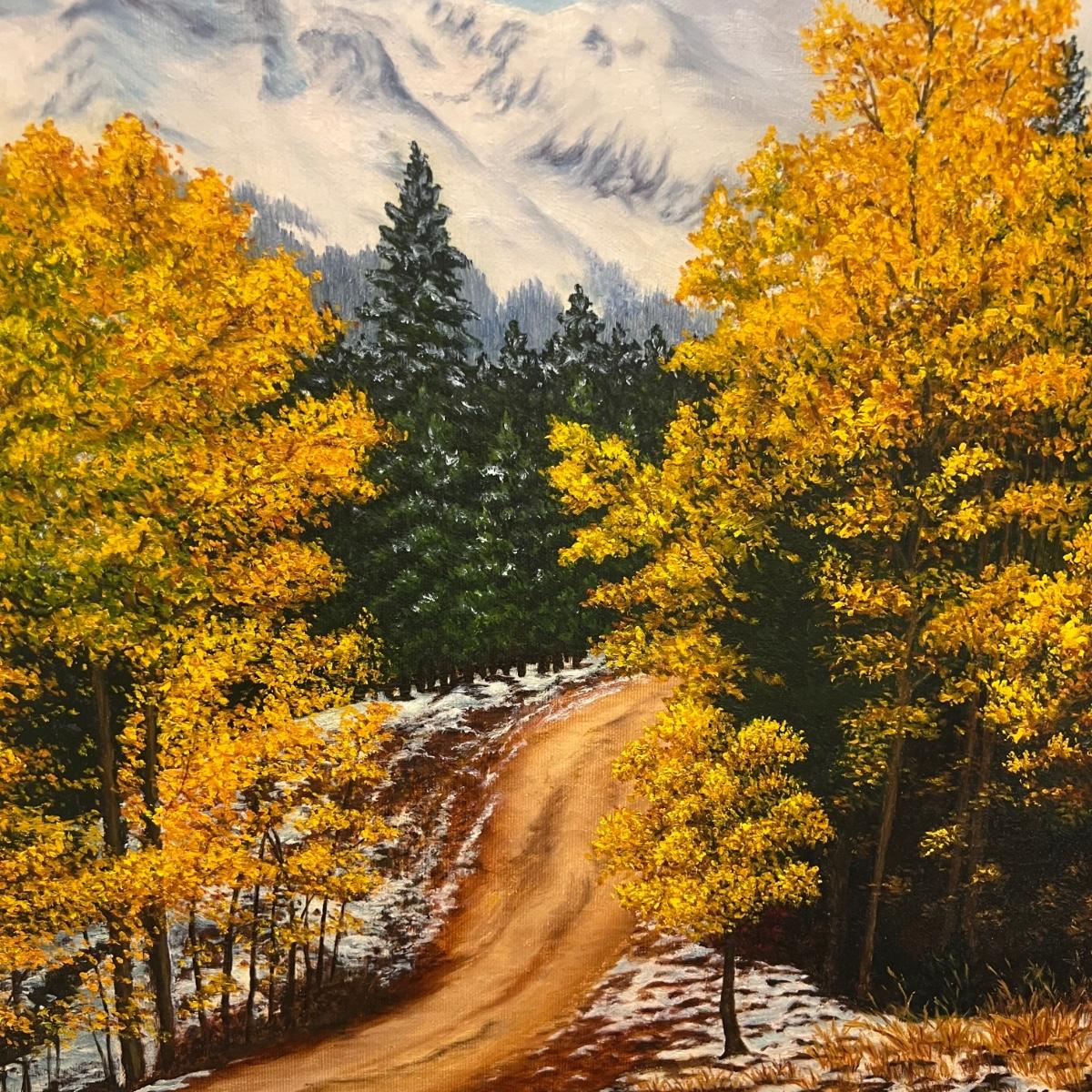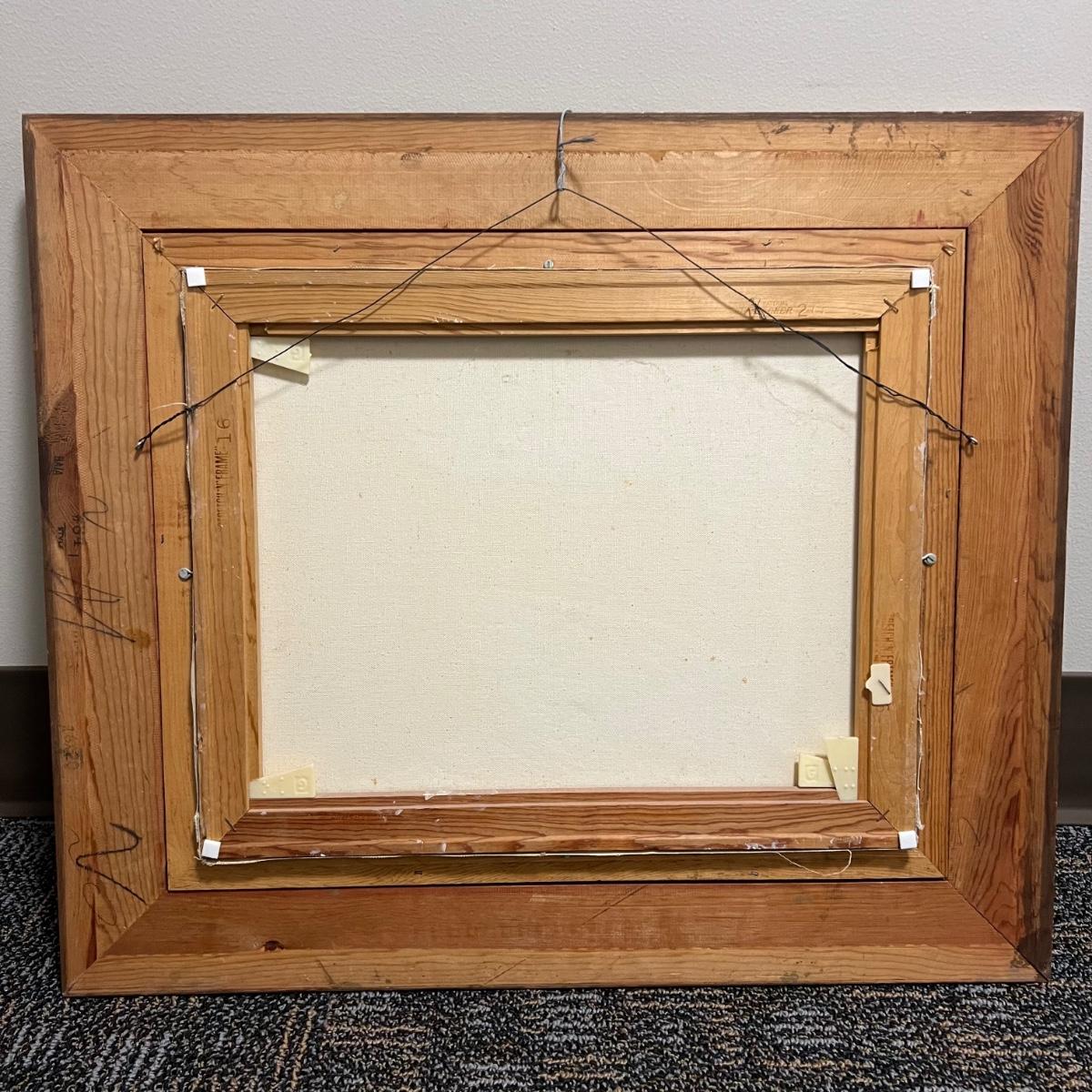 The lovely fall/winter scene depicts a winding road during the end of fall beginning of winter. It is signed "Margaret Bridges 78". The colors are vibrant gold and crisp evergreen. The wood framed piece measures 28.25” x 1.25” x 24.25”H. This art appears to be an original painting.