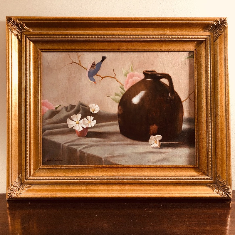 Charming antique still life painting by John Daniel Neubauer, (1953-) long time resident of the Hudson Valley, classically trained and exhibited globally. Inspired by his surroundings in the Hudson Valley, he is well respected for hiss landscape and still life paintings.