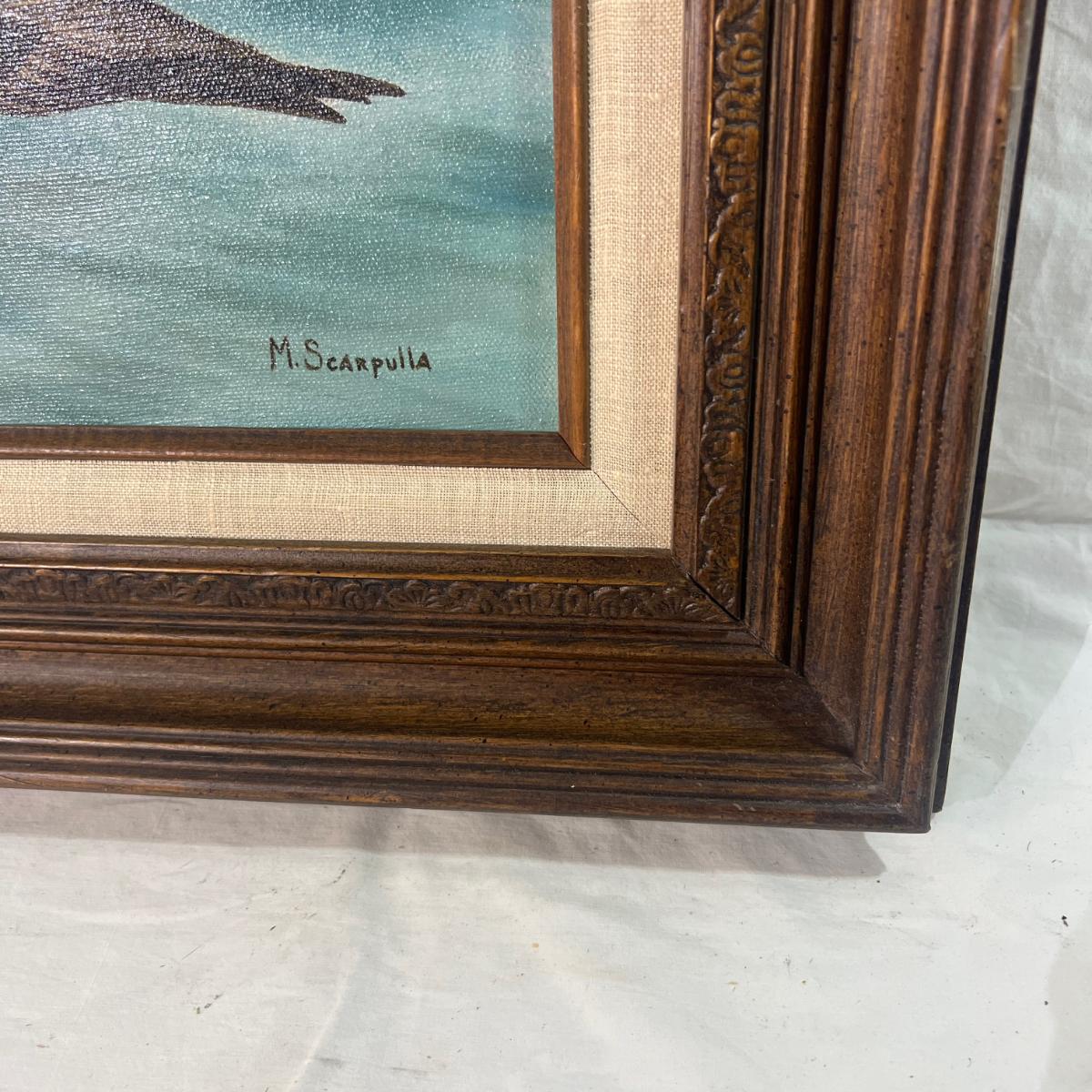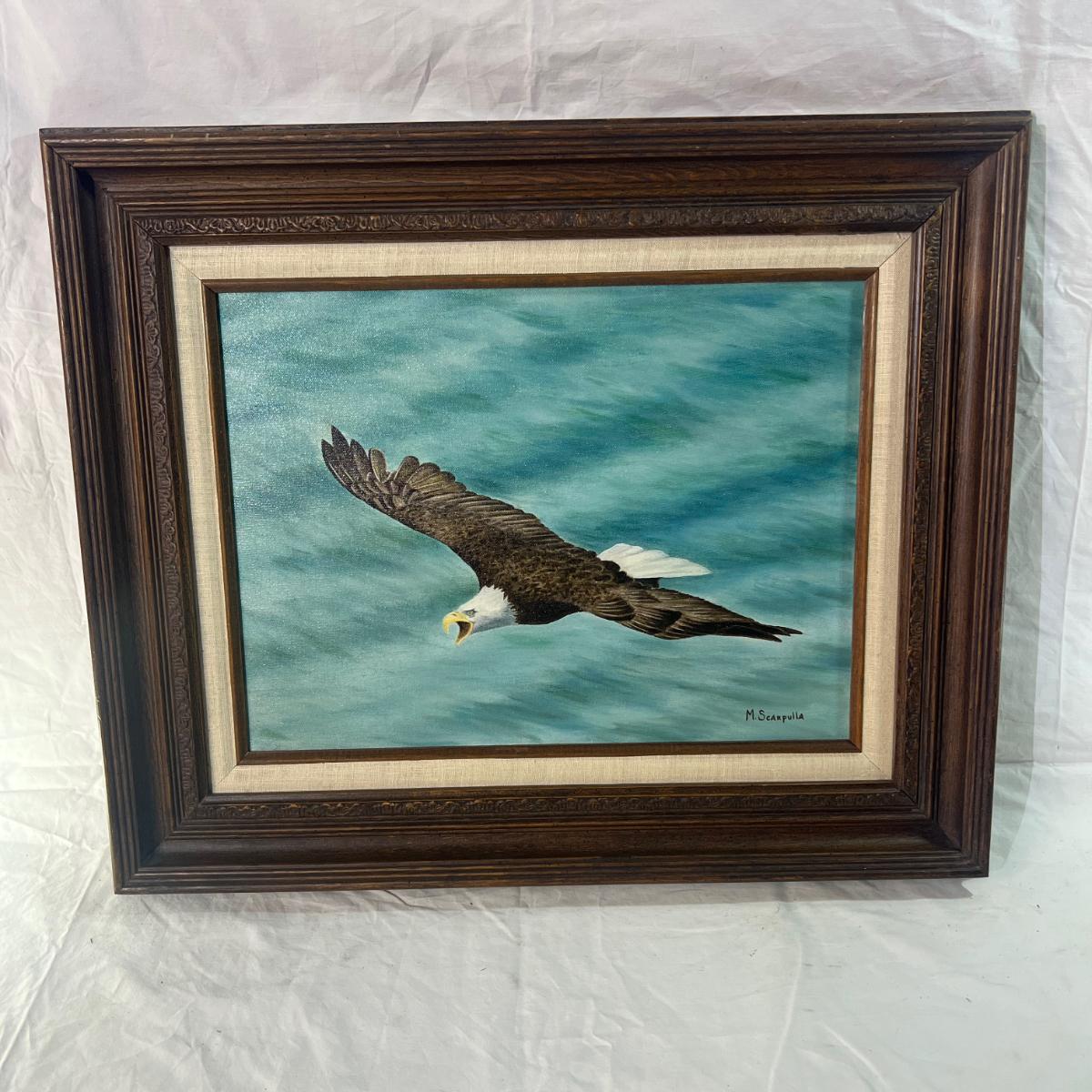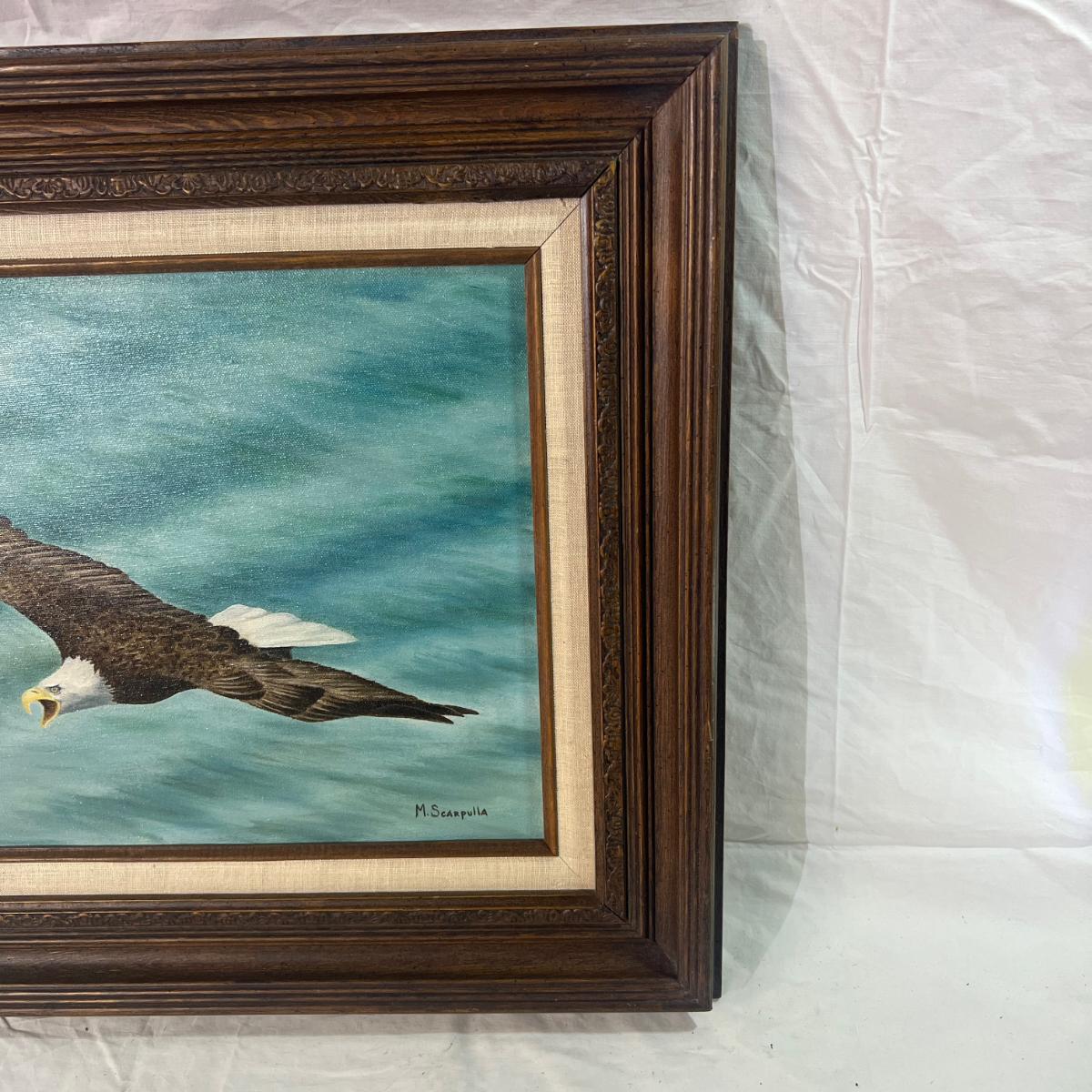 Vintage Real Wood frame with floral detail around edge, oil painting of eagle. Artist signed M. Scarpulla