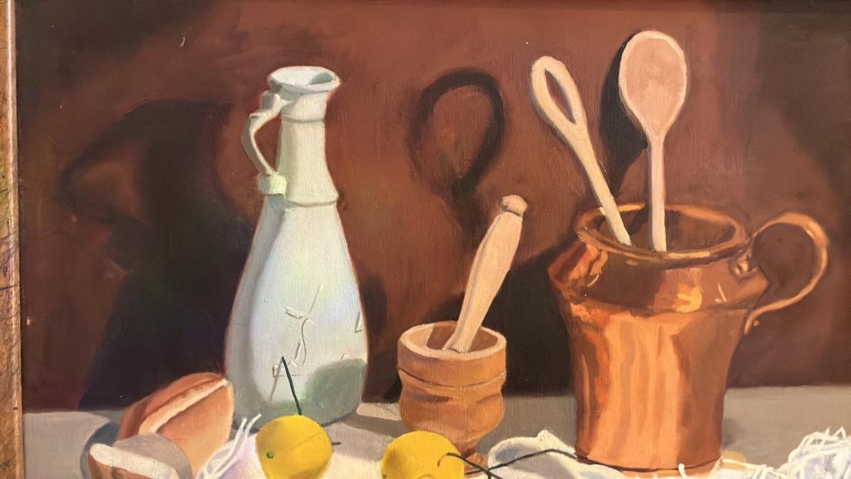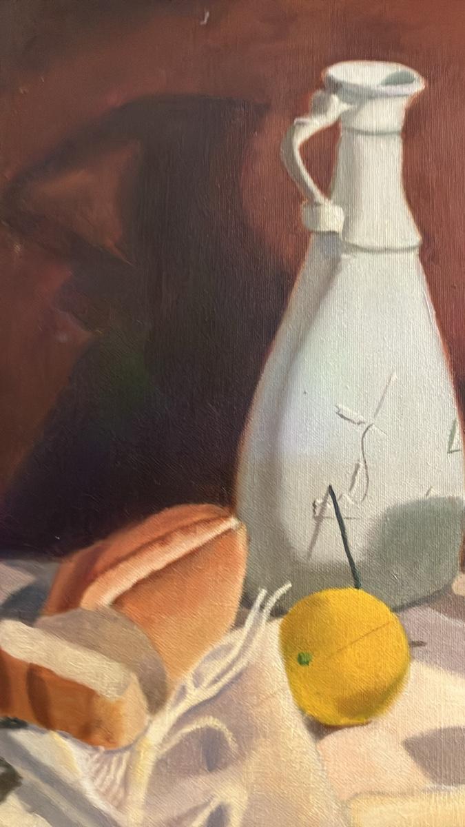 Oil Painting of Rustic Harvest Still Life: Lemons, Bread, and Copper Glow (Mid-20th Century Oil)