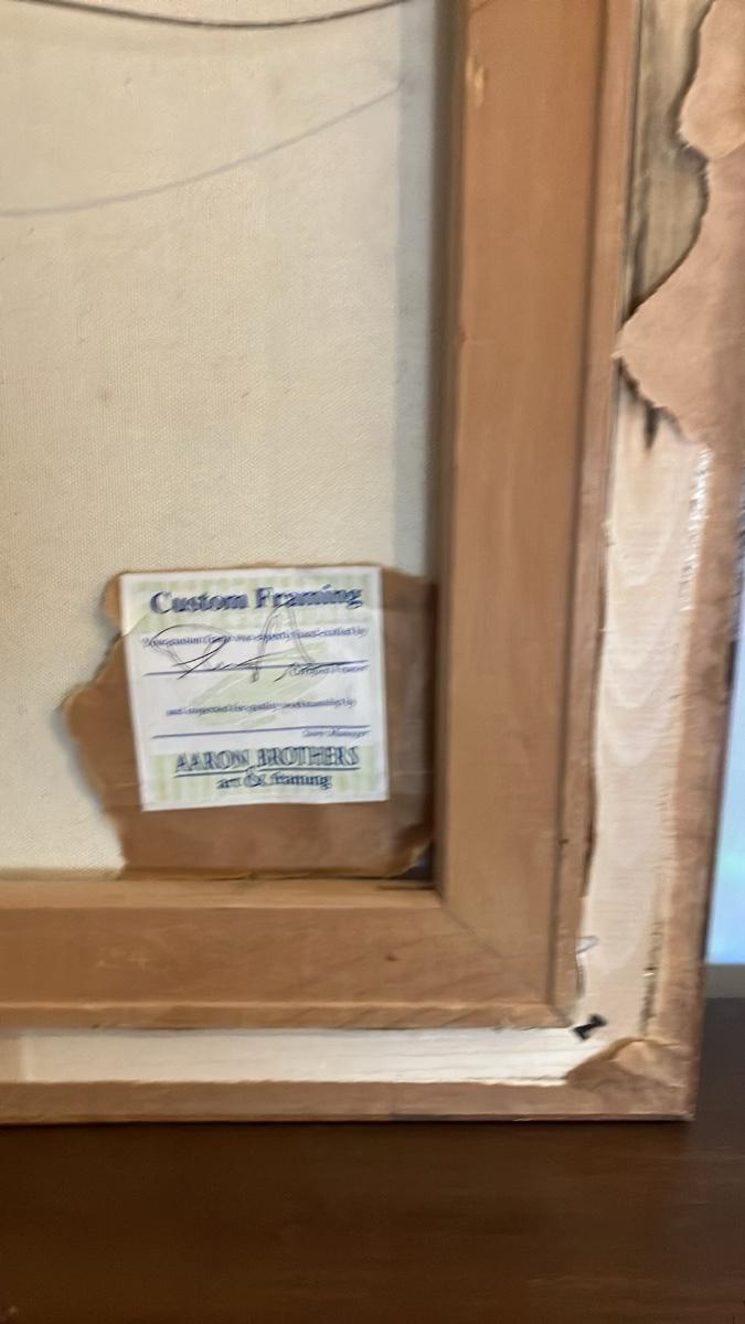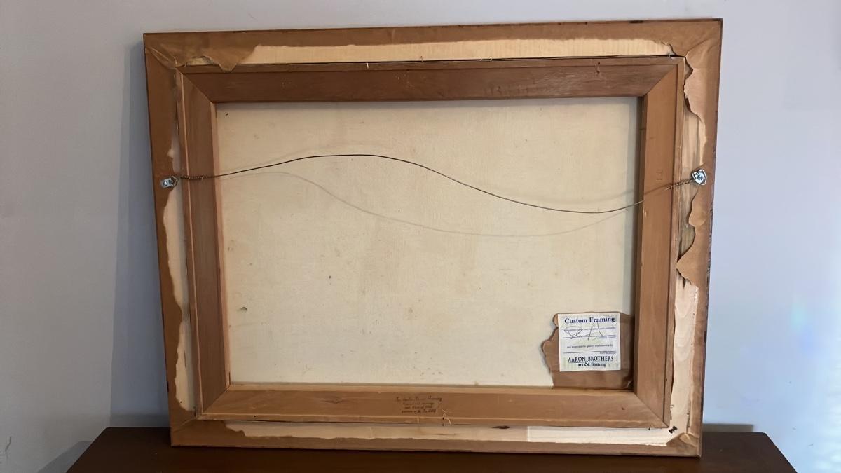 Housed in a custom distressed wood frame with a weathered, reclaimed oak finish that enhances its vintage charm, the piece measures a display-ready 27.5" wide x 21.5" high (canvas approx. 24" x 18"). In pristine condition, with no restoration needed, it's a versatile heirloom for farmhouse kitchens, cozy dining nooks, or eclectic living spaces—perfect for adding warmth and character without formality.