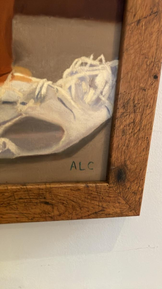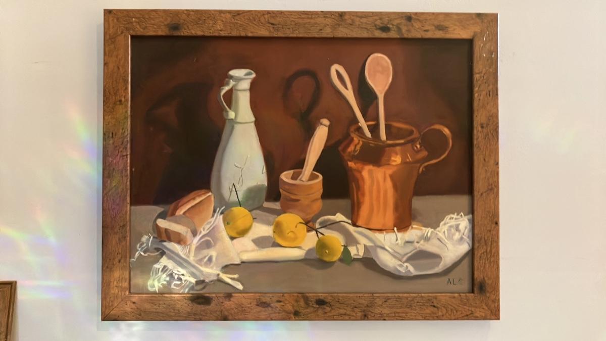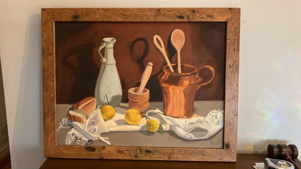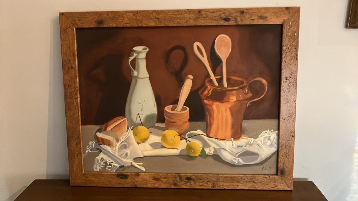Discover the quiet elegance of everyday abundance in this captivating mid-20th-century oil on canvas still life, signed "ALC" lower right. Titled Rustic Harvest Still Life, it beautifully captures a sunlit kitchen vignette: a generous slice of crusty bread draped in soft white linen, three vibrant lemons with fresh stems and leaves, a gleaming copper pot brimming with warmth, a humble terracotta mortar and pestle, a graceful white jug, and wooden spoons at rest—evoking the simple joys of baking and harvest. Rendered in rich, layered oils with masterful attention to texture—the lemons' dimpled skins, the bread's golden crumb, the pot's subtle sheen—this painting glows with intimate realism against a shadowed backdrop, reminiscent of Chardin's domestic poetry.