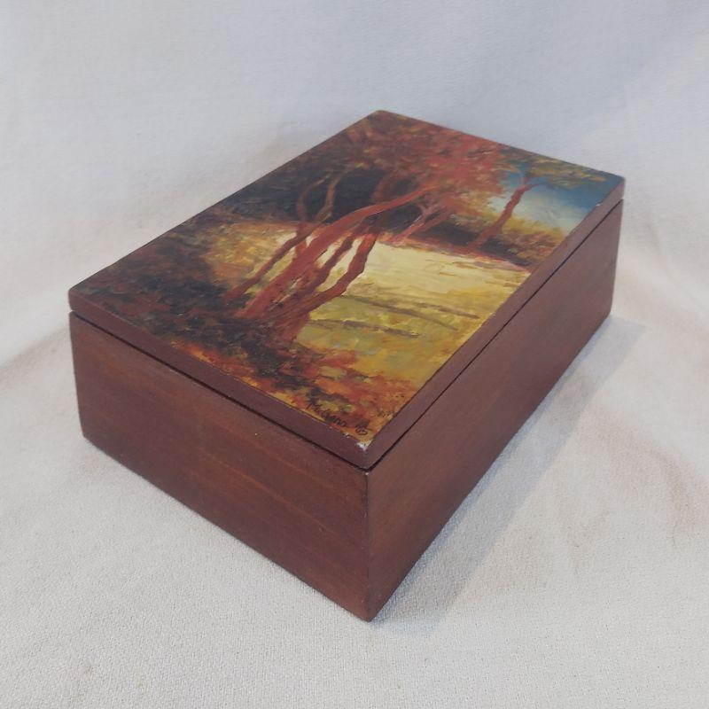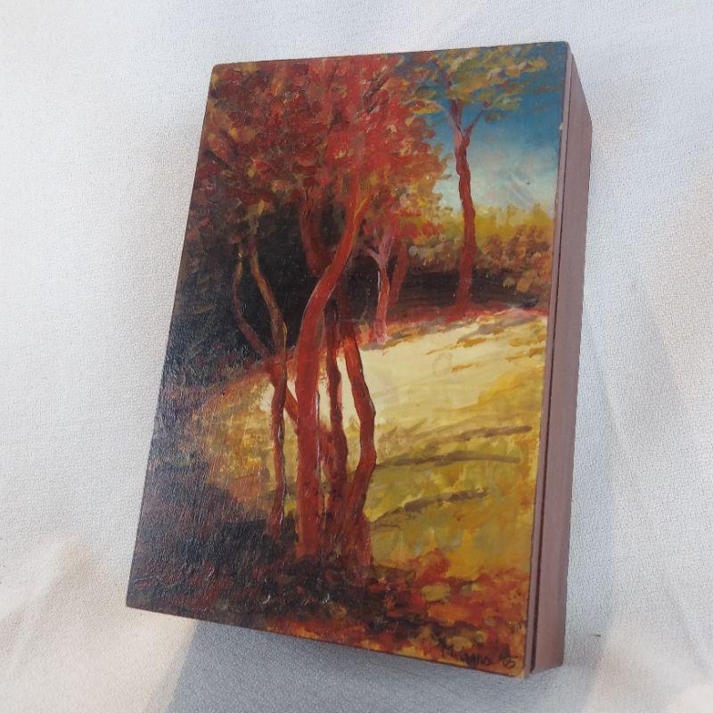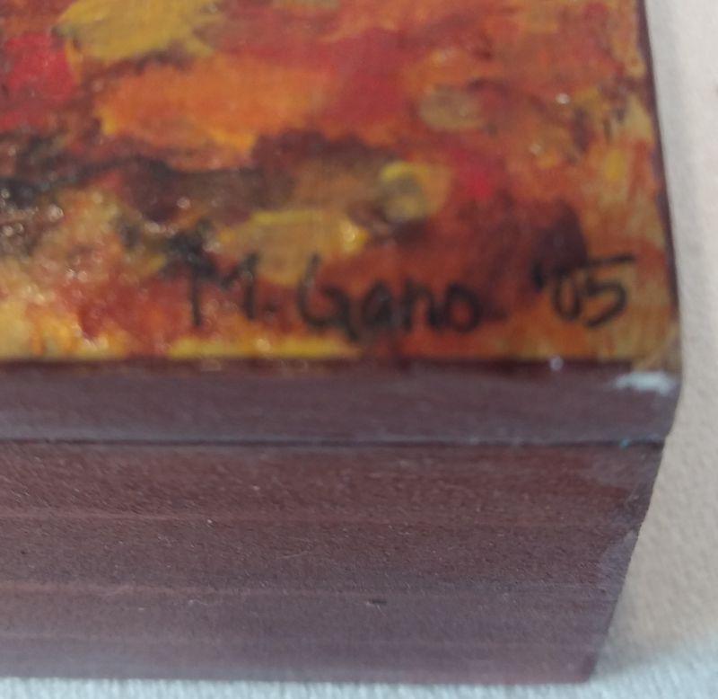 Hand-painted Original Oil Painting on a hand made Box. Signed M. Gano '05. Box measures 4-inches wide X 6 1/2-inches tall X 2 1/2-inches thick. Very Nice! Would make a nice Mother's Day gift.
