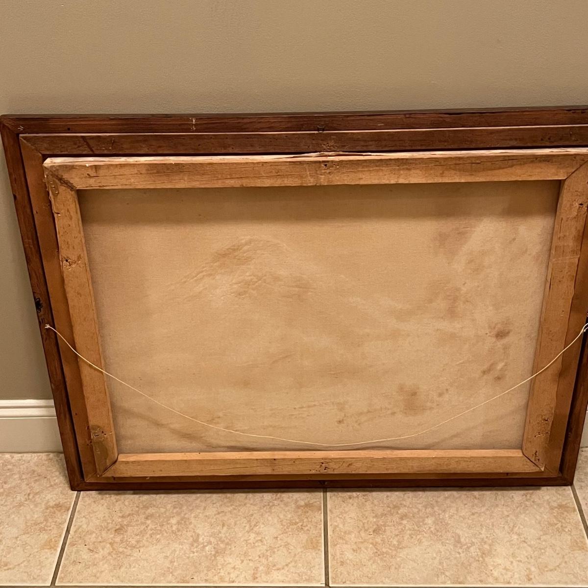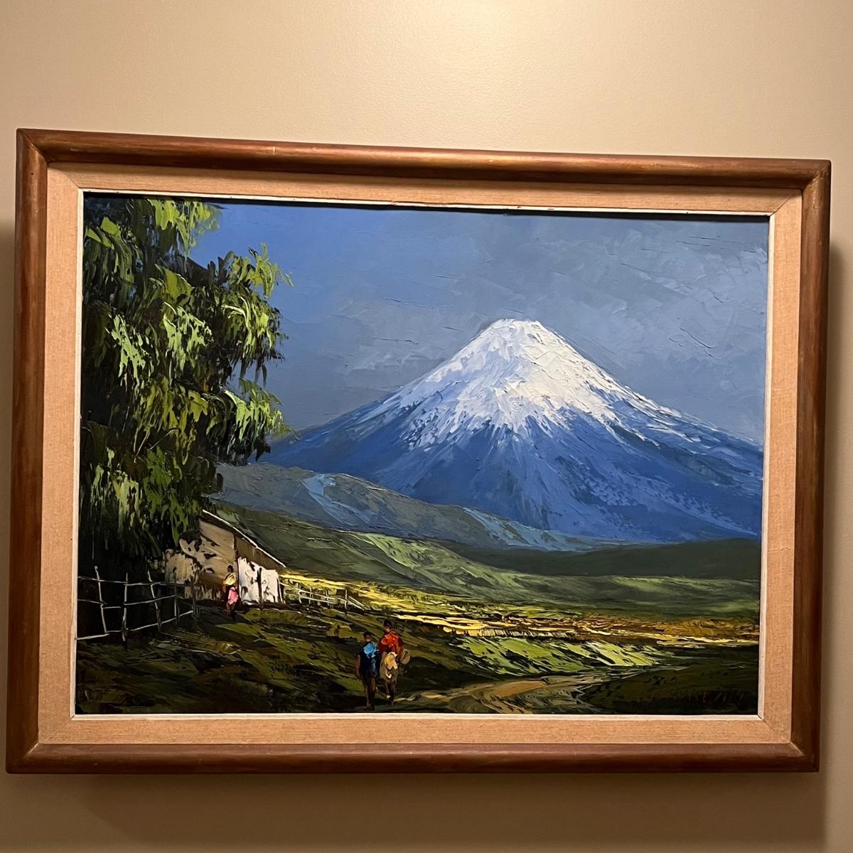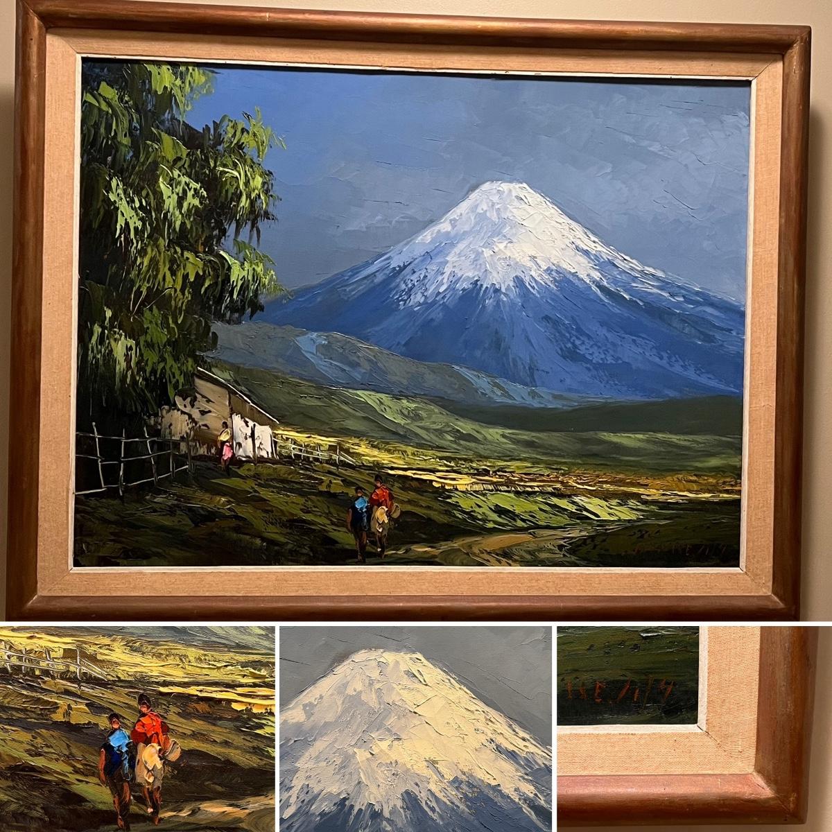 This large vibrant oil painting appears to depict Cotopaxi, a volcano in Ecuador. Seller states it is an original by Carlos Catasse, Sterling Transitions has not verified this information. Painting appears to be original and is mounted (not under glass) in a lightweight wooden frame which measures 37” x 28”H.