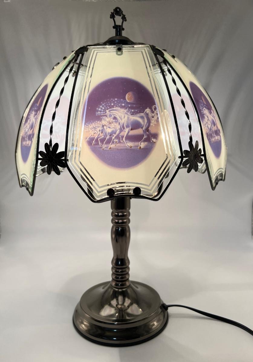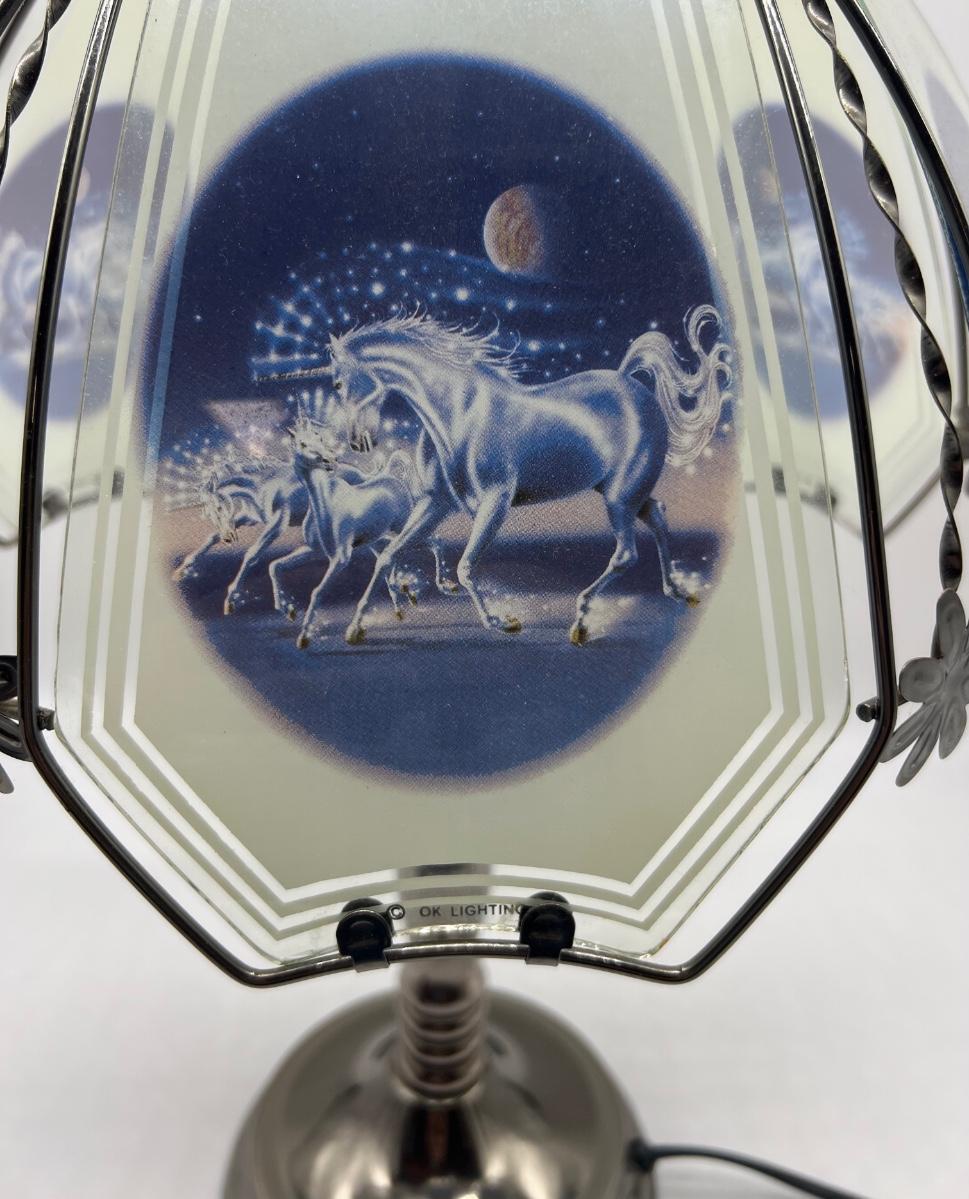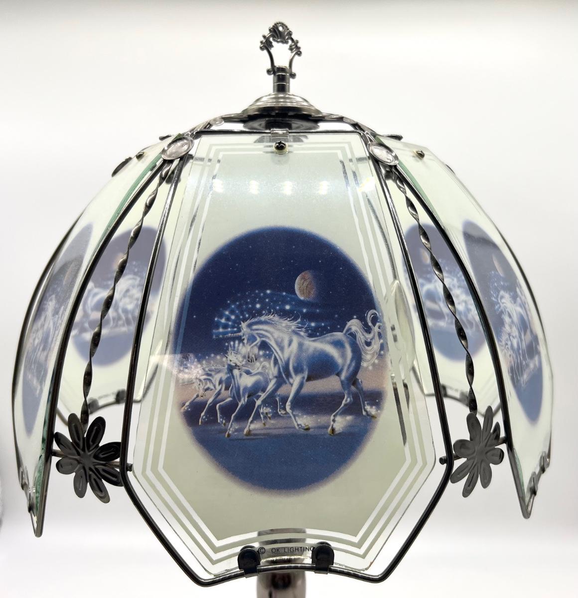 OK LIGHTING 3 Way Touch Vintage Unicorn Lamp with glass panel and chrome. Measures 23 inches tall.