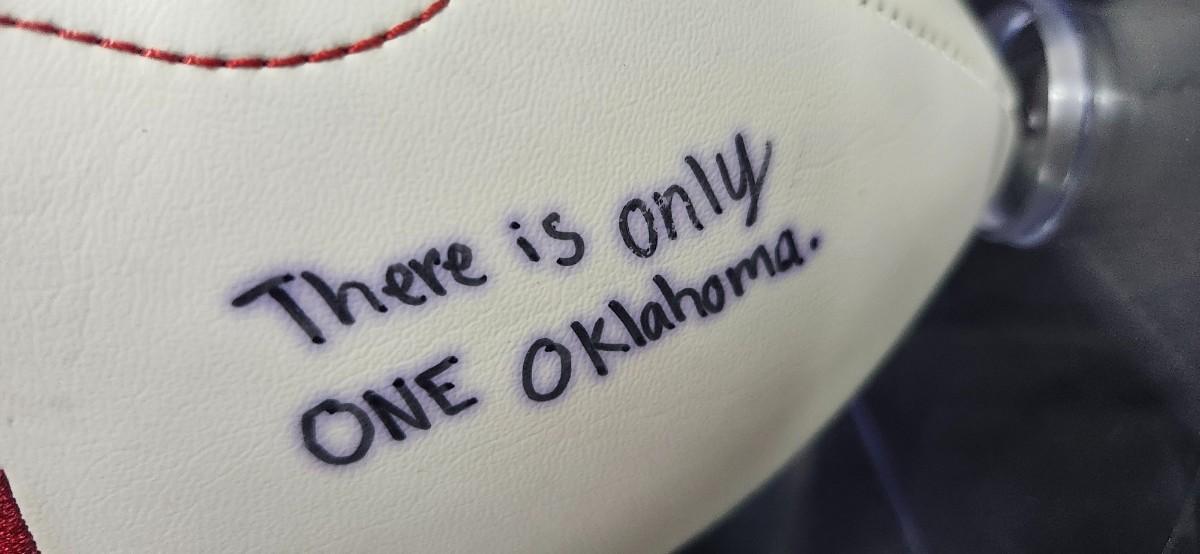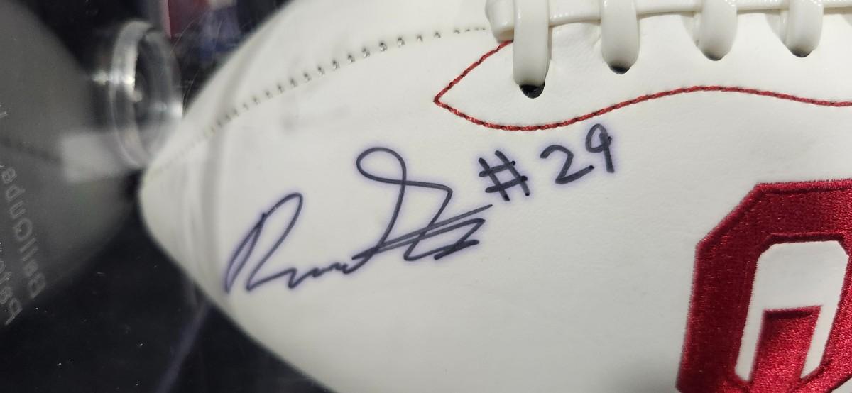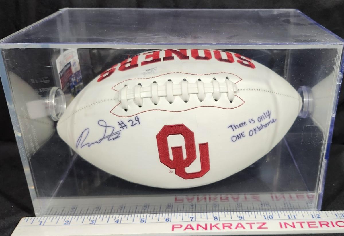 This is an official size Oklahoma Sooners logo football autographed by running back, #29 Rhamondre Stevenson. He signed this ball boldly with a black Sharpie, and has been professionally authenticated services, JSA (James Spence Authentication).