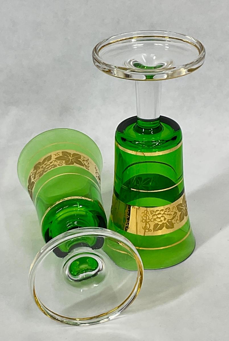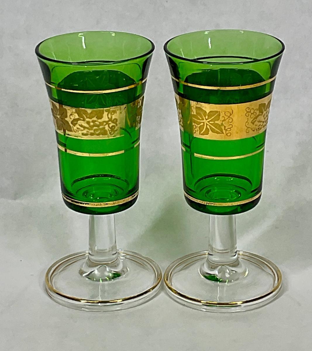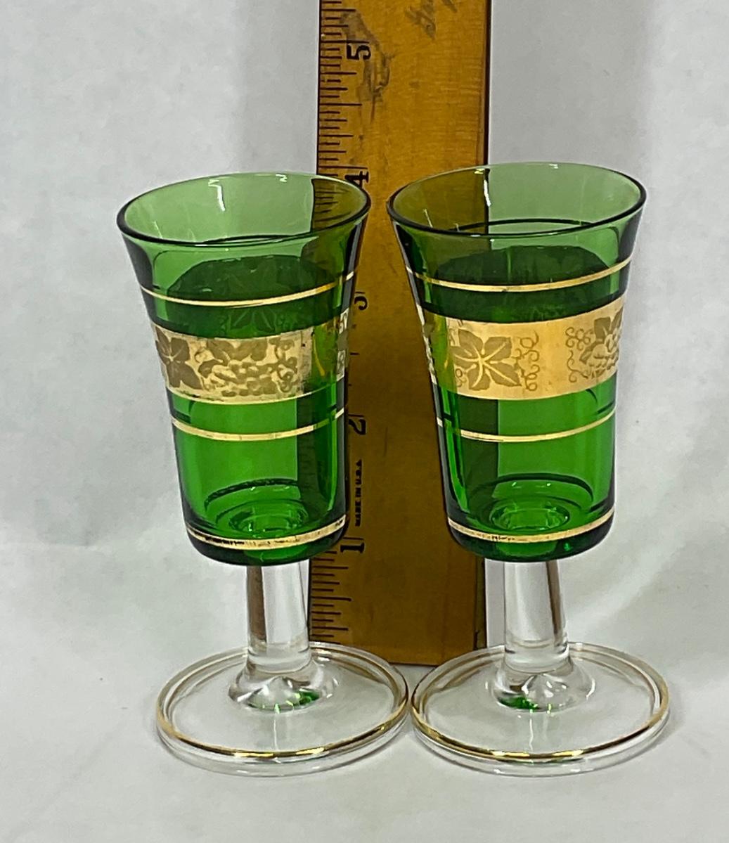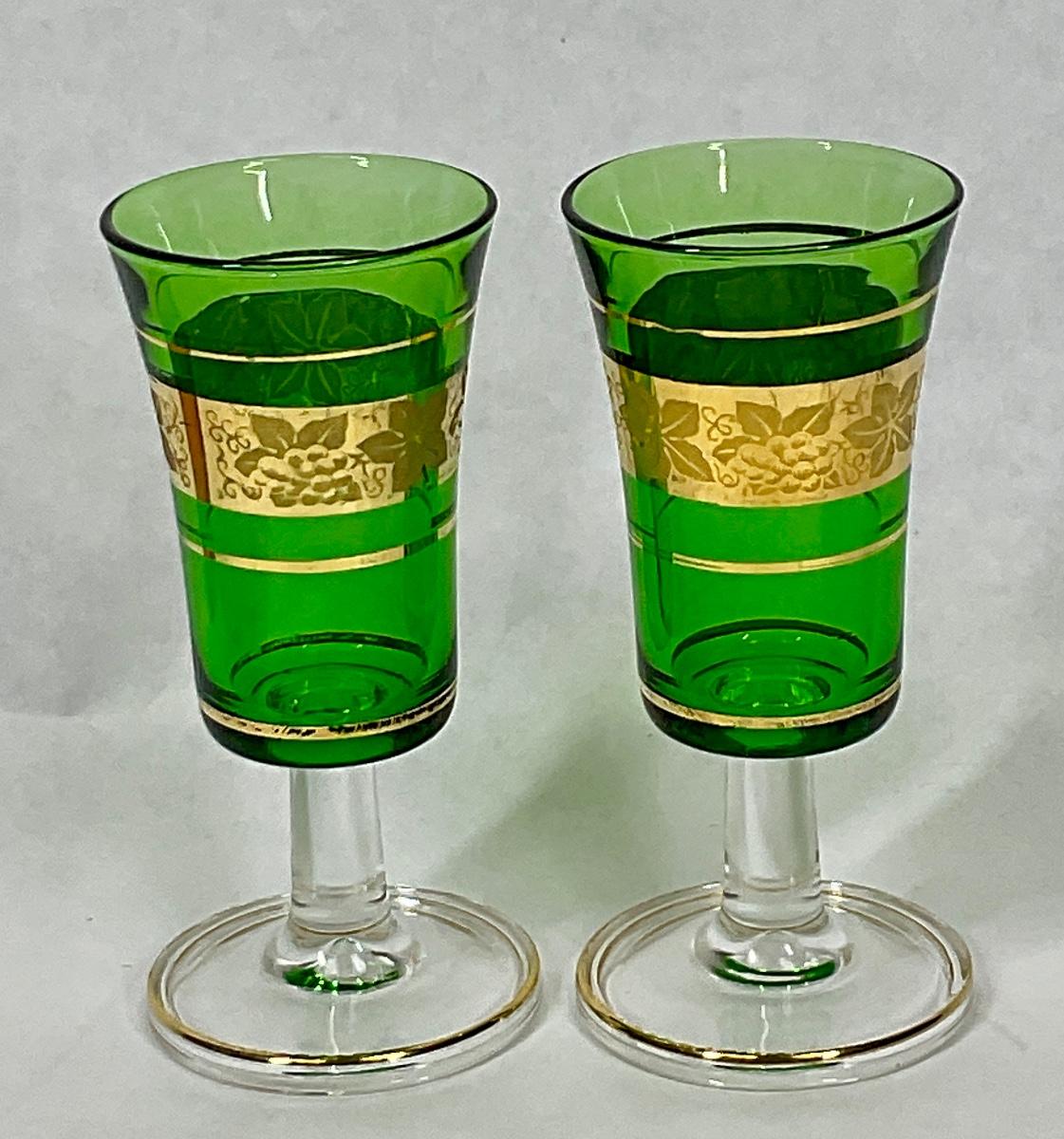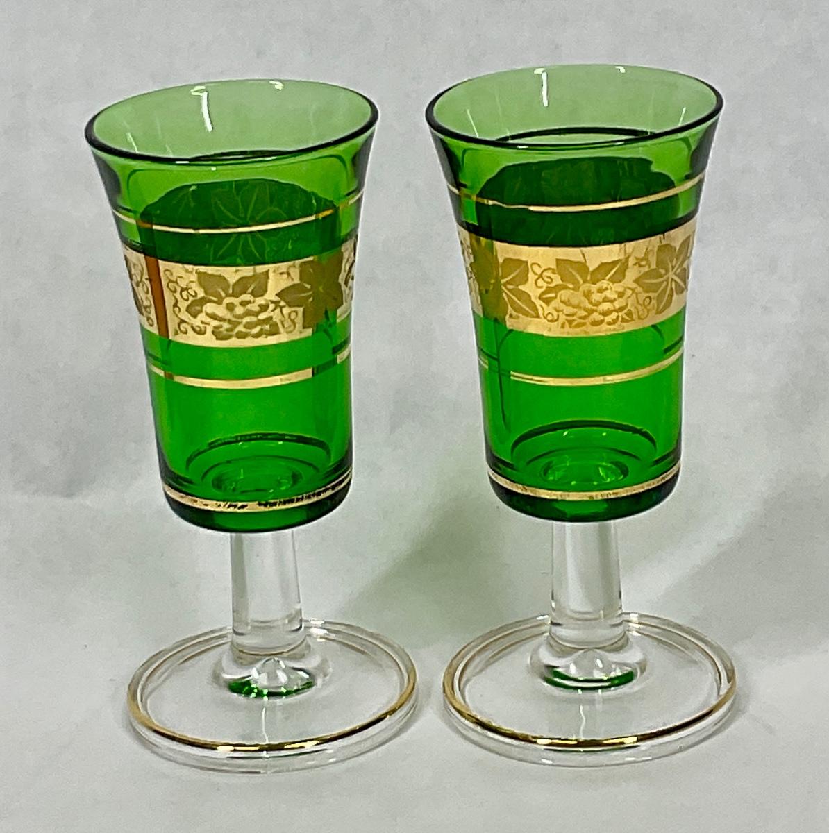 Bohemian Green Glass With Gold Trim Liquor Shot Glasses - 2 pc - Stemware pieces
