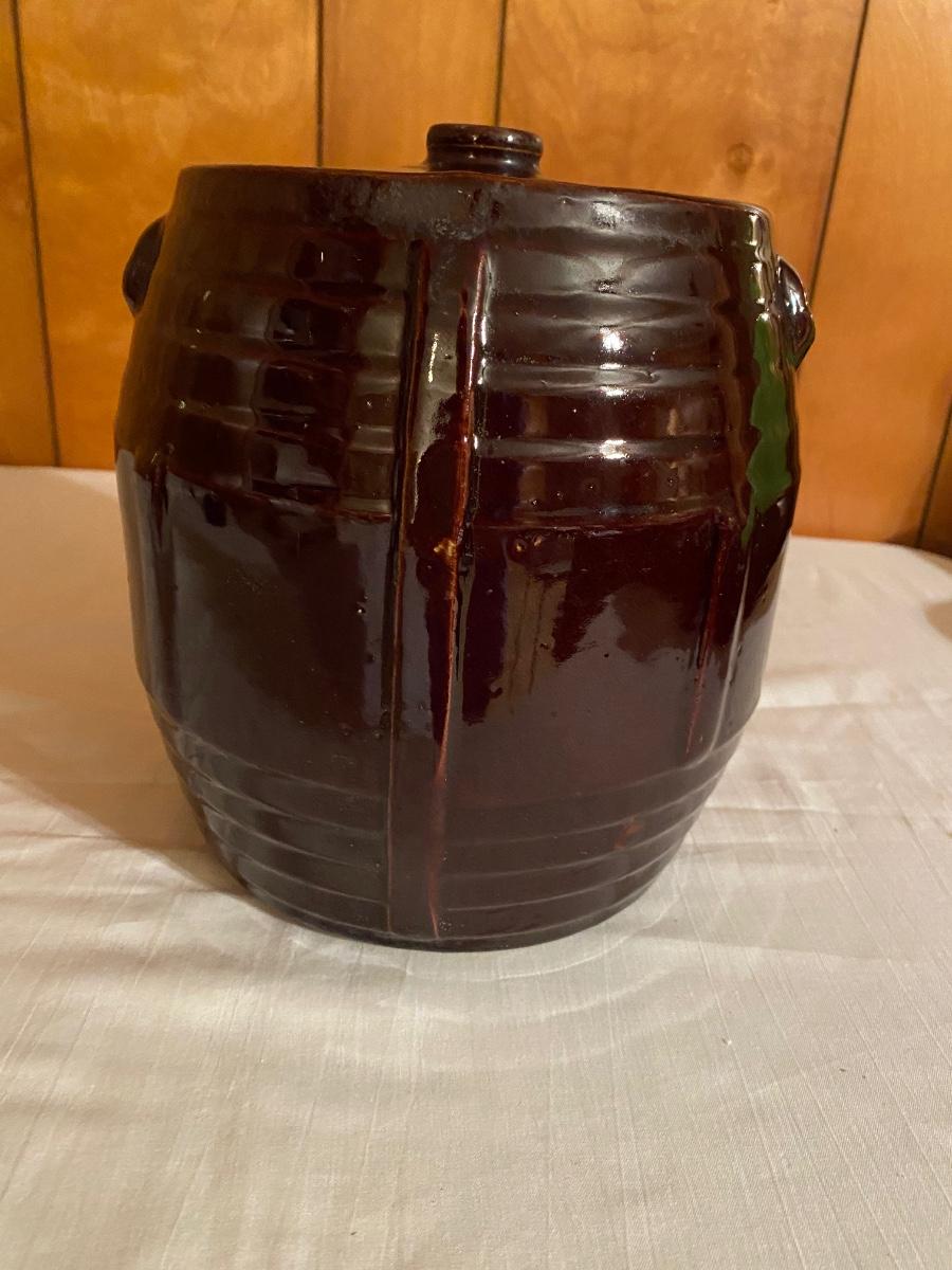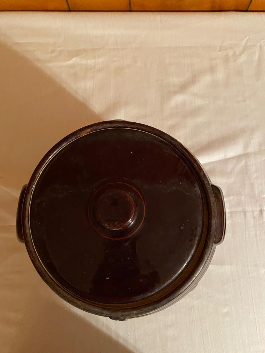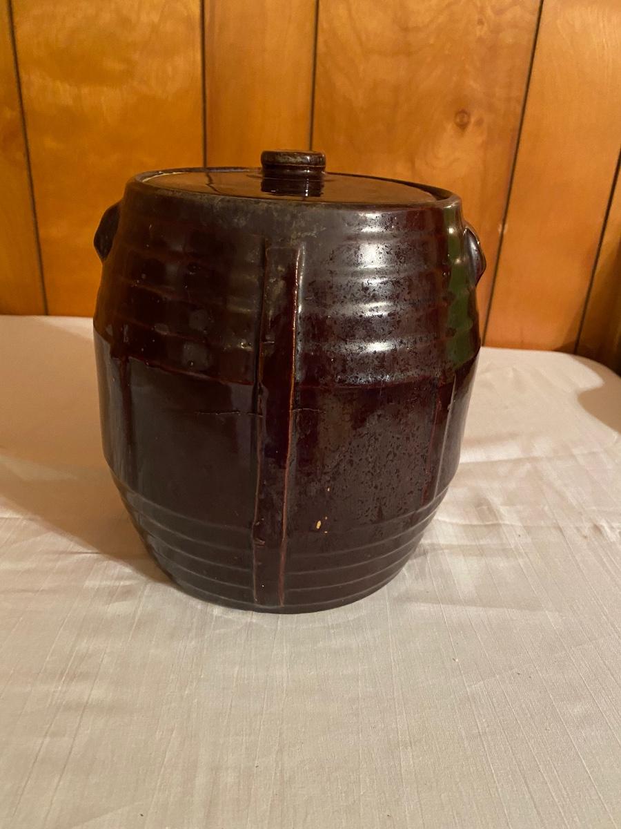 Old brown pottery crock with lid