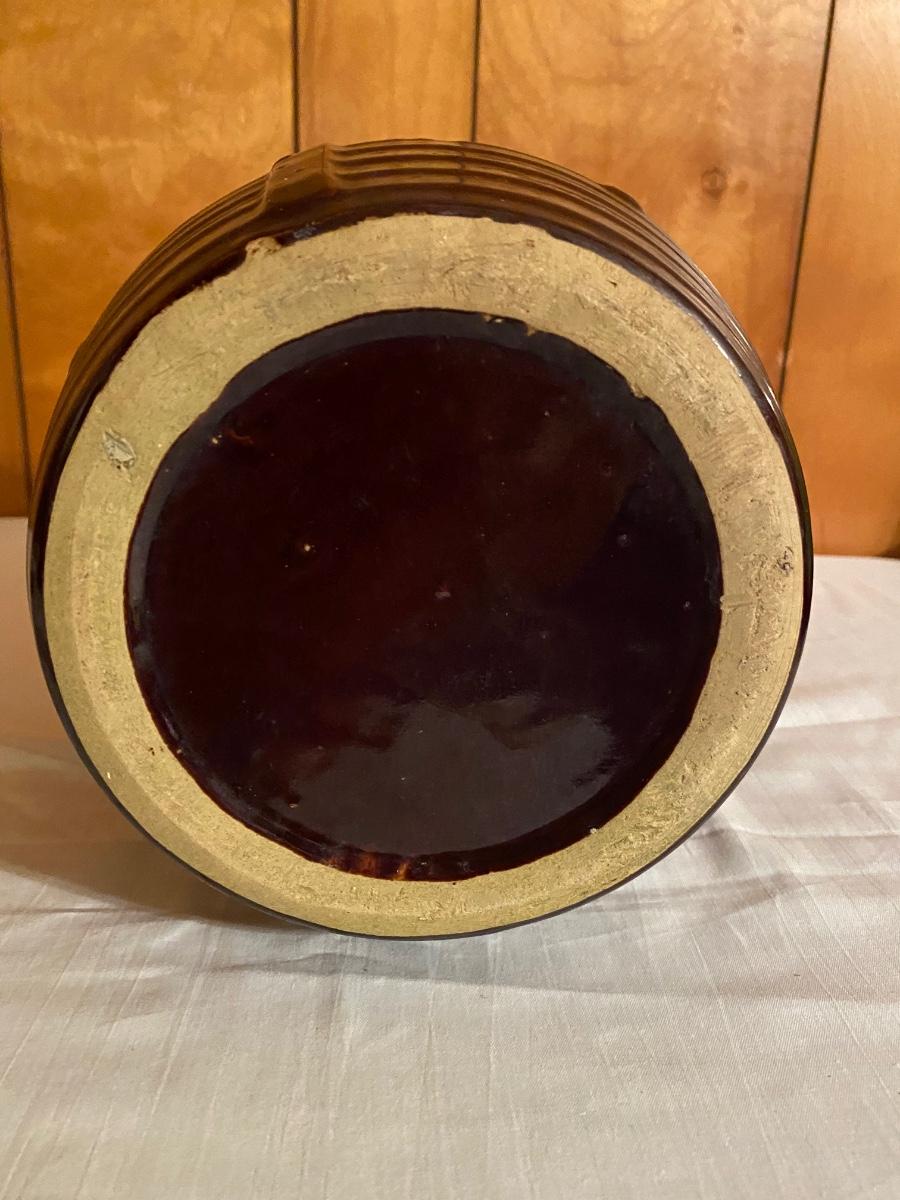 Old brown pottery crock with lid. Approx 7-1/2w x 8”h