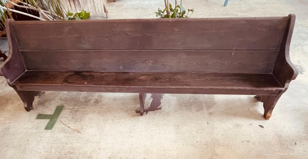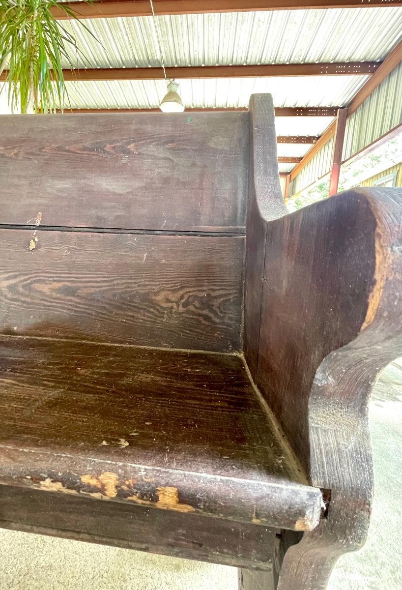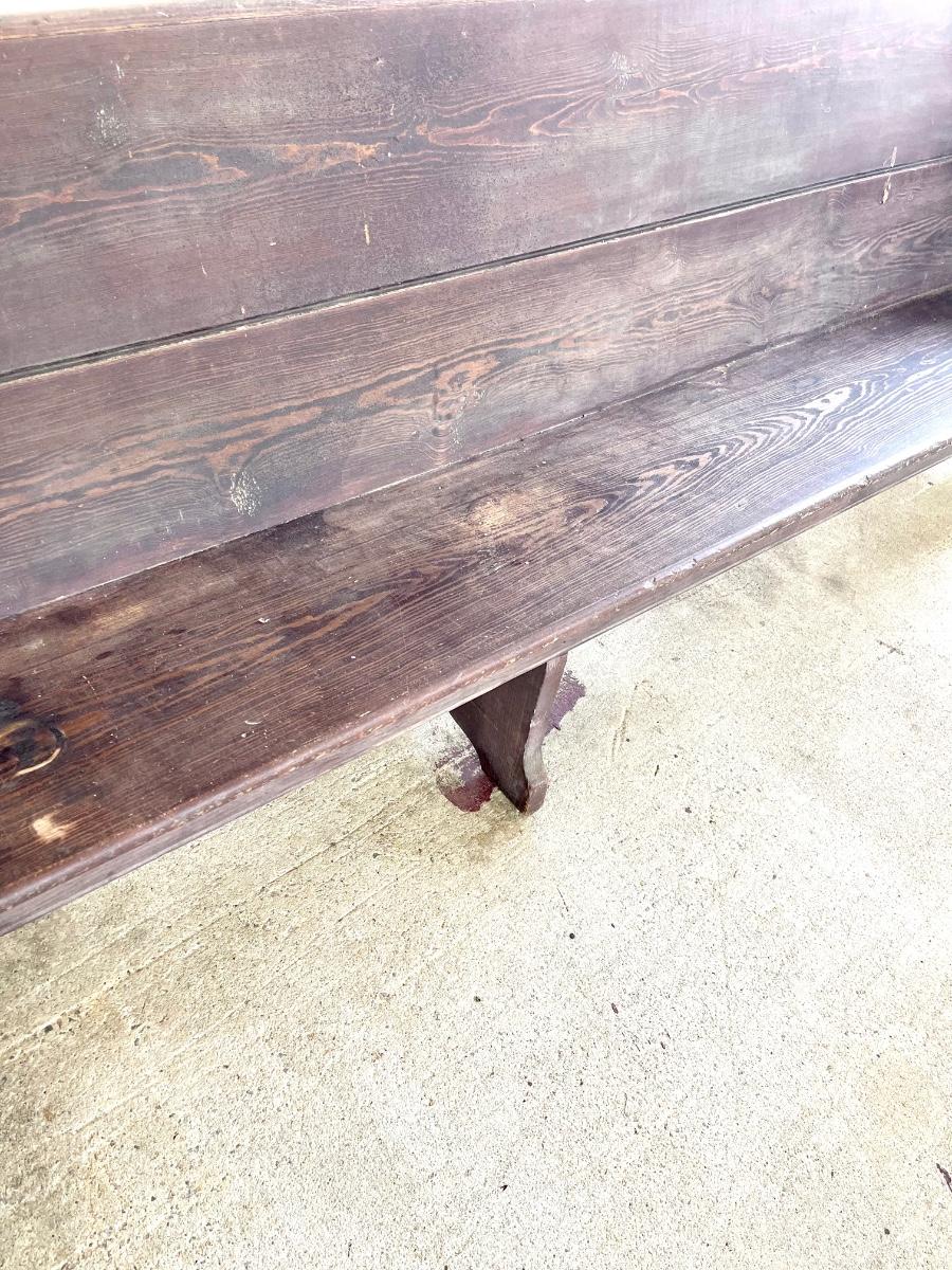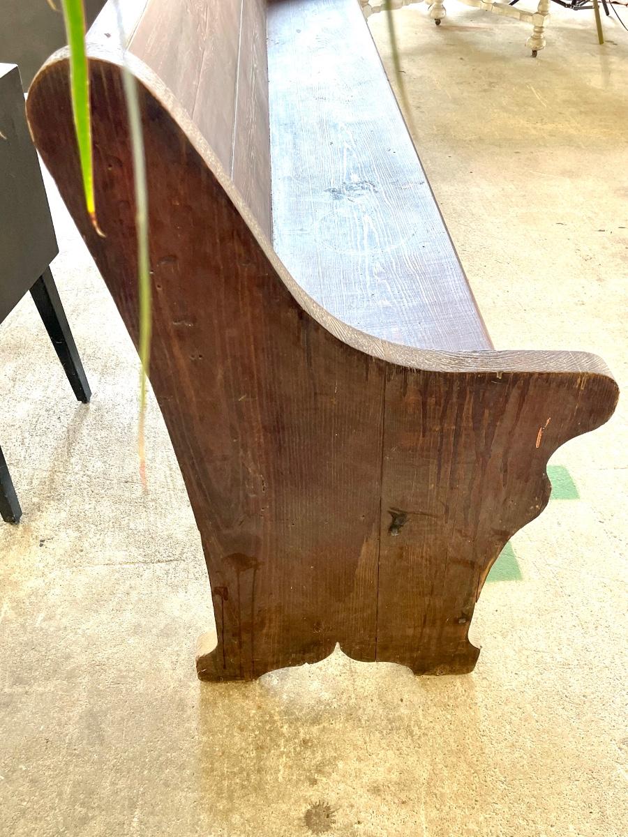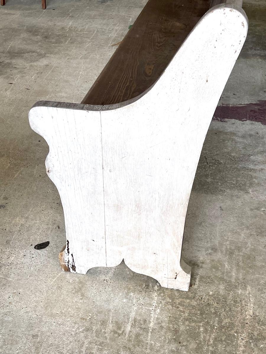 What a fantastic piece for the porch! Pew is in solid condition. It is 9 feet long. One end is painted white as pictured. There is slight wood damage on the bottom of one side as pictured. These are incredibly hard to find these days! If you have a large front porch area. This would be amazing full of mums or poinsettias! This could be such a great seasonal decor piece with plenty of room for sitting!