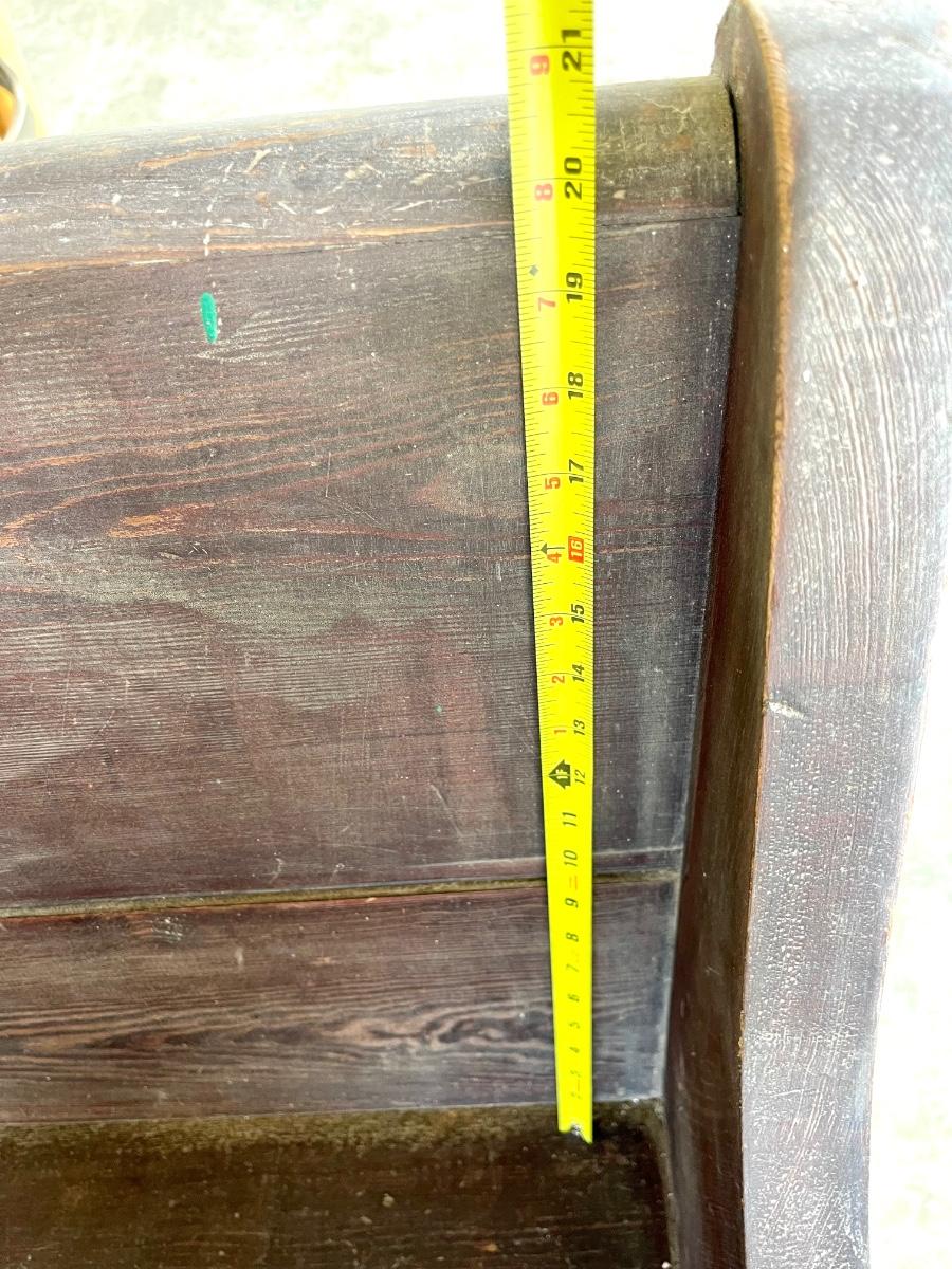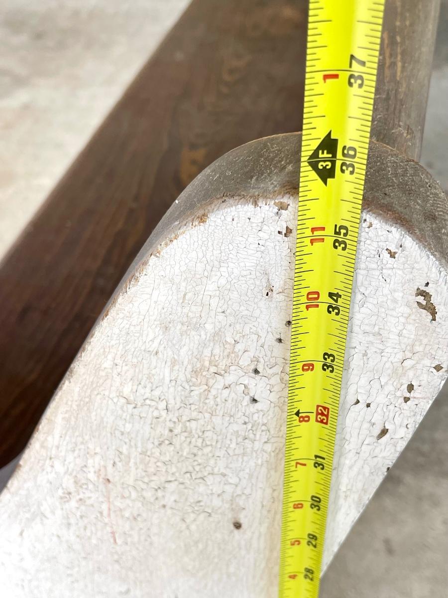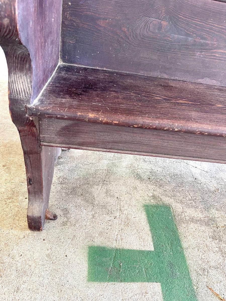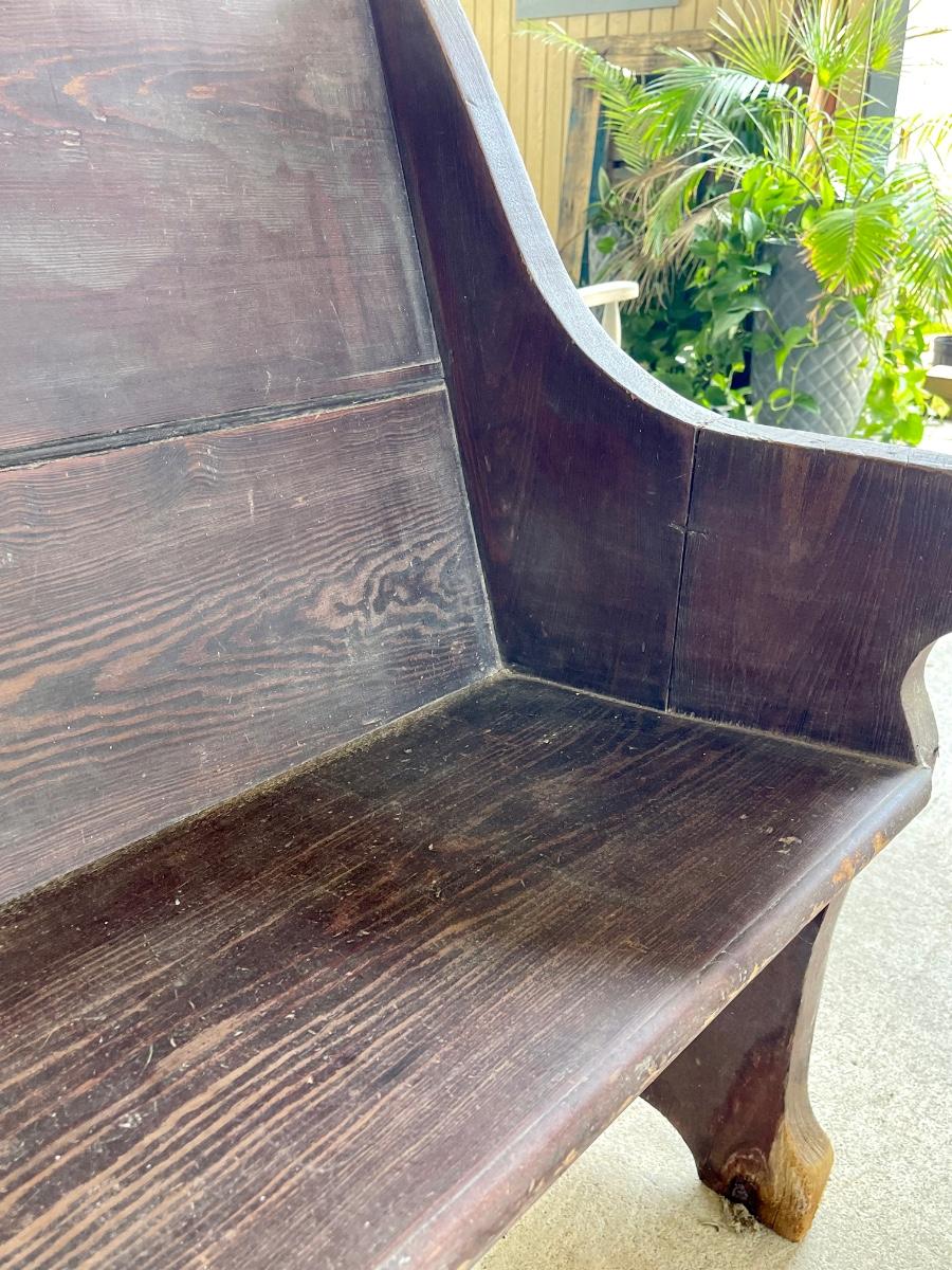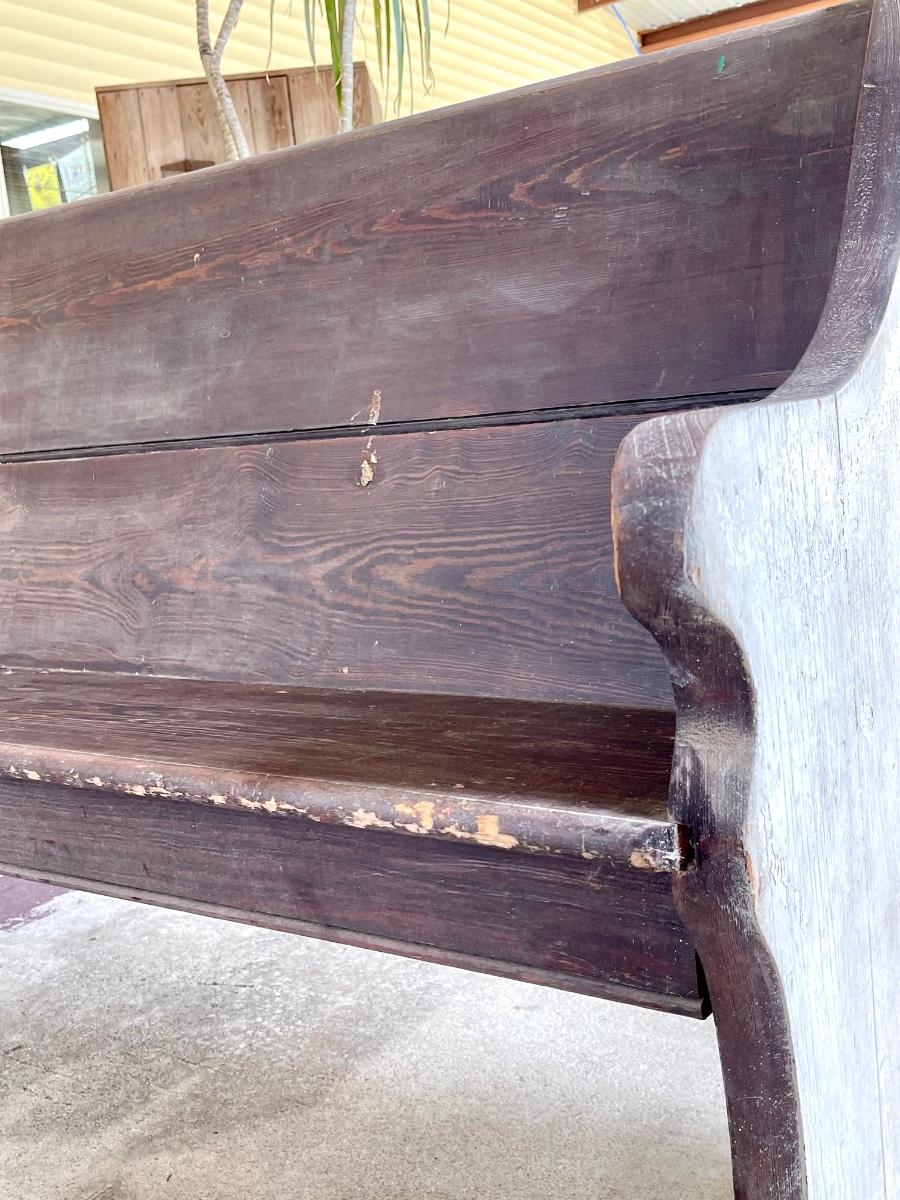 What a fantastic piece for the porch! Pew is in solid condition. It is 9 feet long. One end is painted white as pictured. There is slight wood damage on the bottom of one side as pictured. These are incredibly hard to find these days! If you have a large front porch area. This would be amazing full of mums or poinsettias! This could be such a great seasonal decor piece with plenty of room for sitting!
