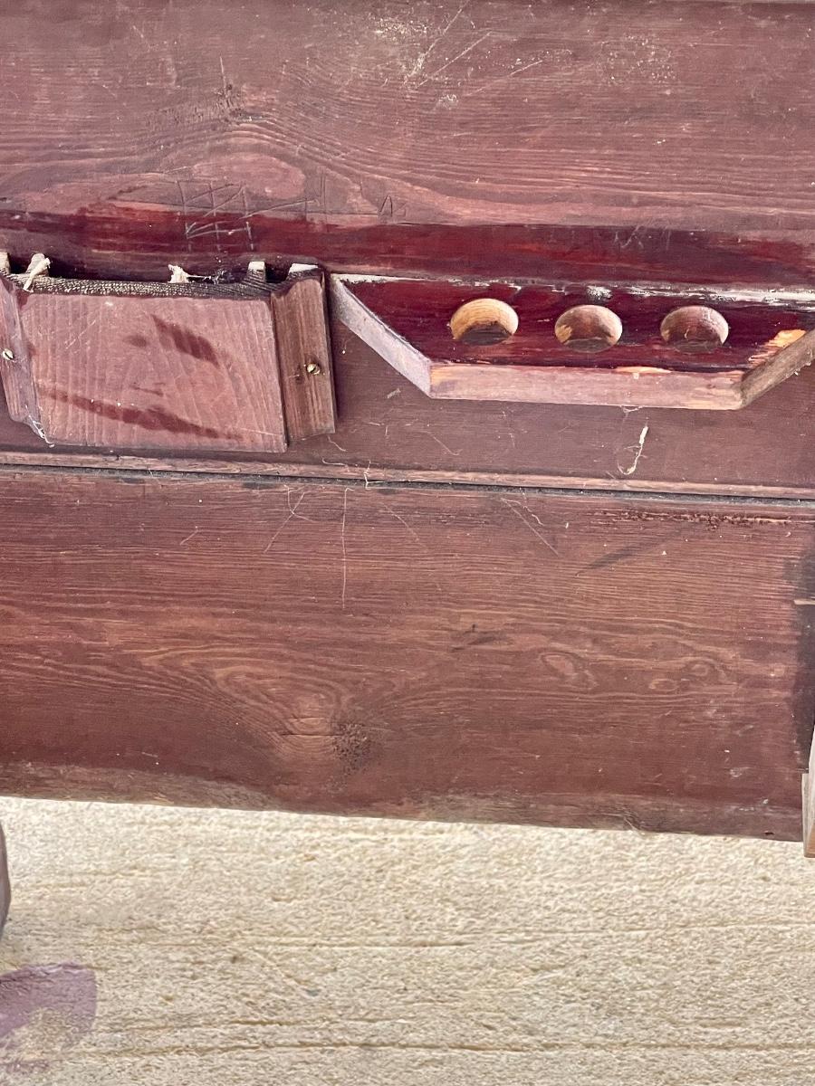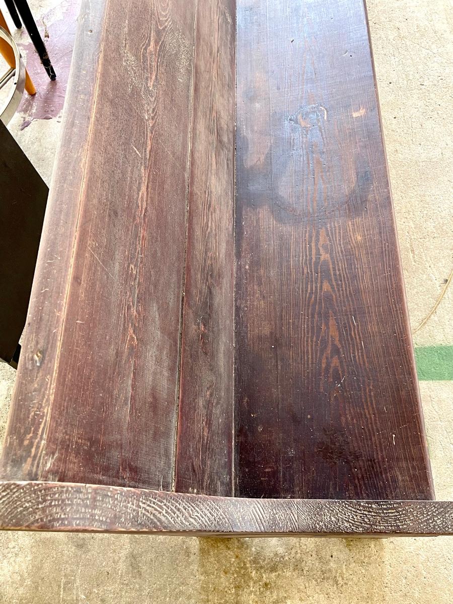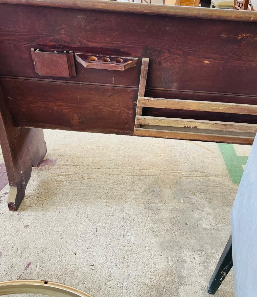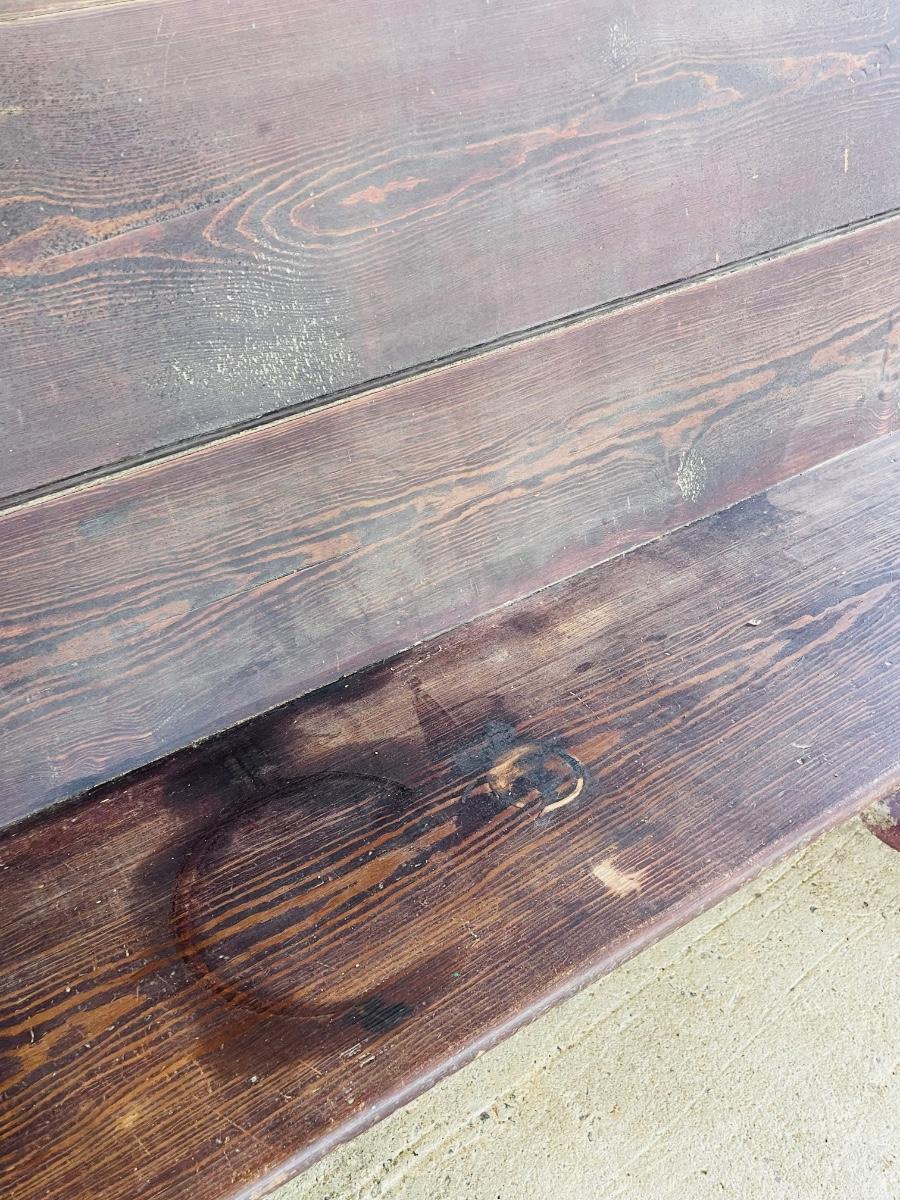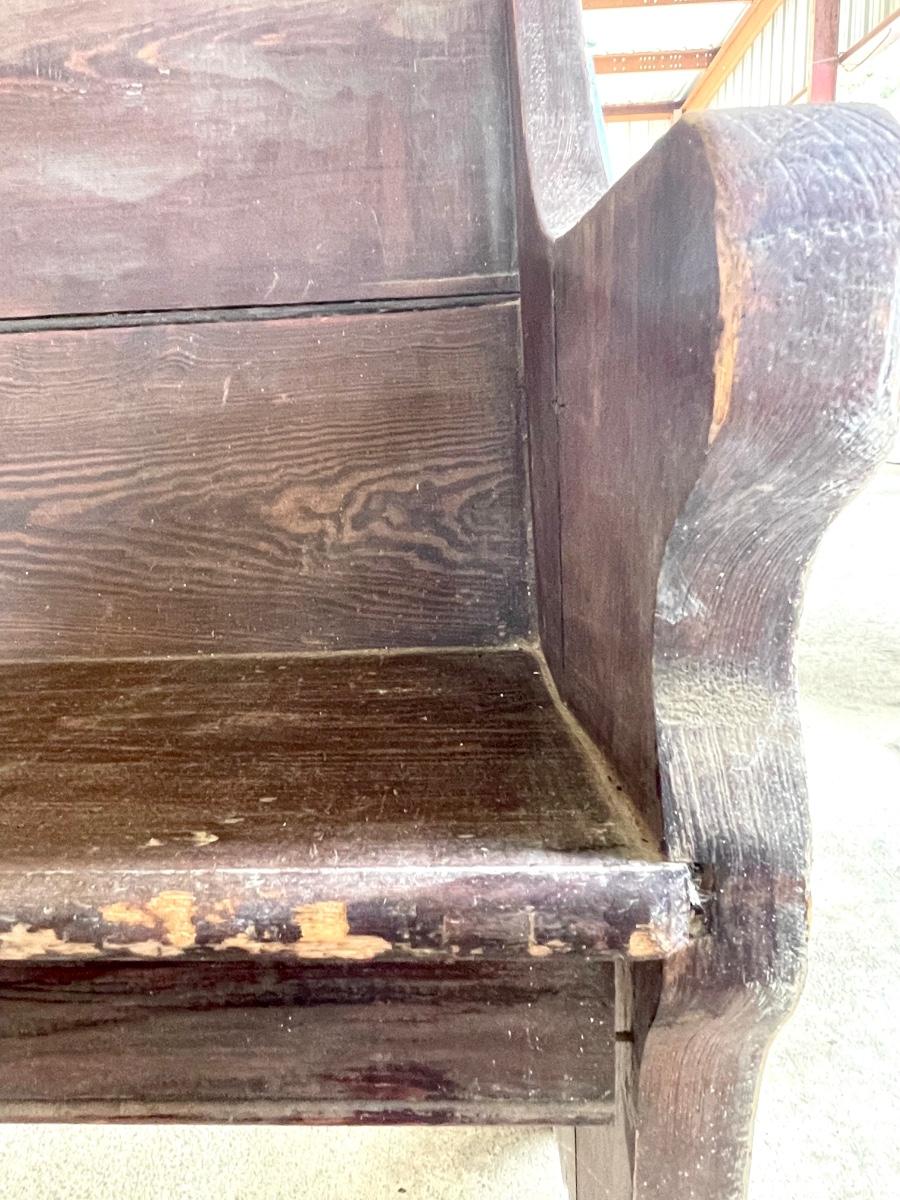 What a fantastic piece for the porch! Pew is in solid condition. It is 9 feet long. One end is painted white as pictured. There is slight wood damage on the bottom of one side as pictured. These are incredibly hard to find these days! If you have a large front porch area. This would be amazing full of mums or poinsettias! This could be such a great seasonal decor piece with plenty of room for sitting!
