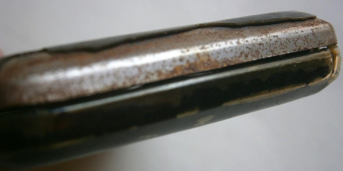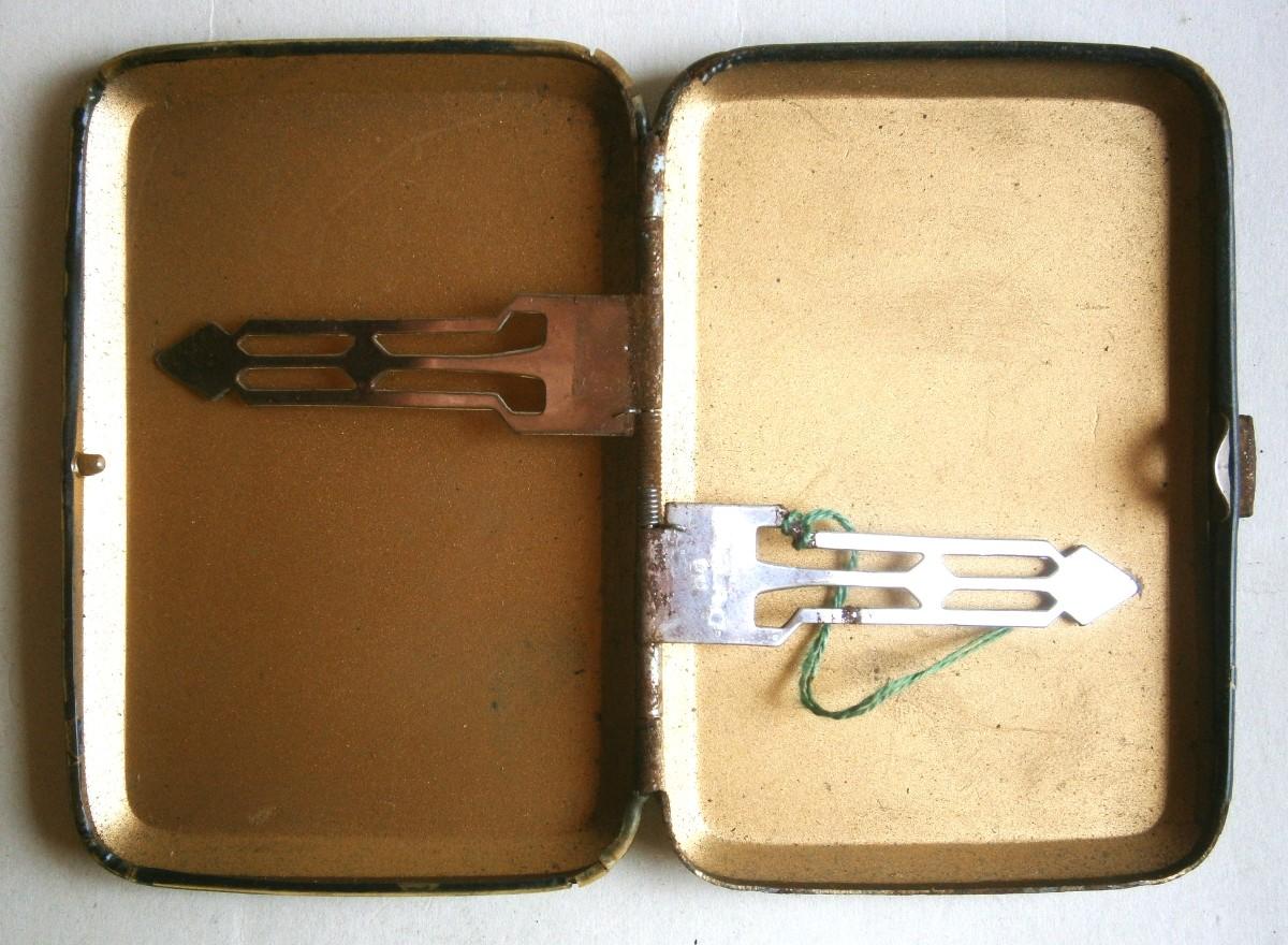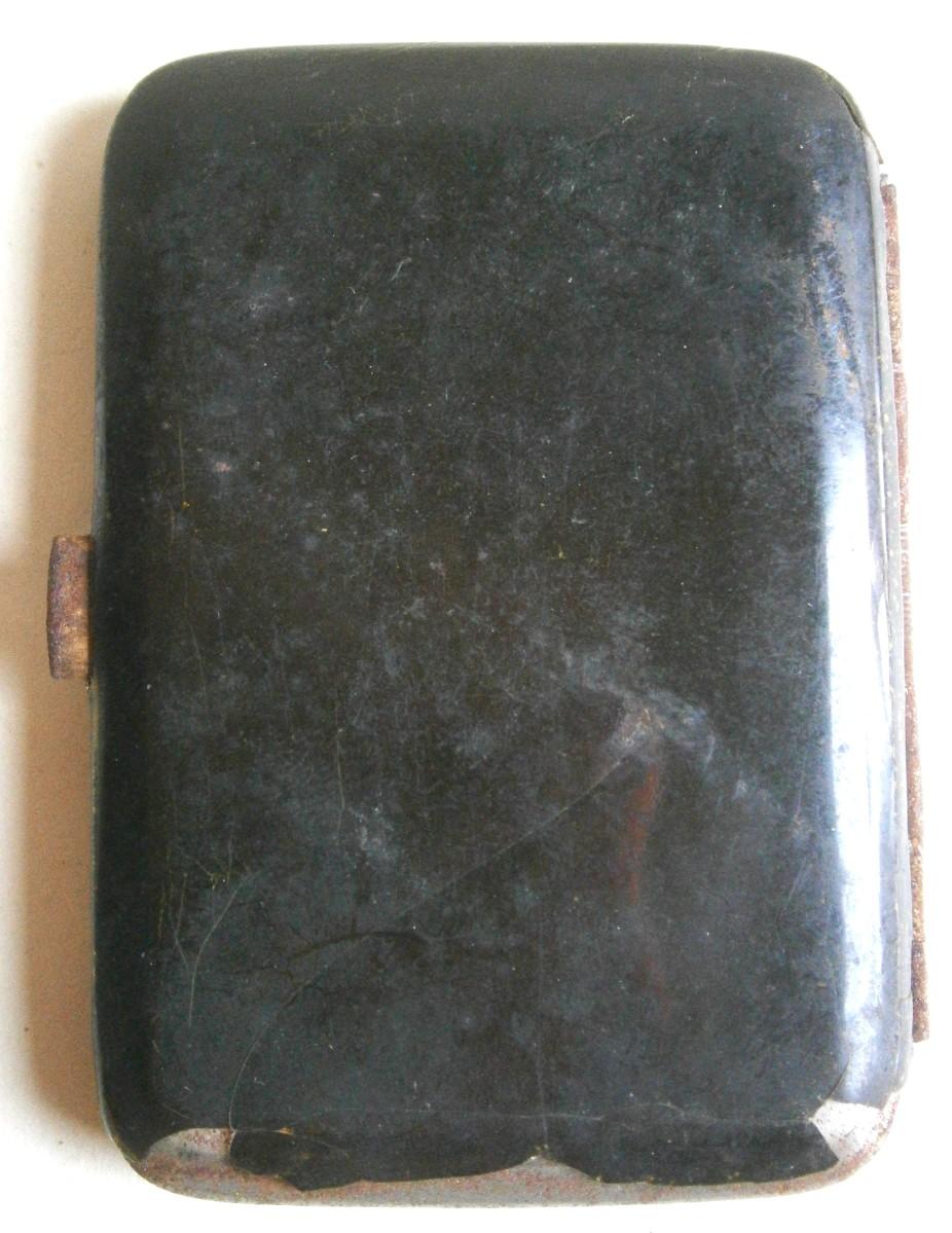 Old Cigarette Case made in Germany, 3 1/4 x 2 1/2 in., celluloid over tin, some damage to back panel.