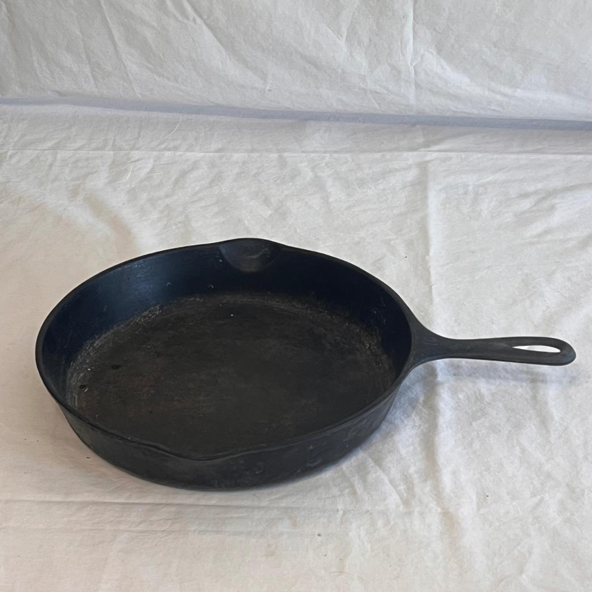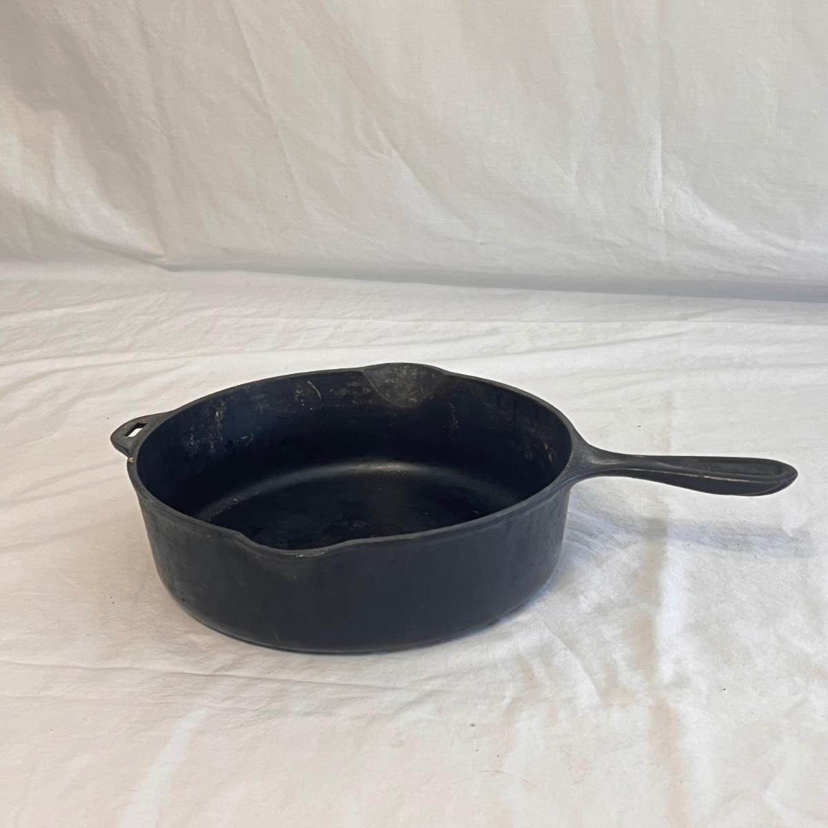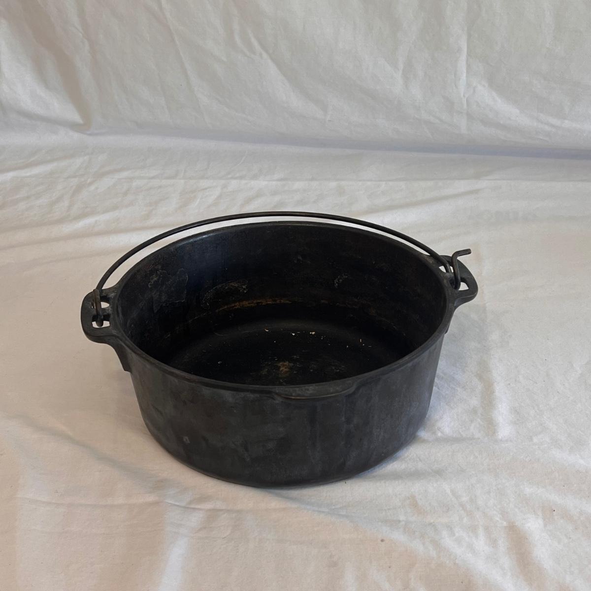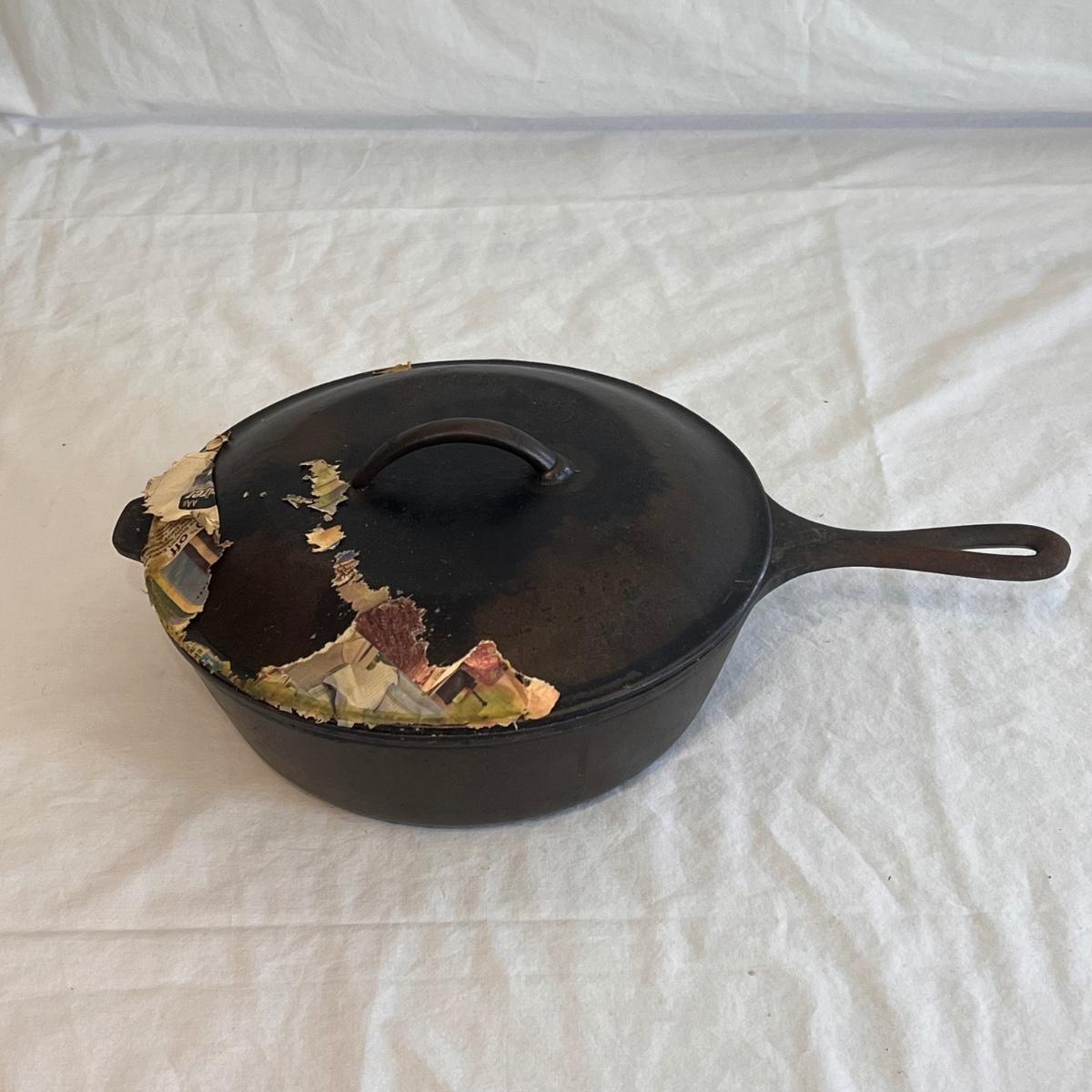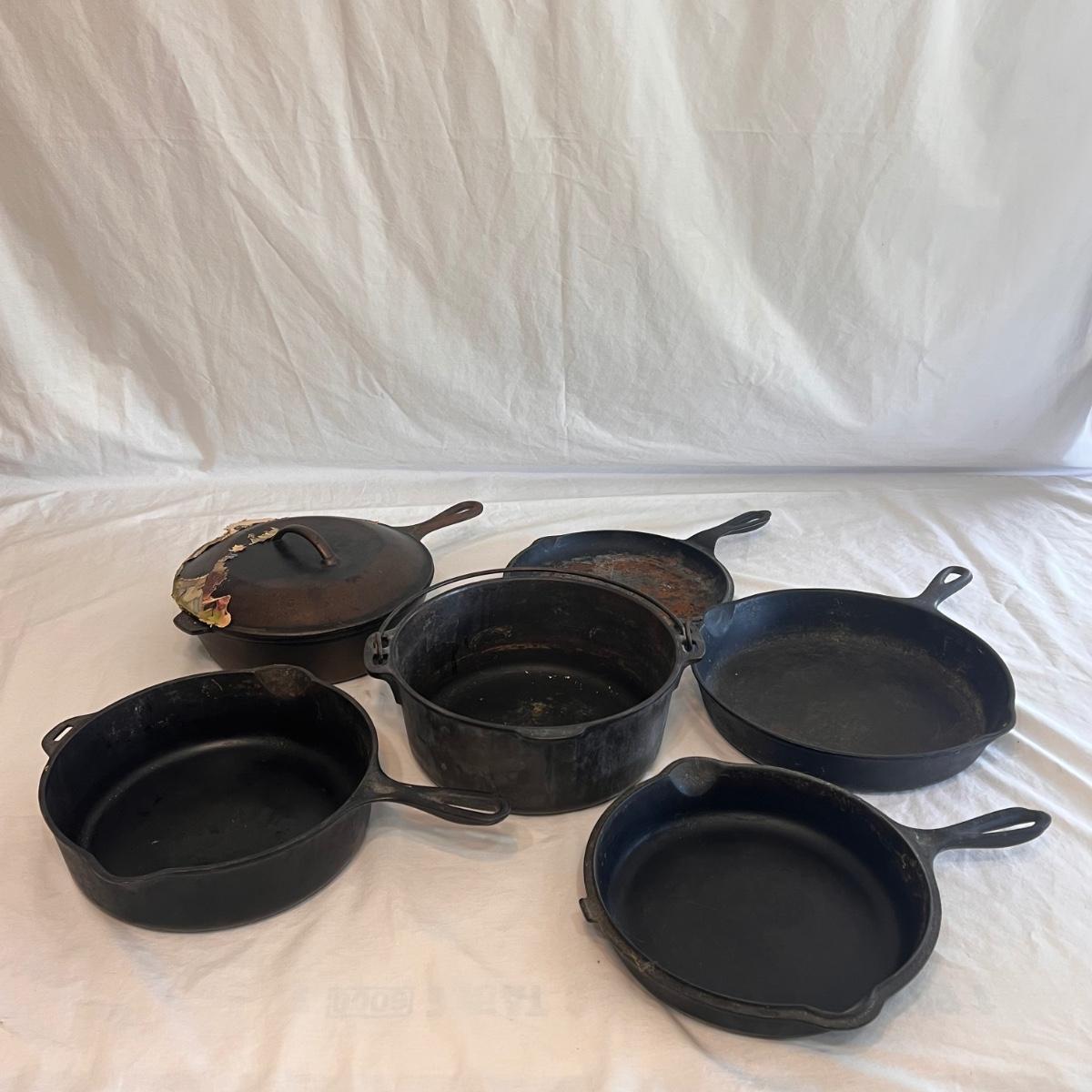 This collection includes three cast iron skillets in various sizes, Two are Wagner Ware. one large soup pot, and two deep pans (one includes a lid). The largest item measures 16” x 3”H. See photos for details. Shipping available. Shipping can be costly. We suggest contacting our preferred local shipping provider, Postage Express, with dimensions and getting an estimate before bidding: (828) 670-5501 or shipping@postageexpressnc.com