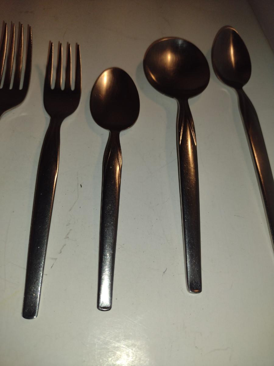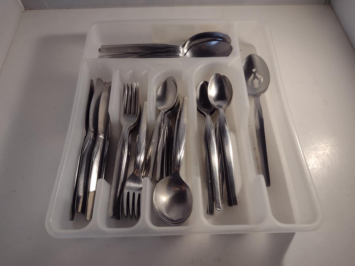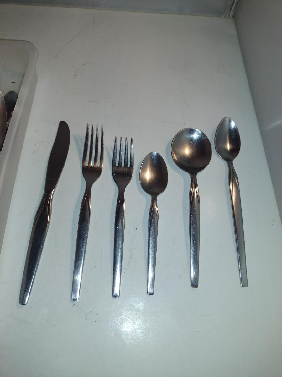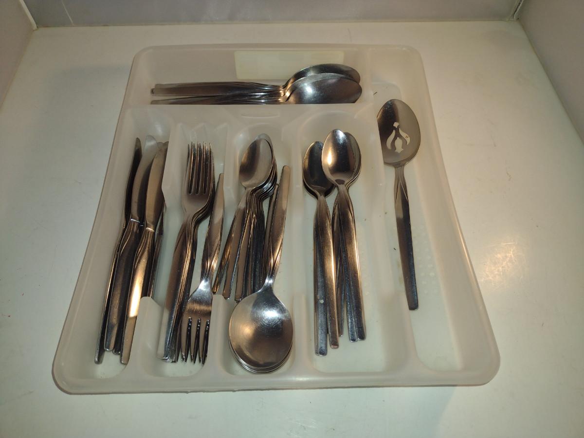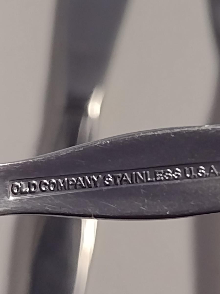 Old Company Stainless Flatware- Approx 44 Pieces. 6 each: knife, dinner fork, salad/dessert fork, regular spoon, soup spoon, long tea spoon. Slotted vegetable spoon- 2, solid vegetable spoon- 6.