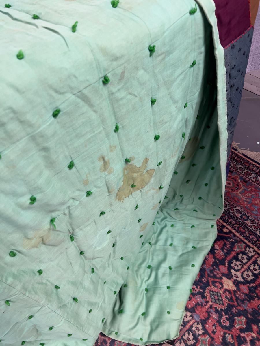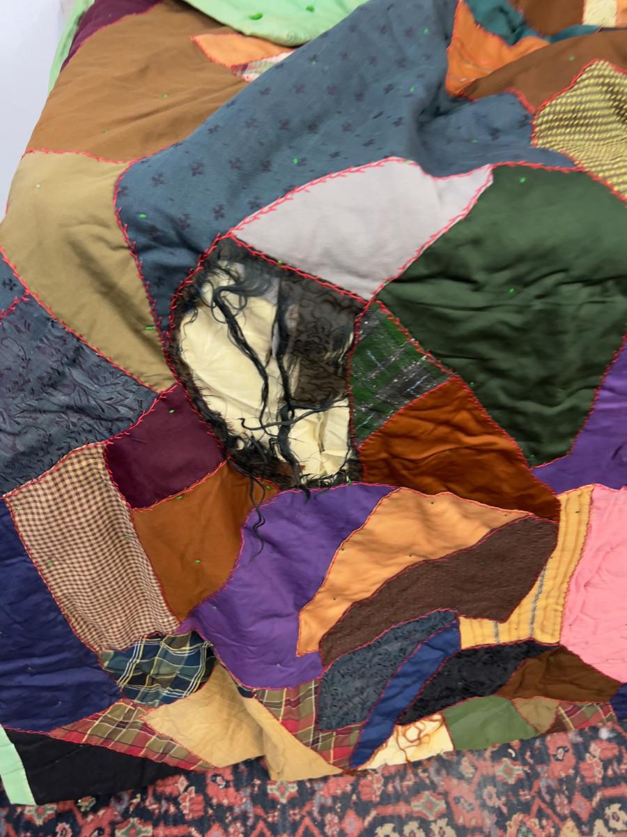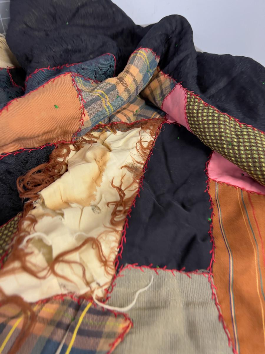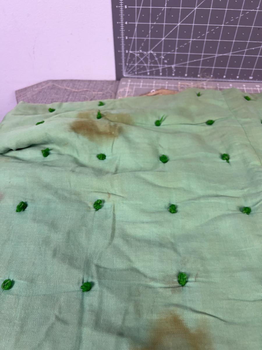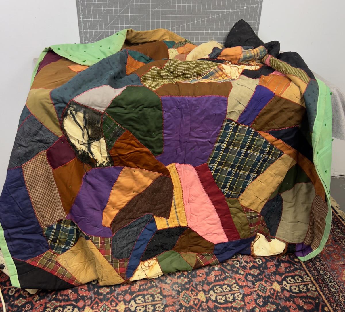 Utilitarian. Shows Wear! Measures 64" x 80" Has damage. Super Neat. Has Spots and Damage. OLD!