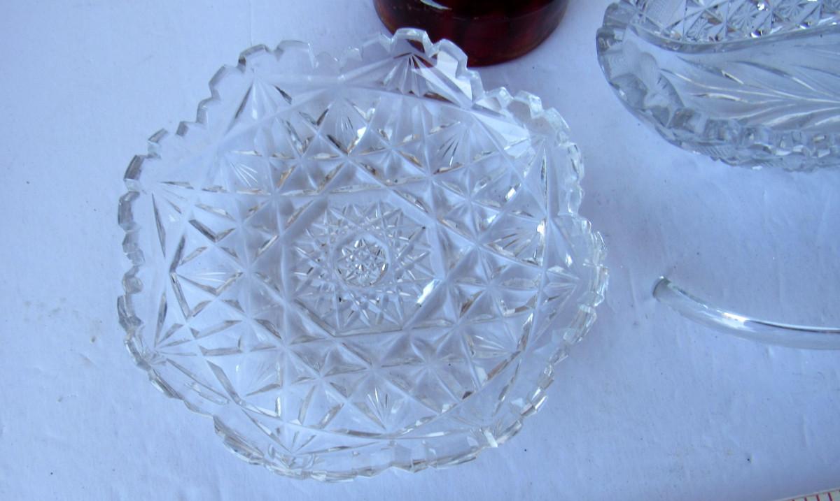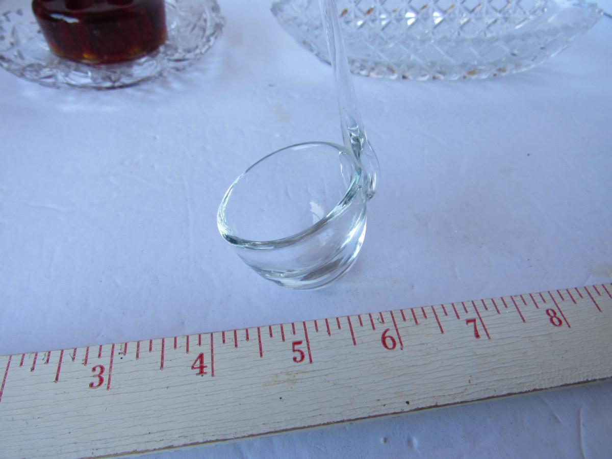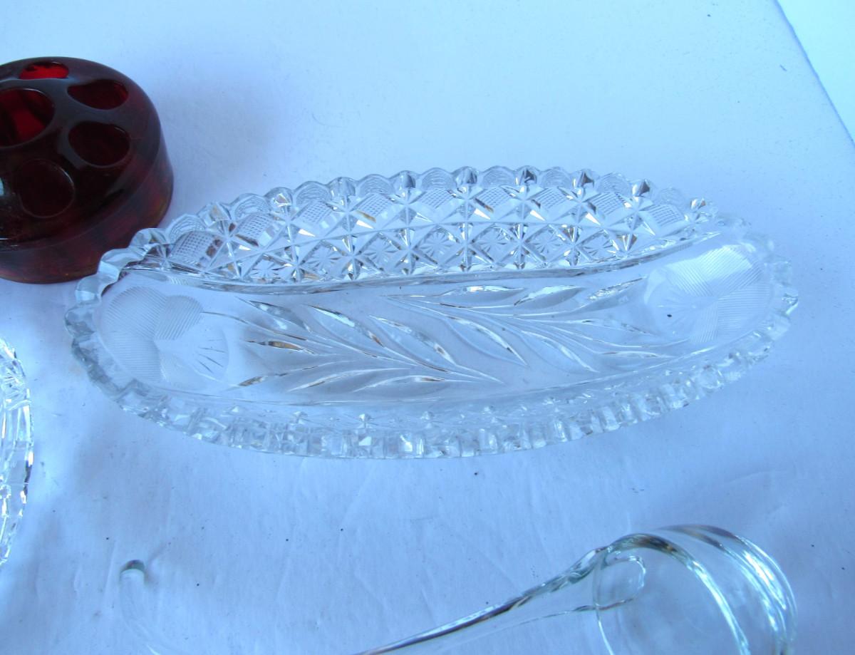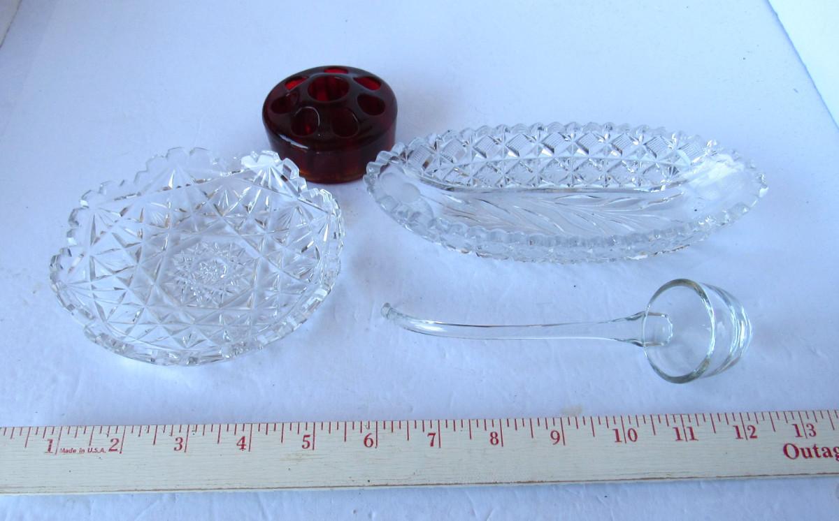 Old Cut Glass Dishes, Blown Glass Ladle and Glass Flower Frog