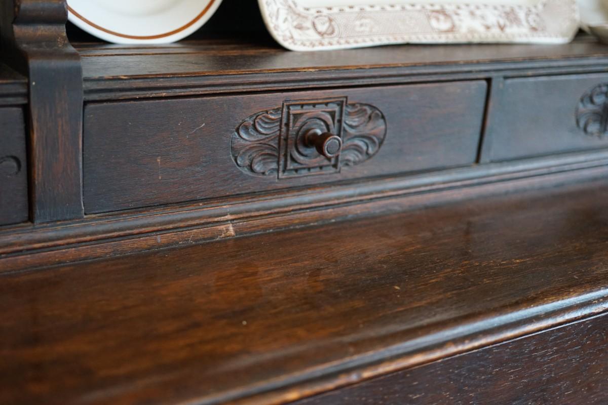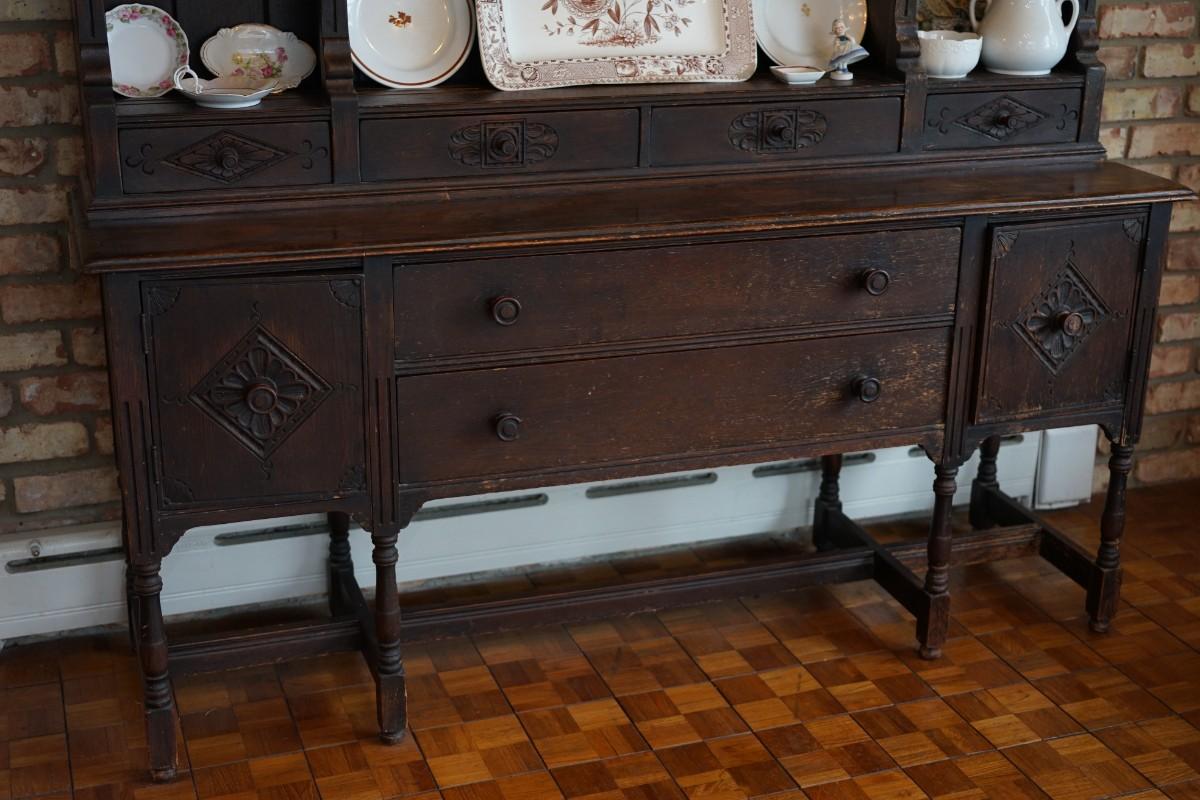 unique style step back cabinet. 1920's with decorative applied. cabinet doors and drawers.
