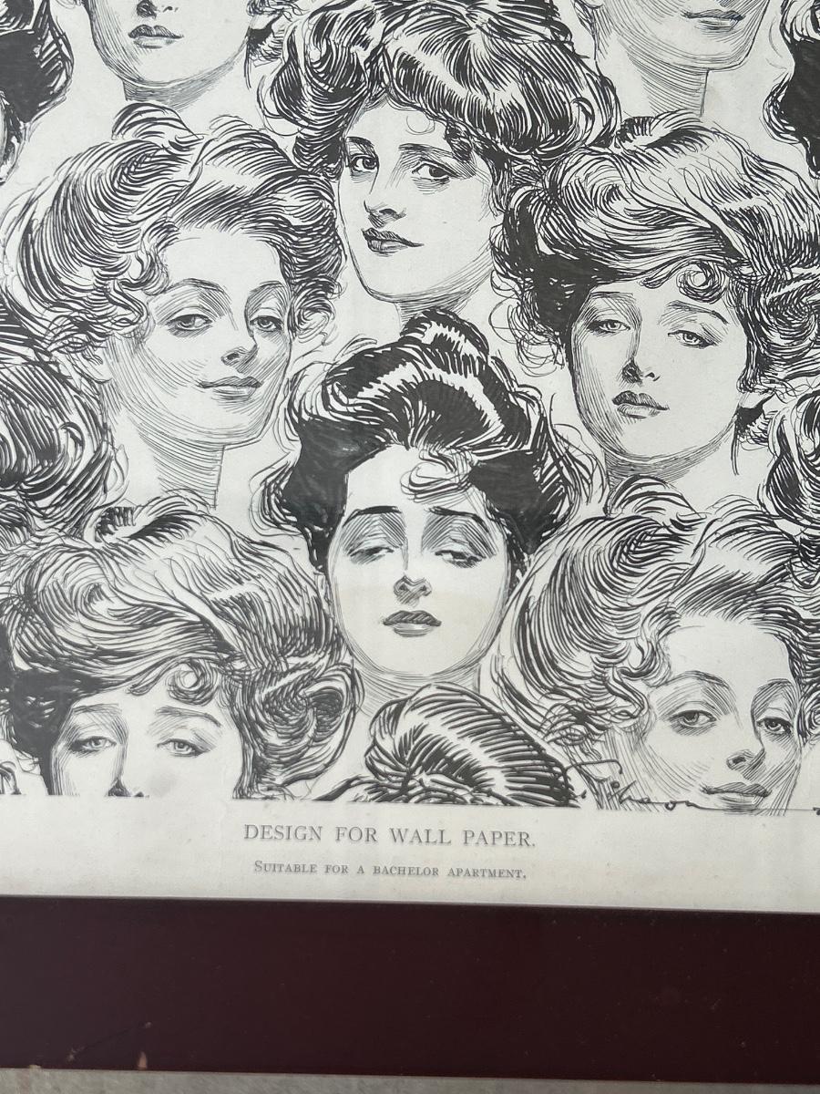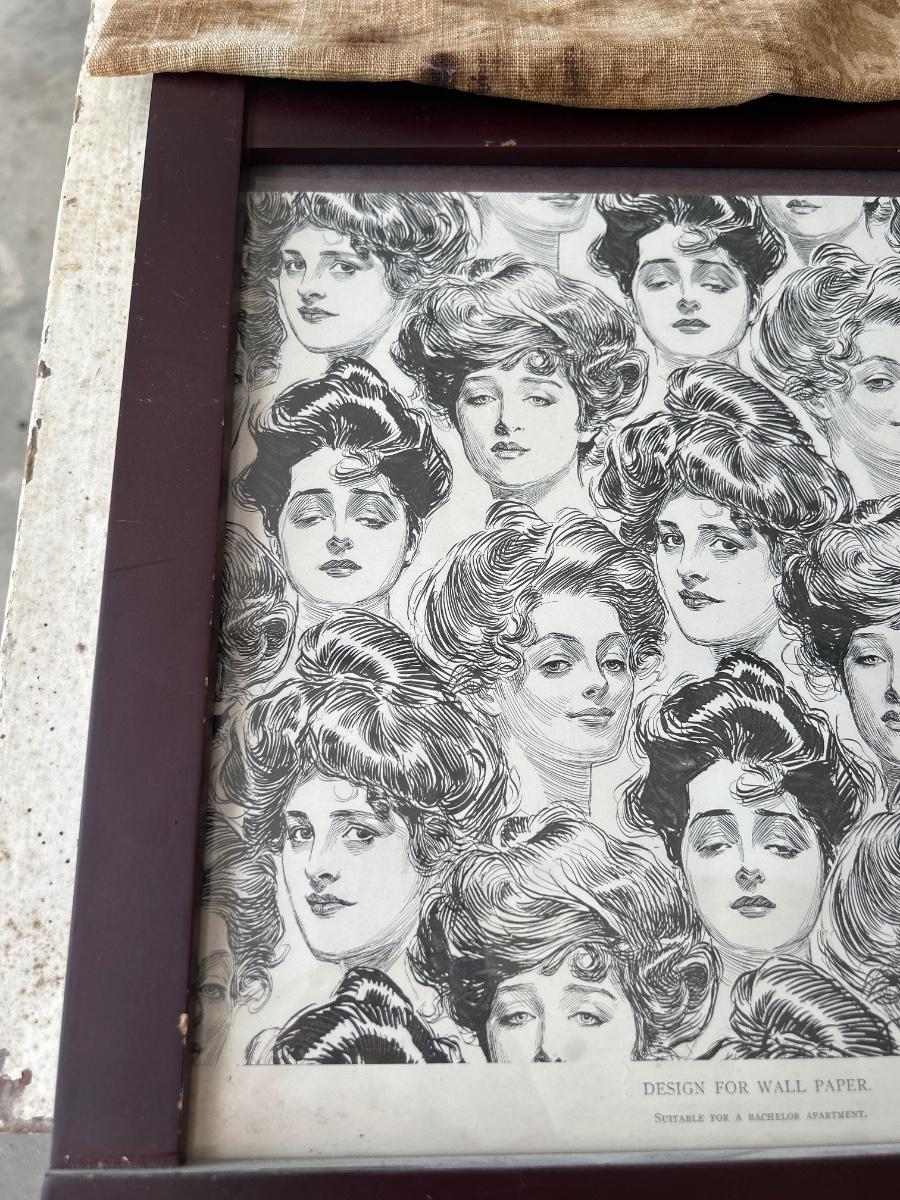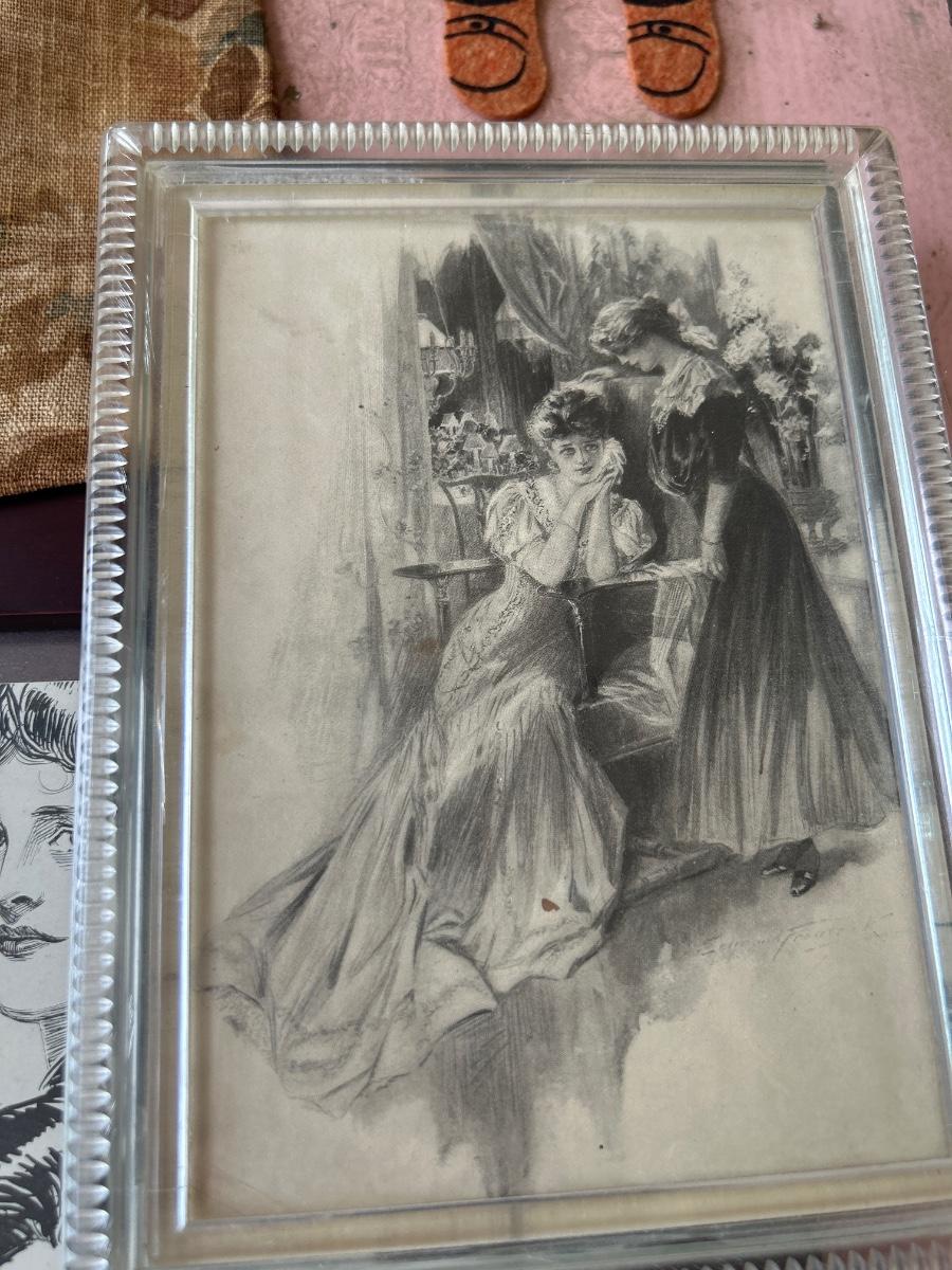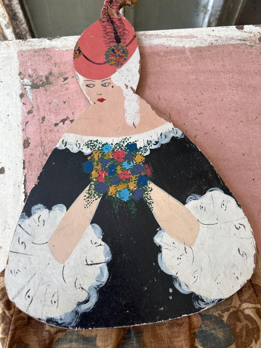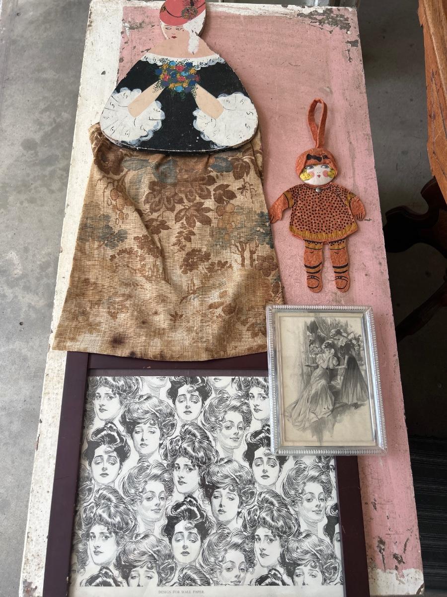2 prints, vintage wood lady & bag holder for clothes pins & felt lady