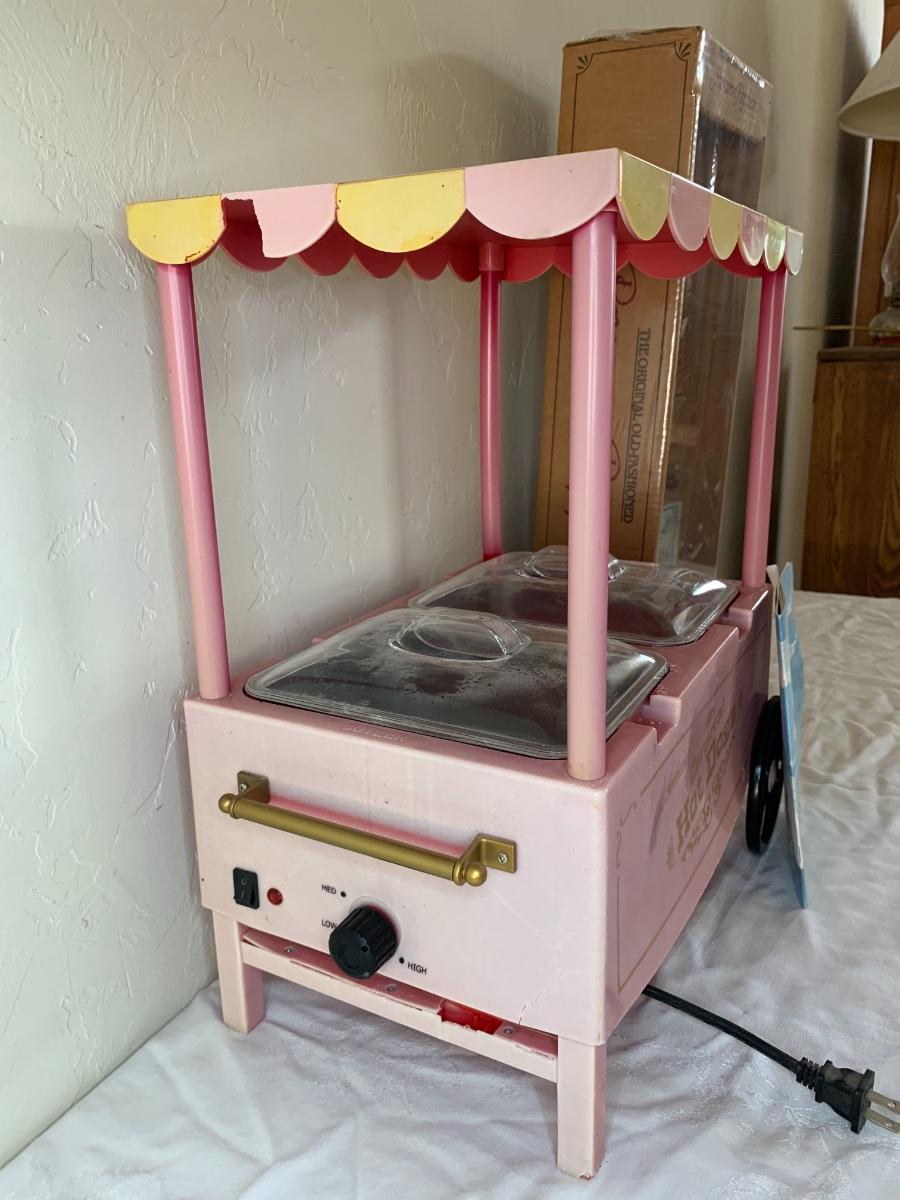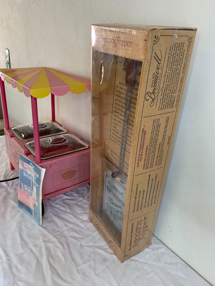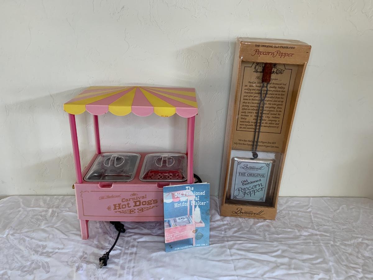 Old Fashioned hot dog maker cart (condiment tray missing) and old fashioned popcorn maker in brand new condition
