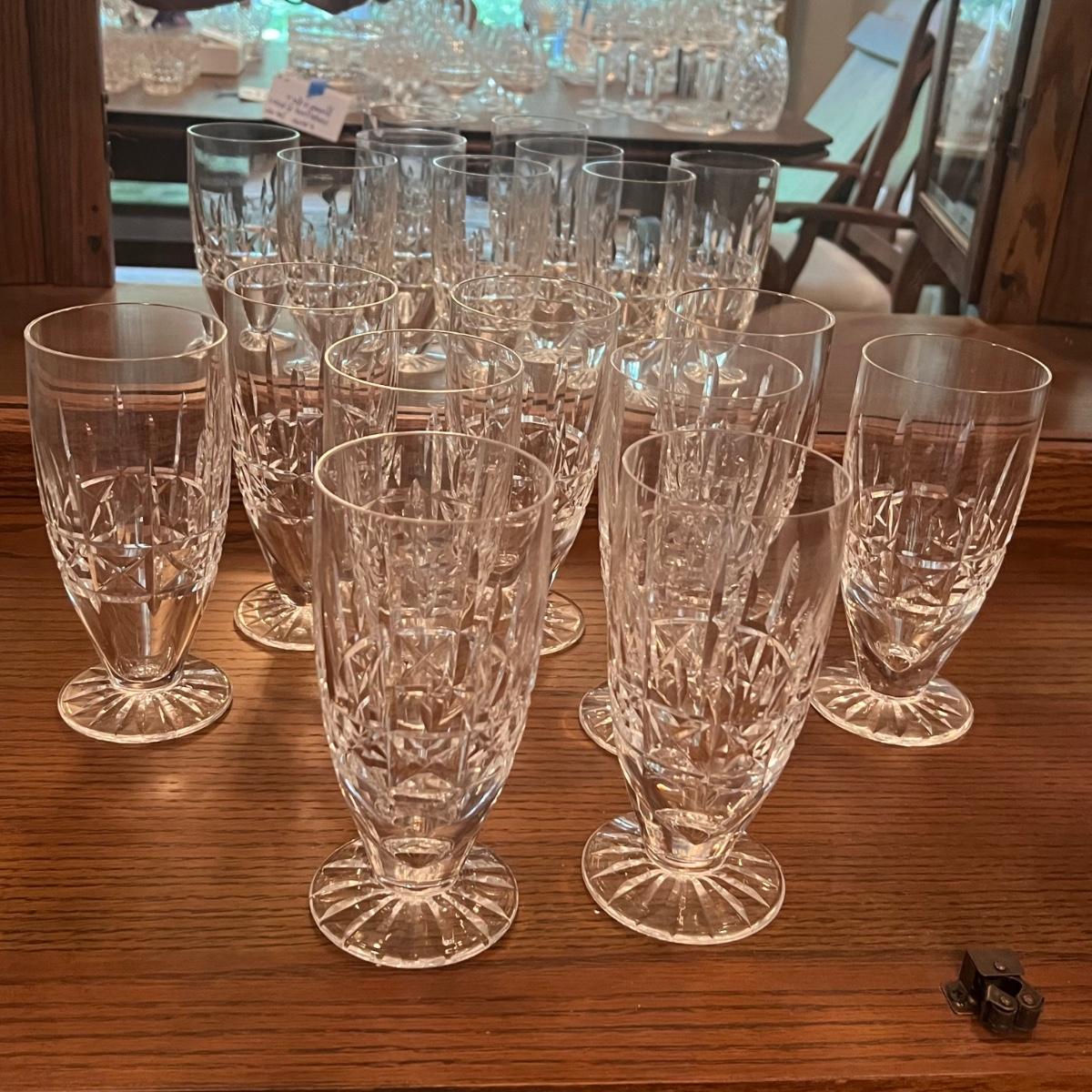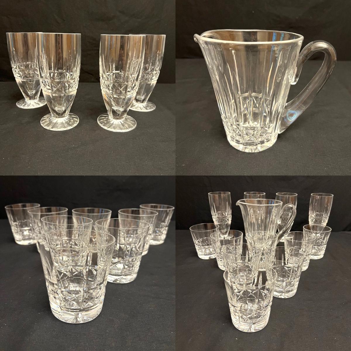 Waterford Crystal lot includes eight old fashioned tumblers, nine iced tea glasses, a pitcher plus a set of three and a set of two tumblers. They appear to be the Kylemore pattern with the exception of the set of two and set of three tumblers.