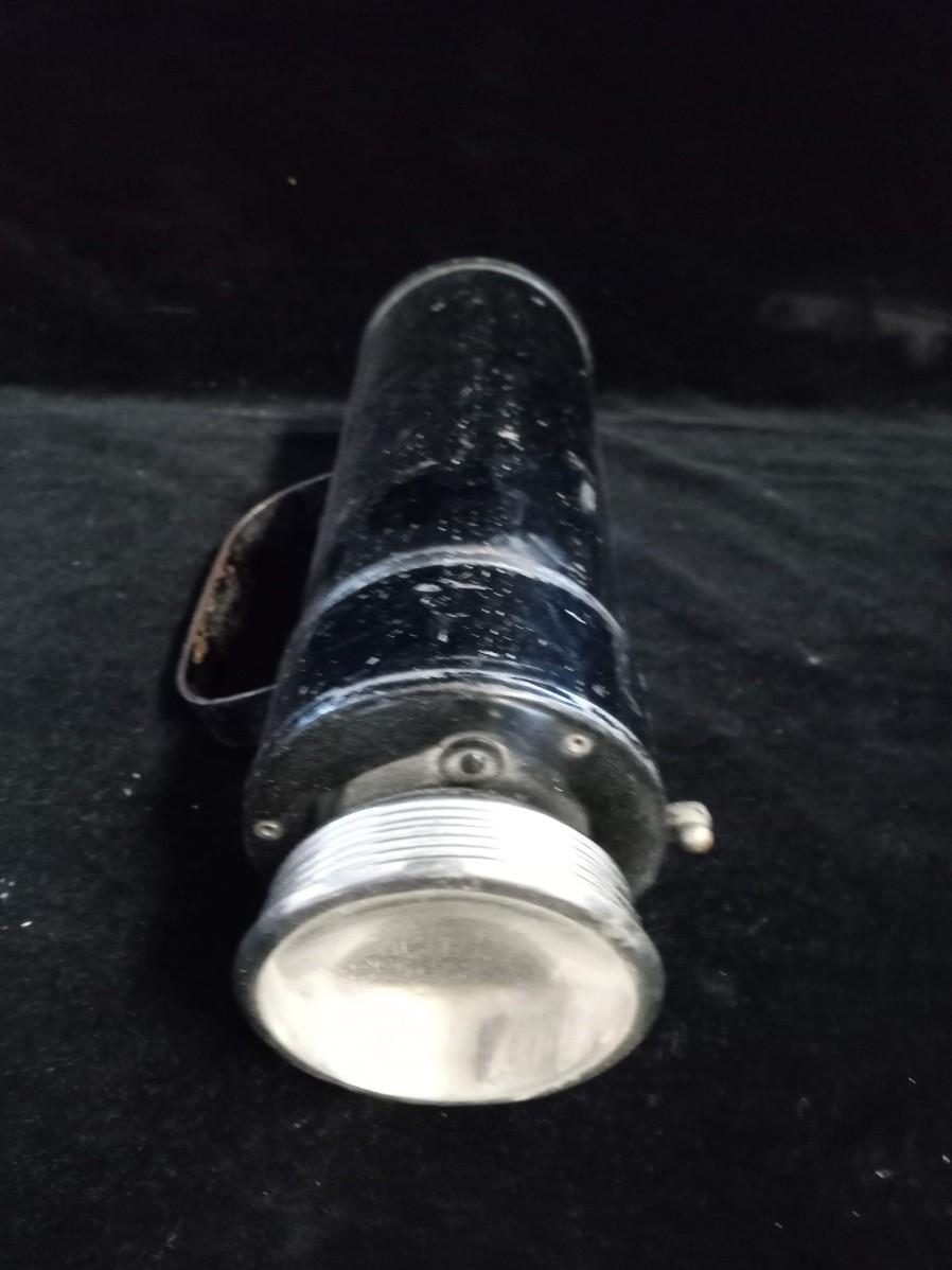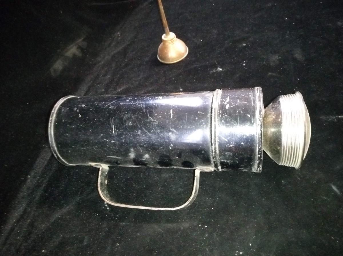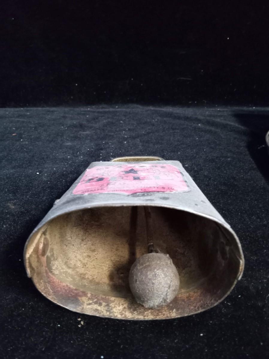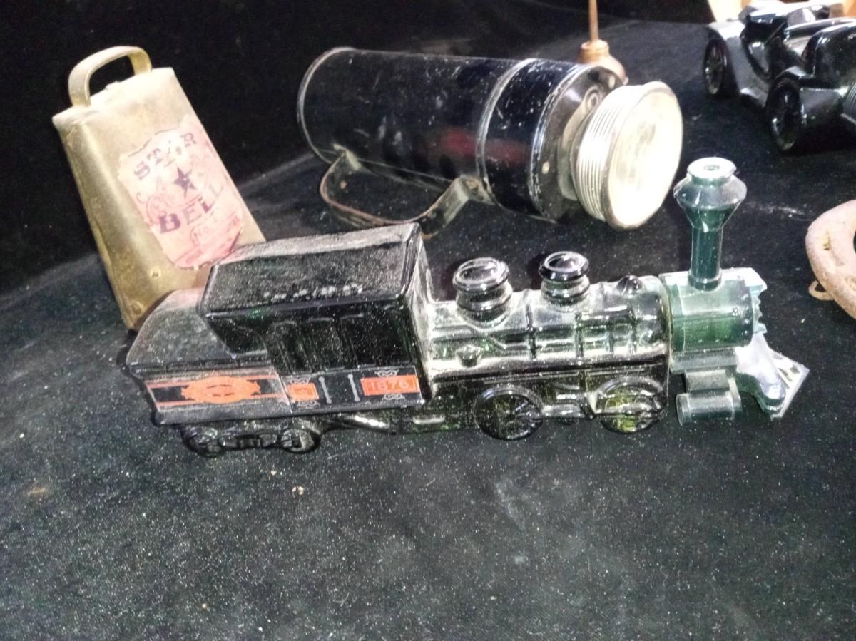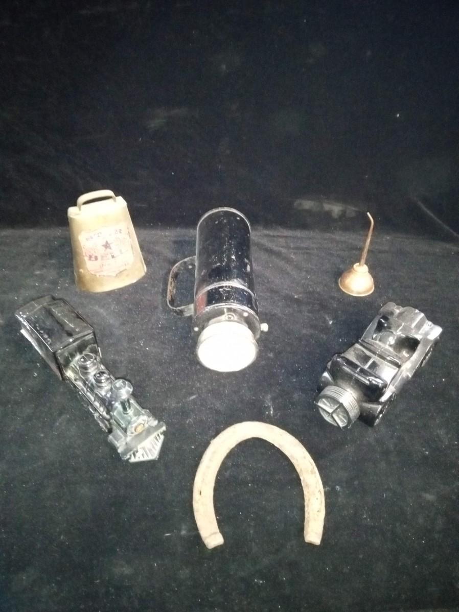 OLD FLASHLIGHT, COPPER OIL CAN, COW BELL, HORSE SHOE AND 2 AVON BOTTLES