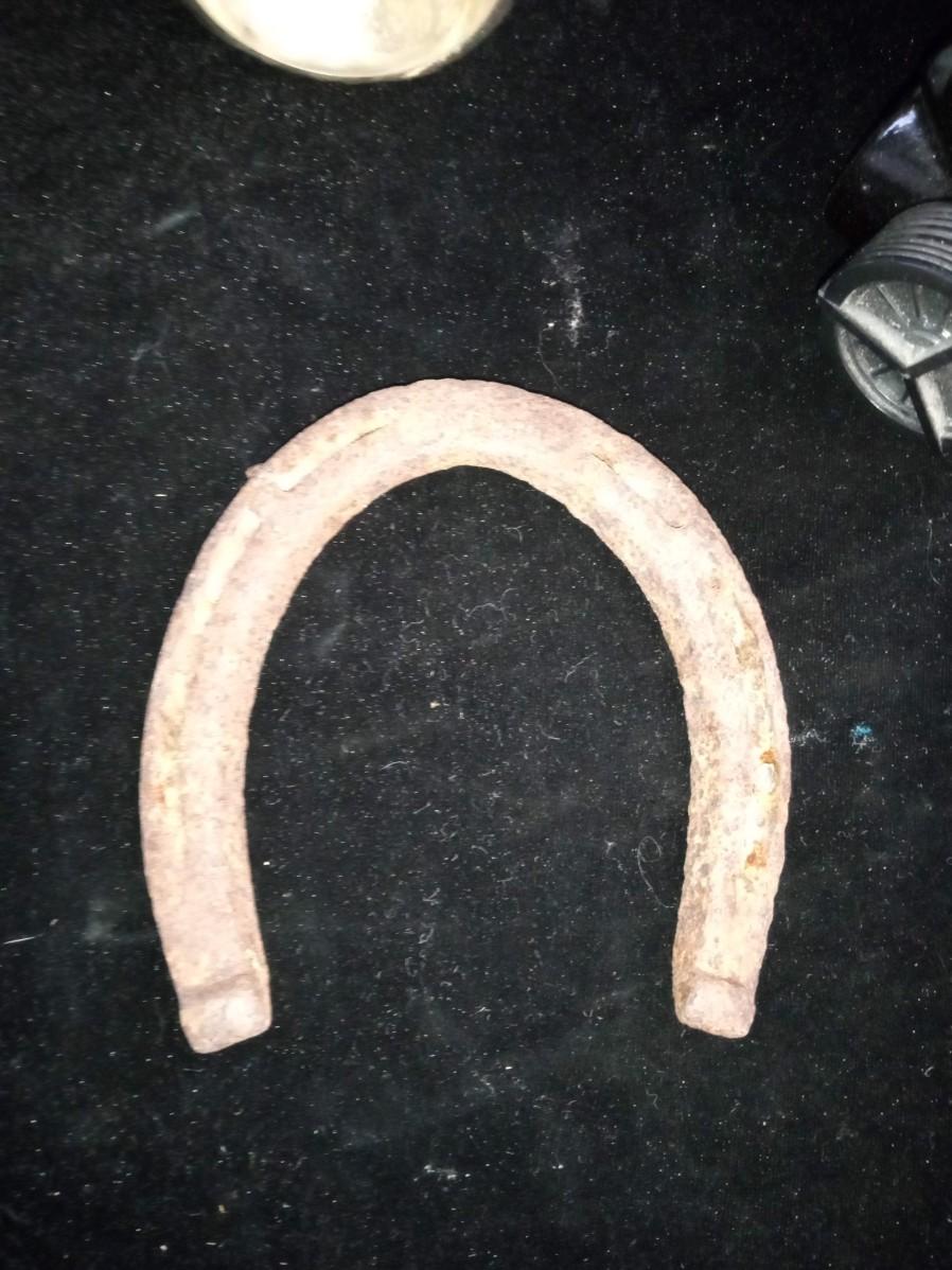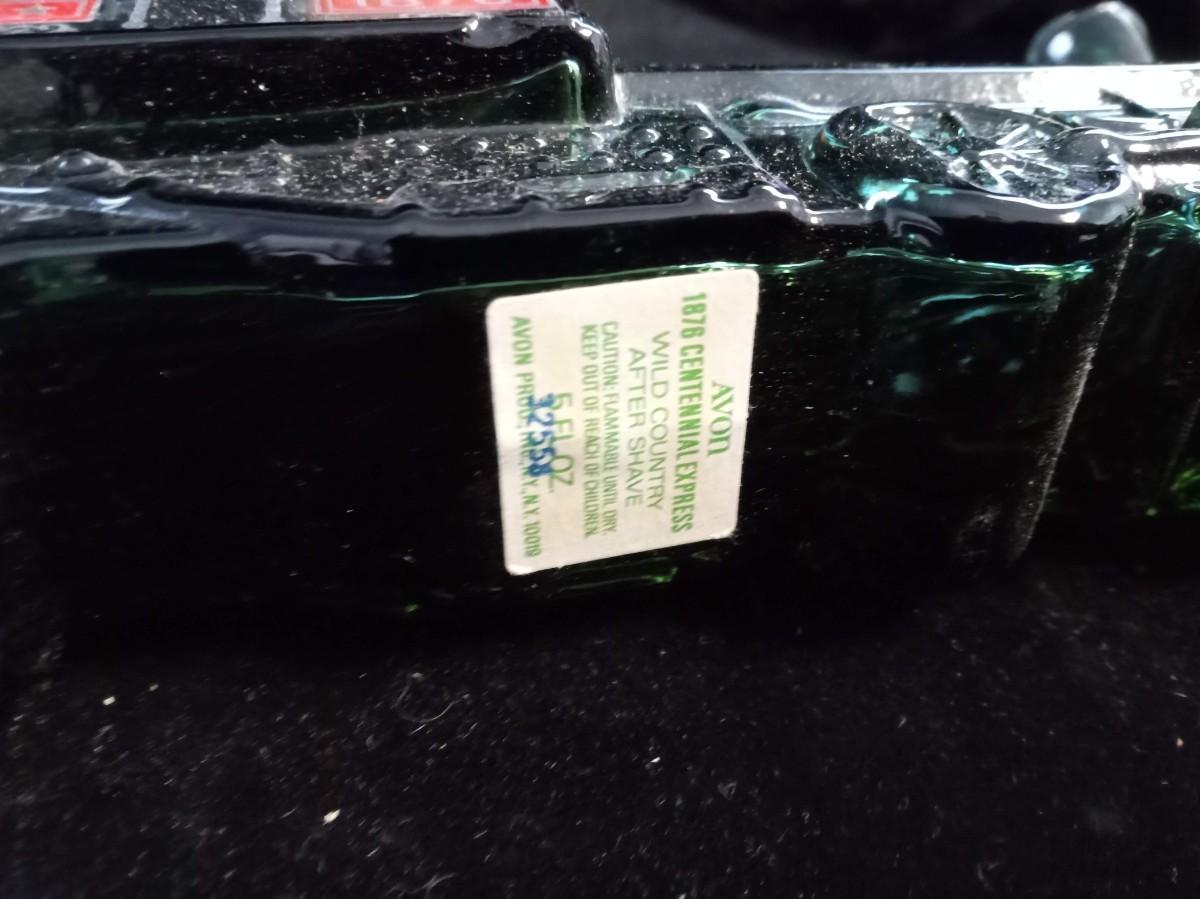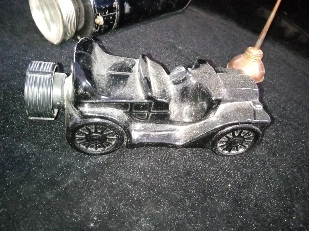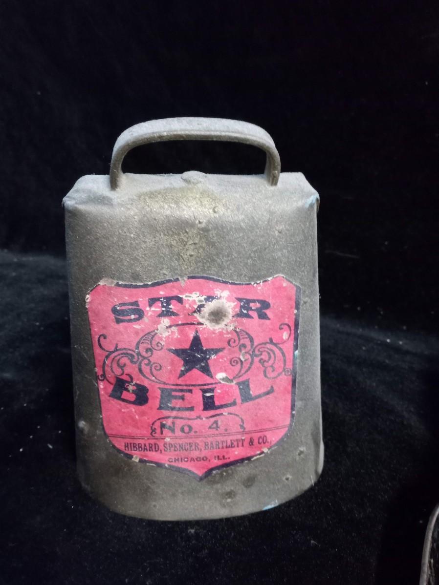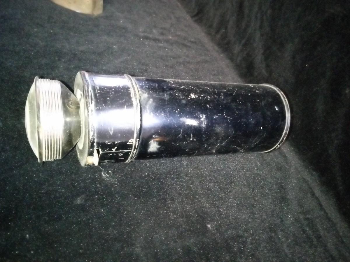 OLD FLASHLIGHT, COPPER OIL CAN, COW BELL, HORSE SHOE AND 2 AVON BOTTLES